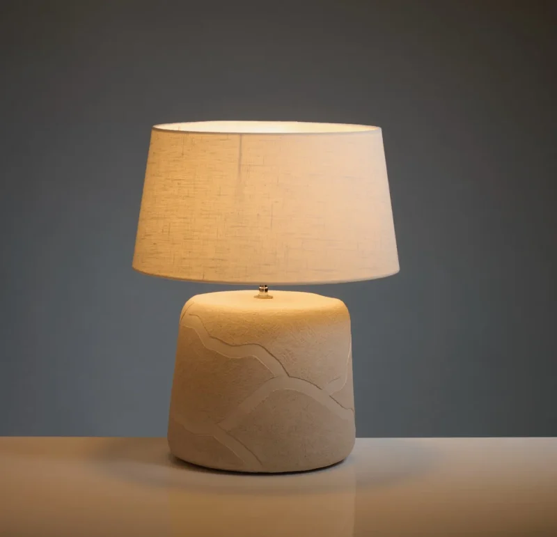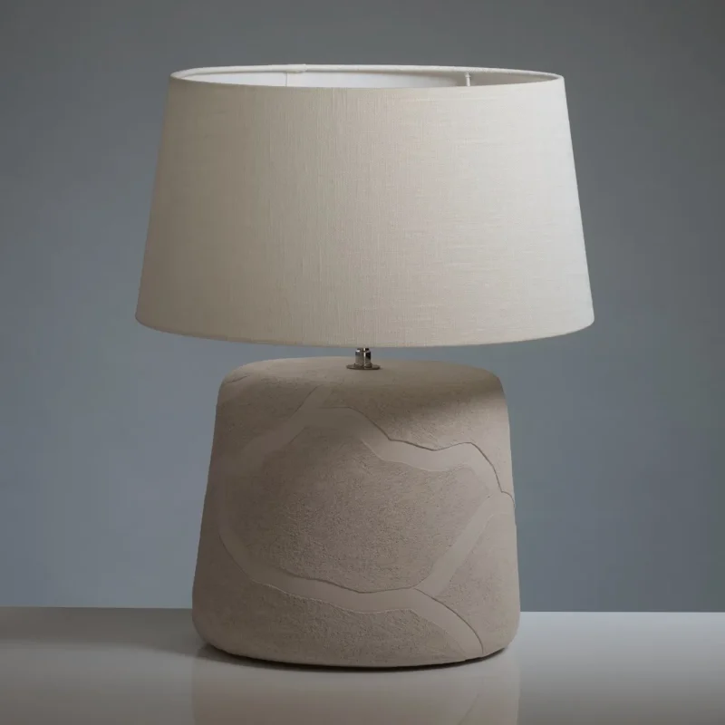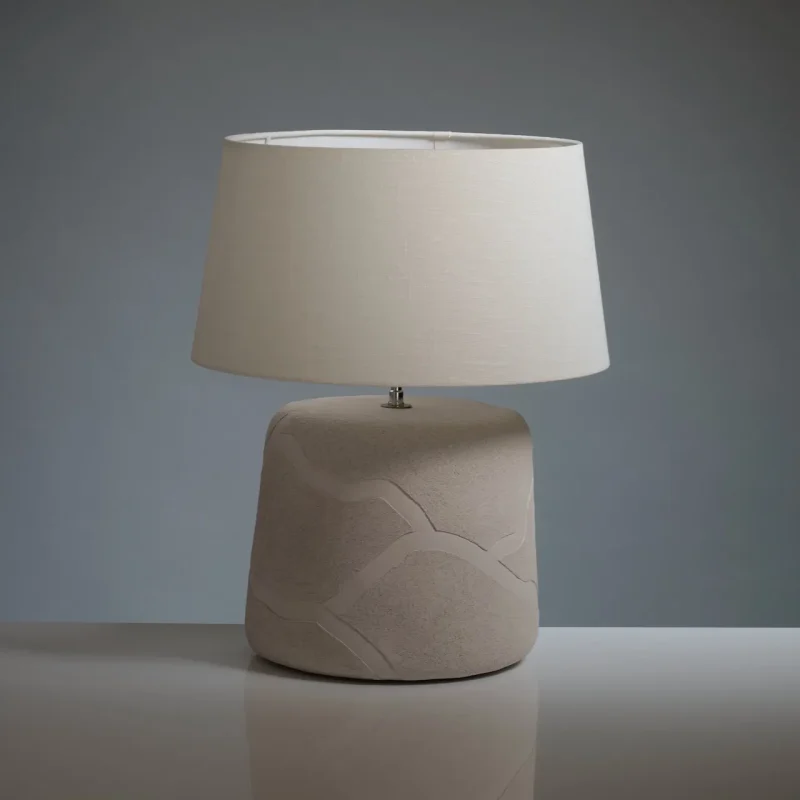 This beautifully crafted ceramic table lamp combines organic textures with a refined, modern aesthetic. The gently rounded base features a unique, hand-carved pattern reminiscent of natural landscapes, adding depth and character to the piece. Made from high-quality stoneware with a subtle, textured finish, it pairs perfectly with a soft linen lampshade, providing a warm and comfortable light. Ideal for interior designers and collectors seeking a statement lighting piece that blends contemporary and artisanal influences.