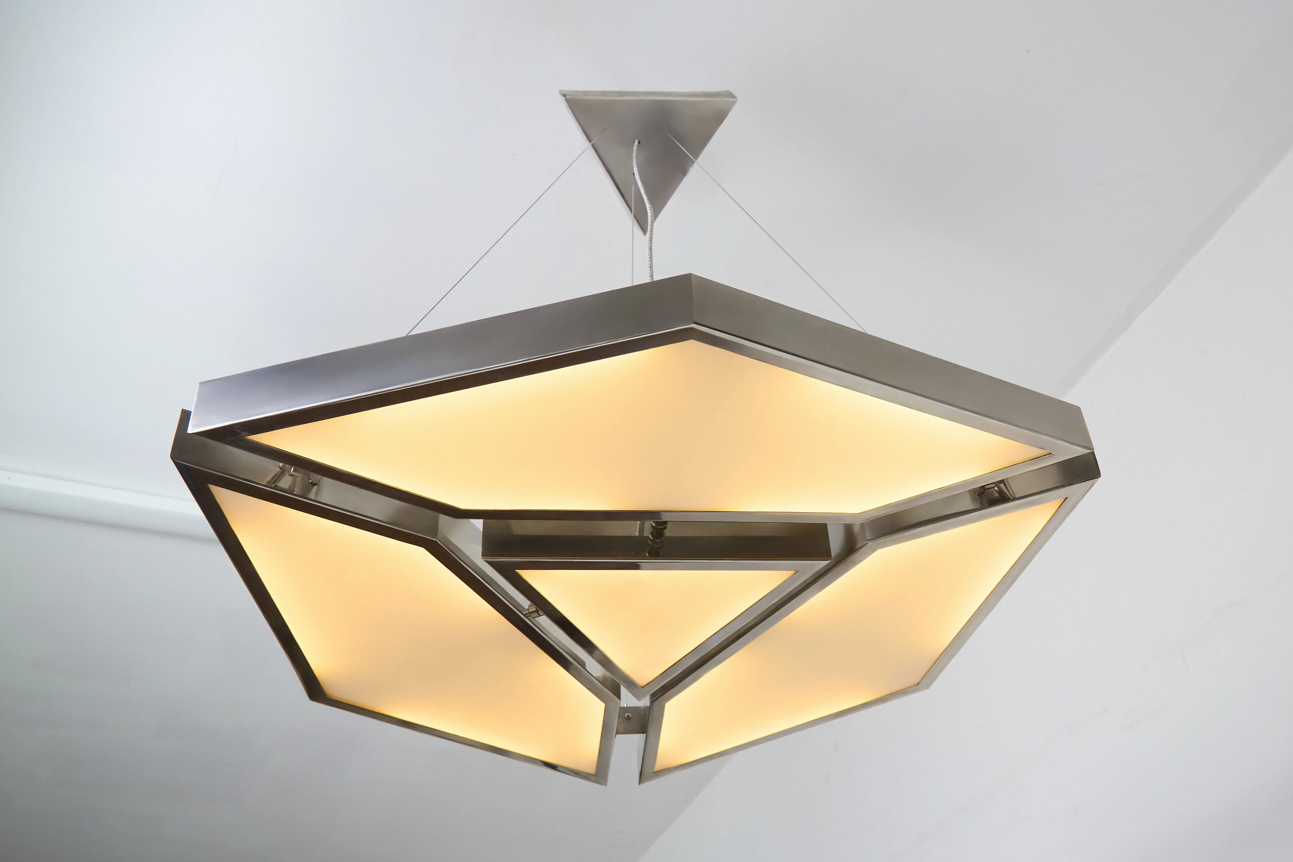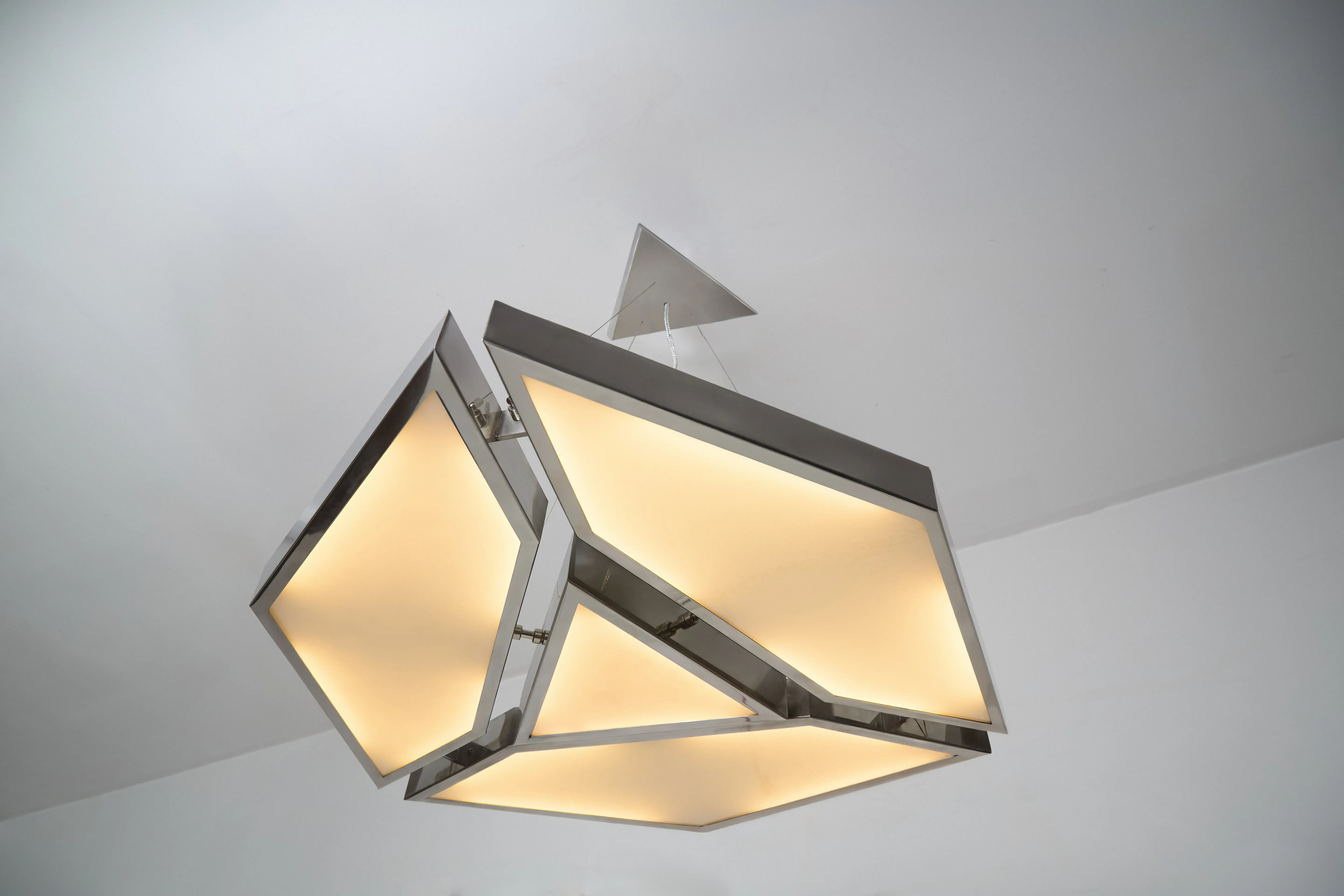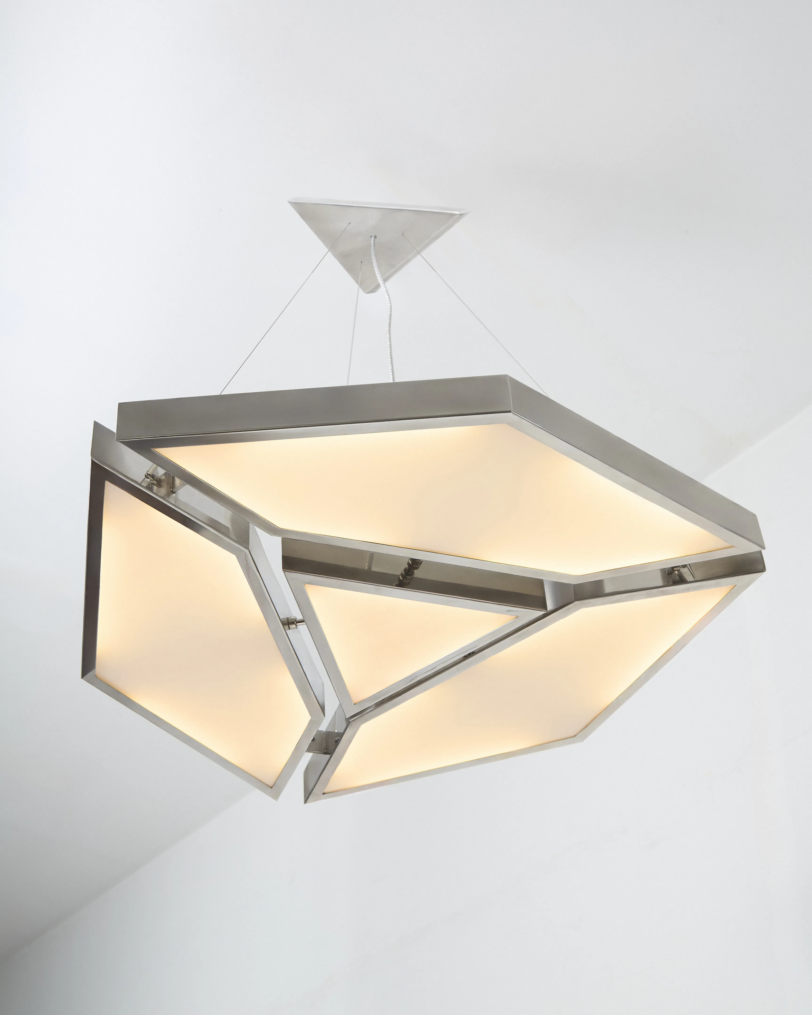 The Alban Pendant Light is a geometric pendant crafted from polished stainless steel and flat white glass, designed to evenly diffuse light while emphasizing clarity of form and material. Its faceted silhouette creates a soft, ambient glow with a strong architectural presence, allowing the fixture to function as both illumination and object. Balanced between precision and warmth.