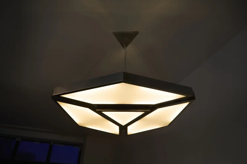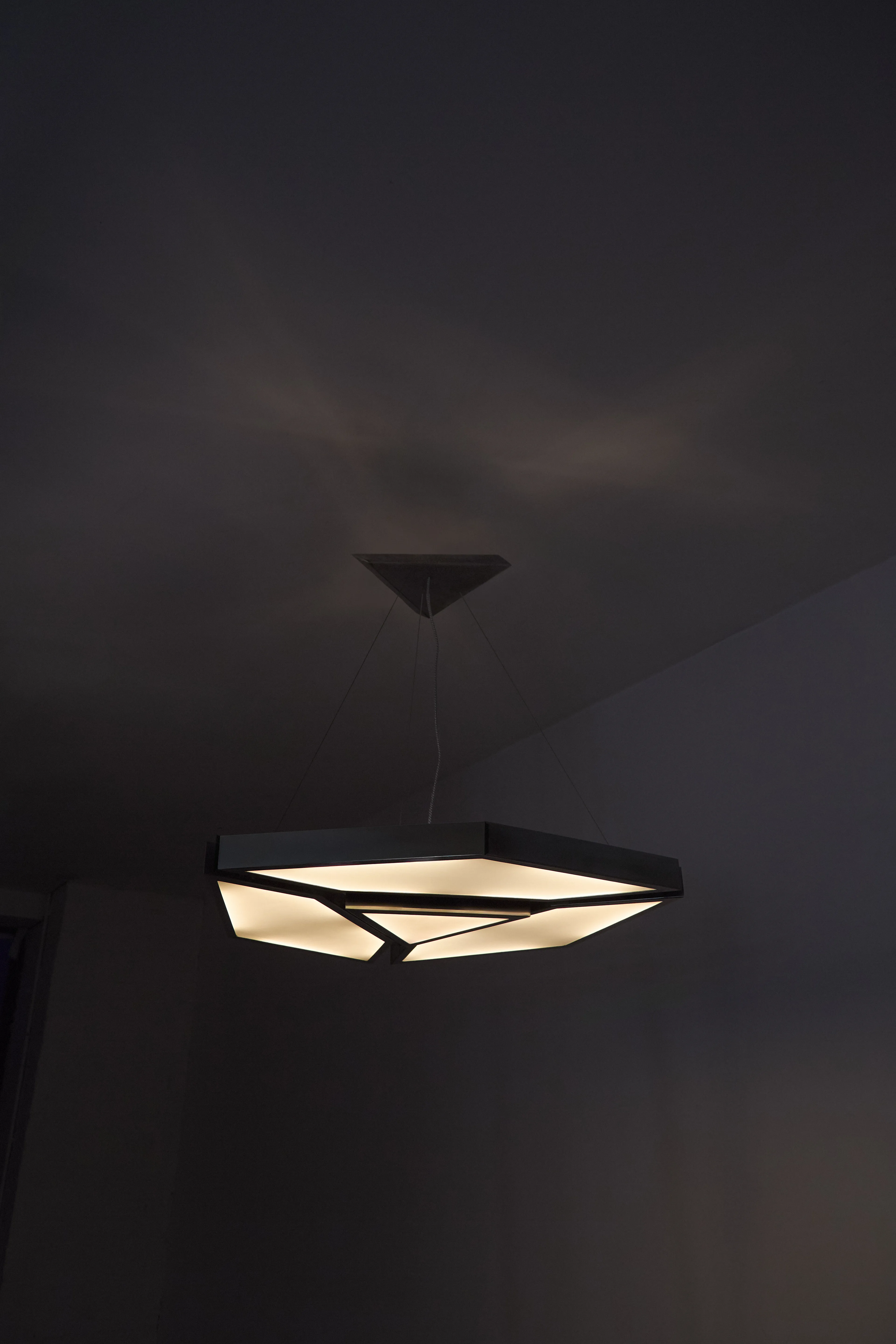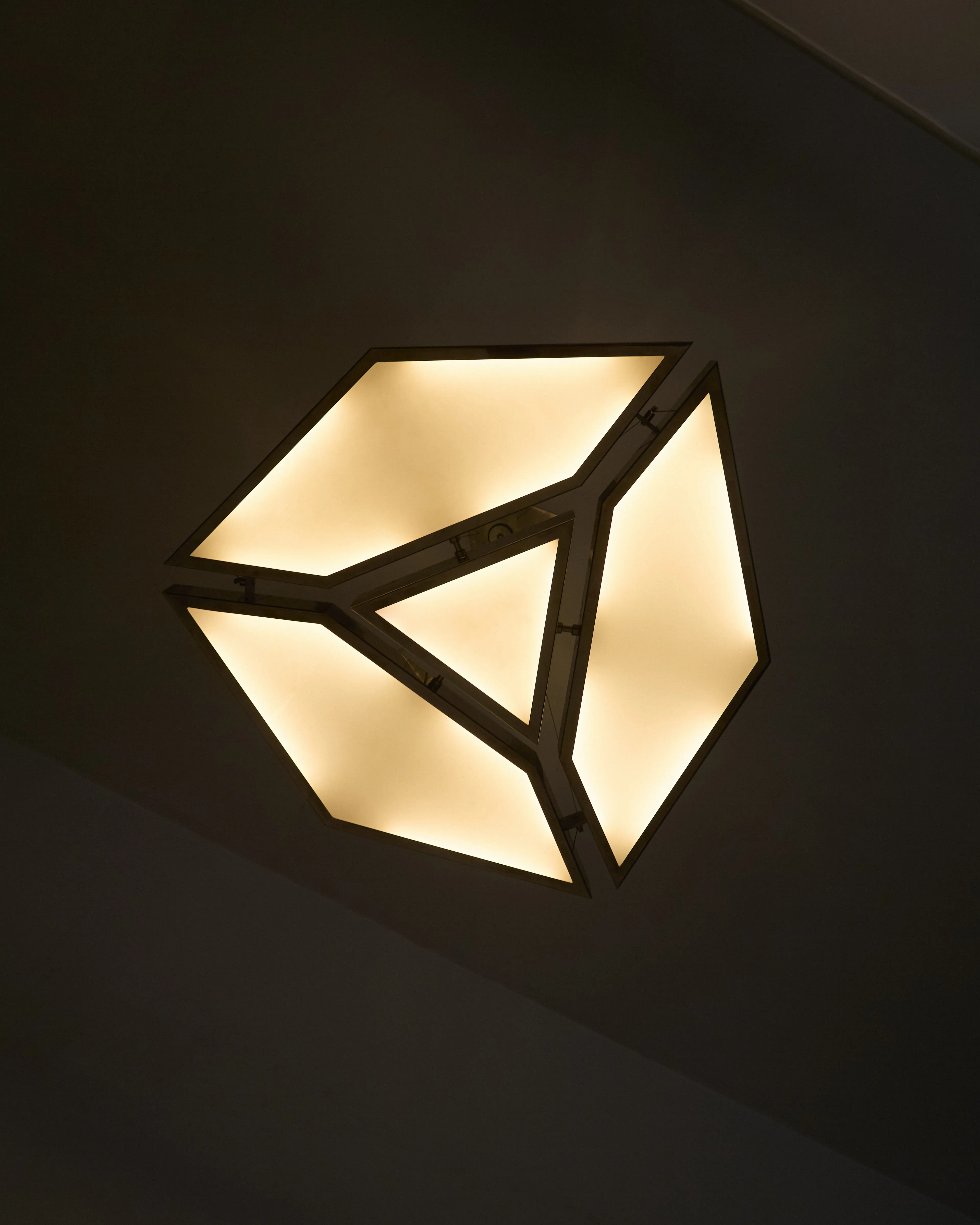 The Alban Pendant Light is a geometric pendant crafted from polished stainless steel and flat white glass, designed to evenly diffuse light while emphasizing clarity of form and material. Its faceted silhouette creates a soft, ambient glow with a strong architectural presence, allowing the fixture to function as both illumination and object. Balanced between precision and warmth.