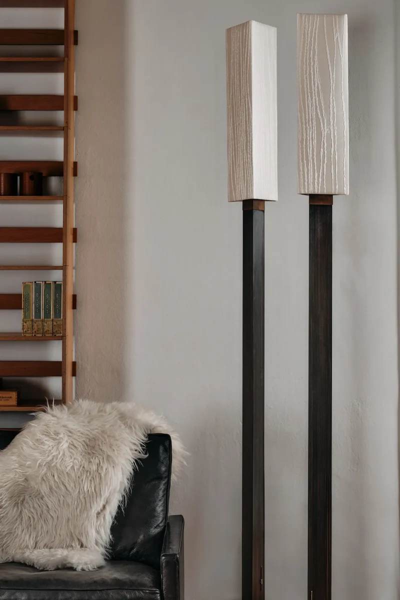 The Aldebaran Lamp by Arch Plus Ultra draws its inspiration from Aldebaran, the brightest star in the Taurus constellation, embodying celestial brilliance through refined design and luxurious materials. Its commanding presence is anchored by a prismatic column crafted from exquisite Macassar wood, renowned for its striking grain and rich tonal contrasts. The column is securely supported by a sculptural triangle-shaped patinated bronze base, blending strength with artistic elegance.