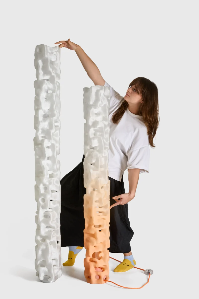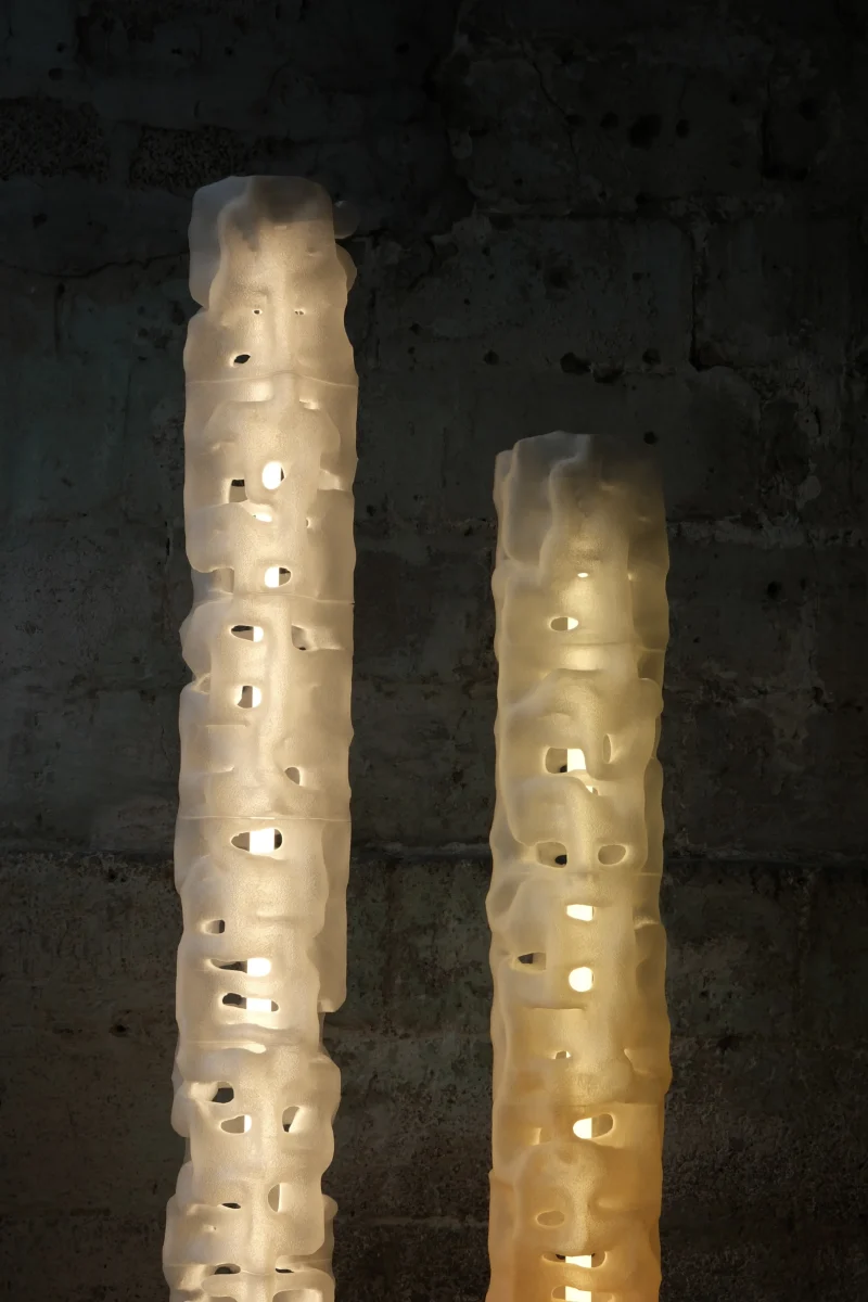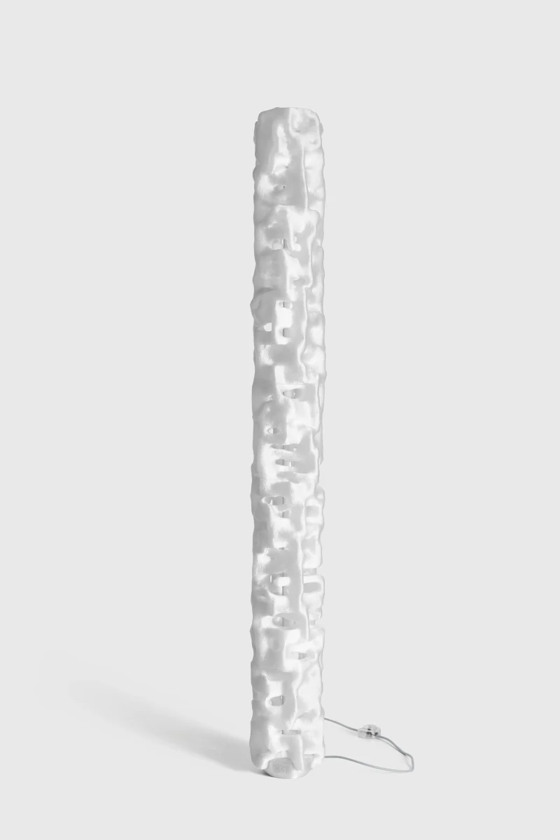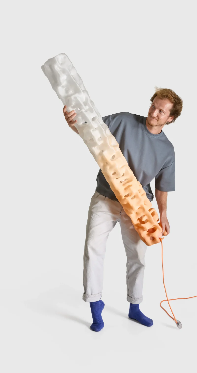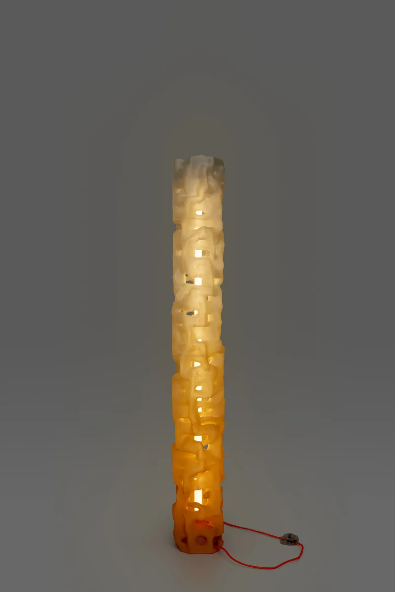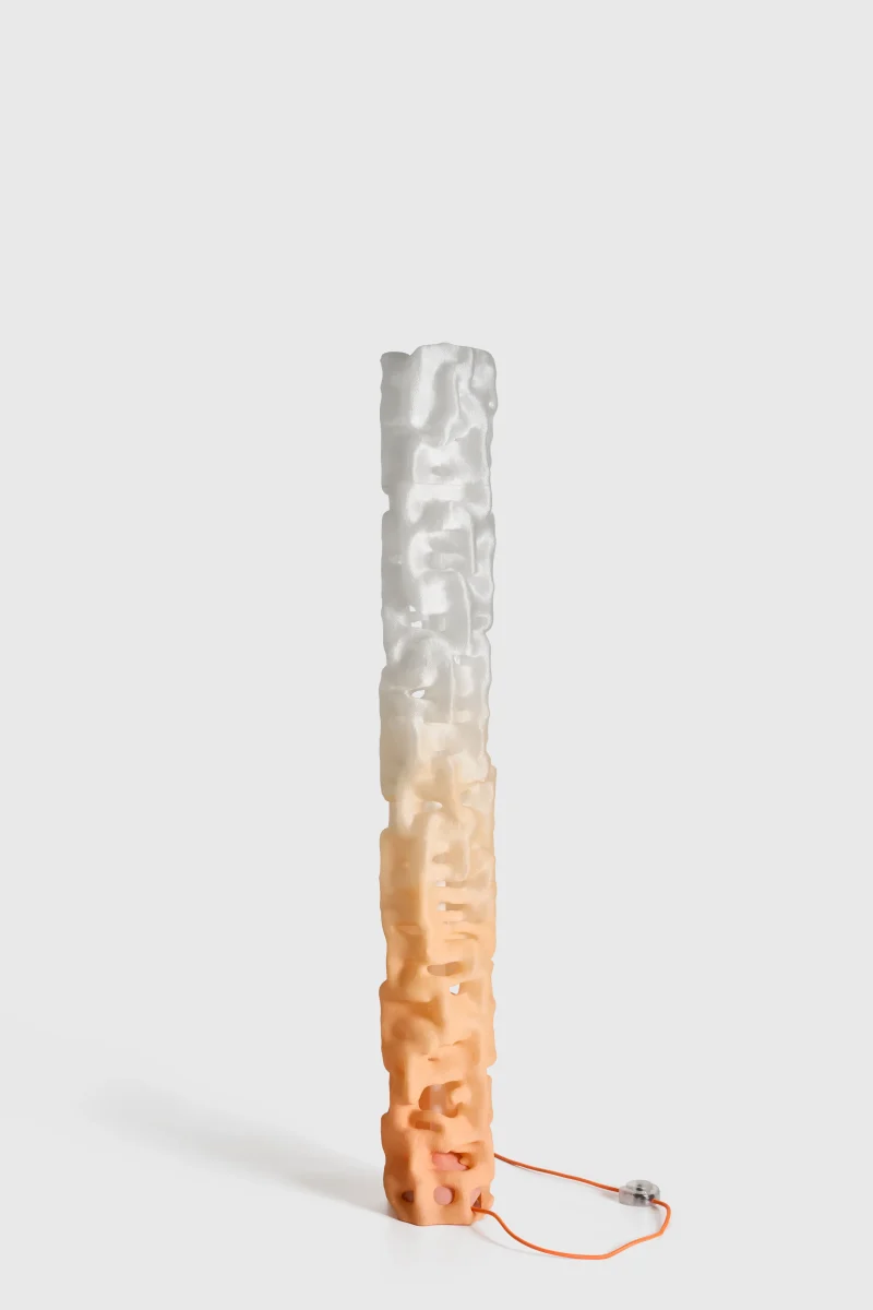 The body is 3D-printed using a translucent polymer and finished in either Gradient Pitch — with a subtle shift from deep amber to milky white — or in a fully Translucent version. Inside, a 120 cm or 150 cm T8 LED tube is seamlessly integrated, offering efficient illumination while emphasizing the verticality of the form. Despite its scale, the lamp is freestanding, designed to stand on the floor without additional support. The piece functions both as a light and a spatial element — somewhere between furniture and natural architecture — creating a warm, ambient presence in any interior.