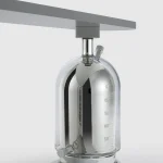 The two oversized stills, handmade of borosilicate glass, are mirrored and oxidised through the ancient technique of silvering. The lacquered wooden top, oval in shape and lunar in colour, echoes the symbol of the star; itself a metaphor for human intelligence in search of the absolute.