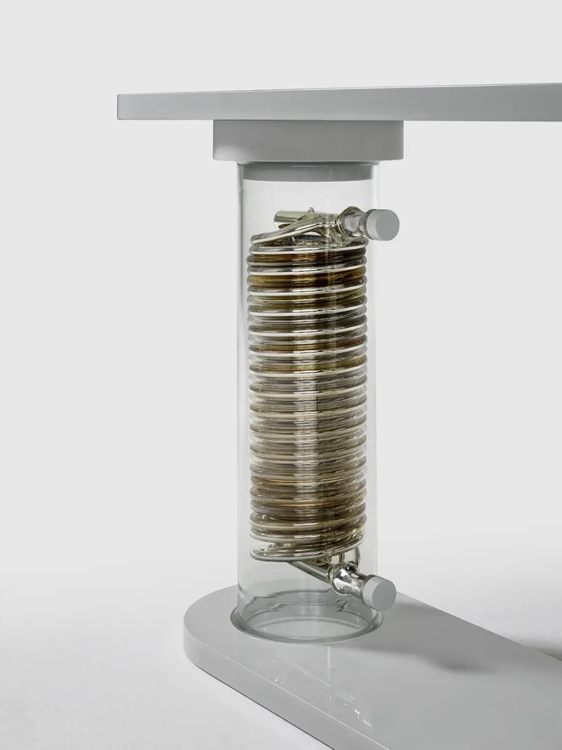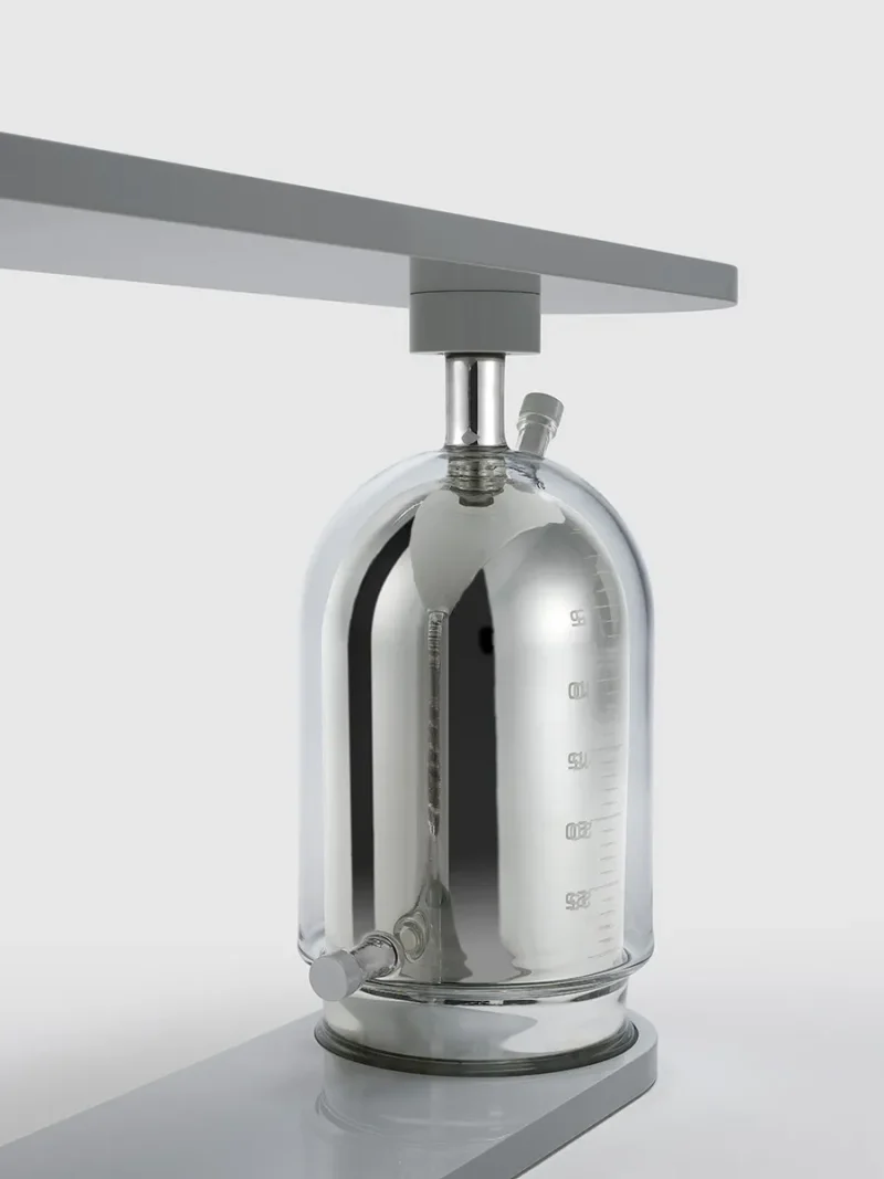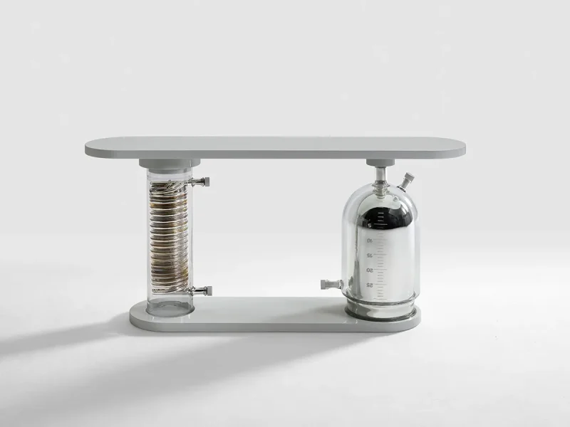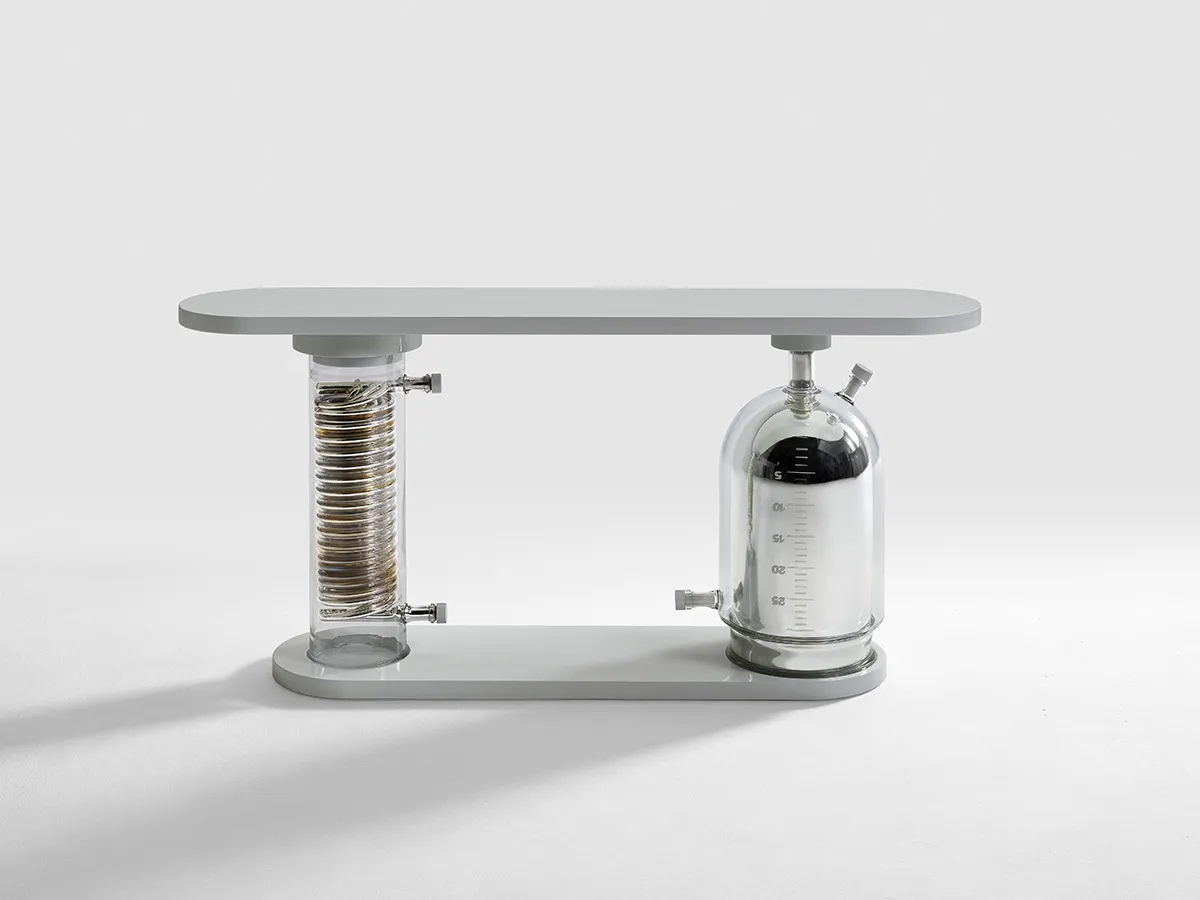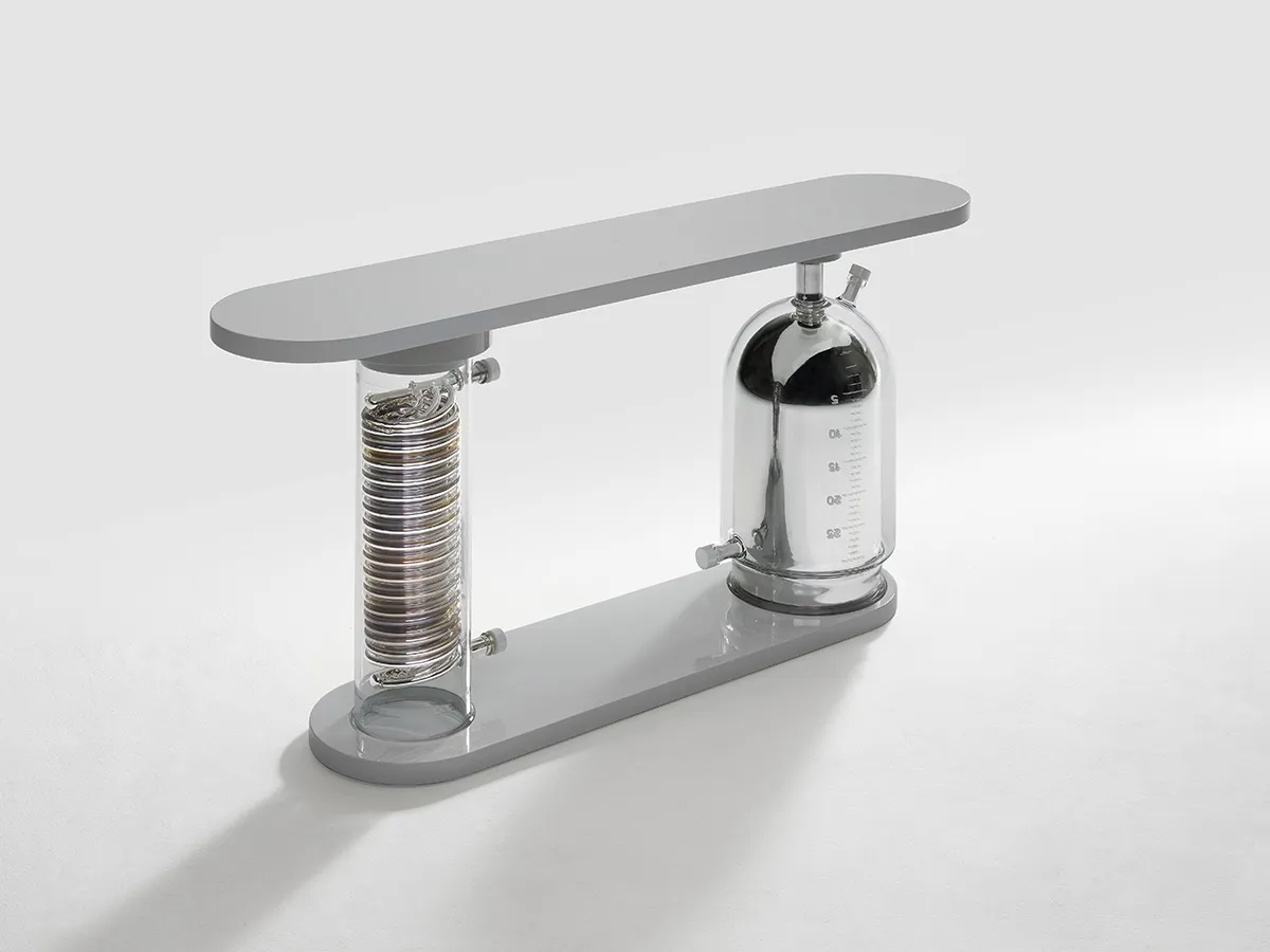 The two oversized stills, handmade of borosilicate glass, are mirrored and oxidised through the ancient technique of silvering. The lacquered wooden top, oval in shape and lunar in colour, echoes the symbol of the star; itself a metaphor for human intelligence in search of the absolute.