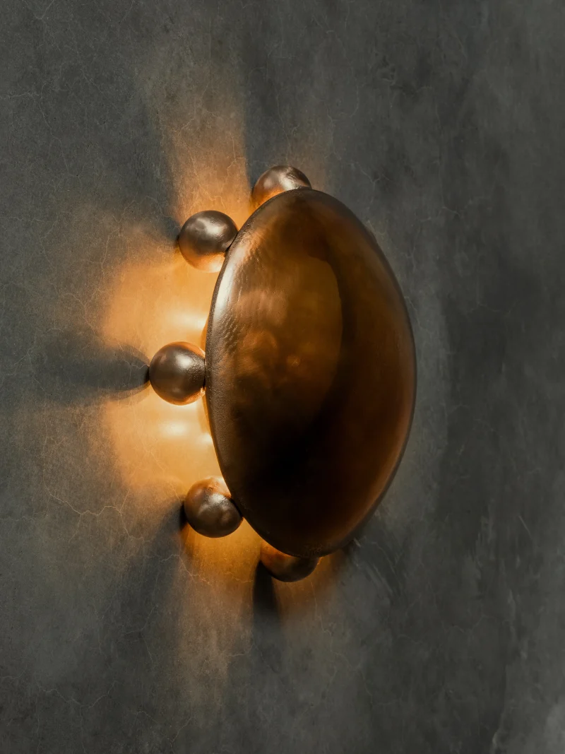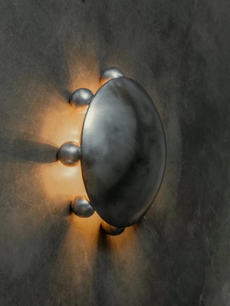 Sand cast by hand and alchemy to represent the unity of matter, spirit and energy. These sculptural light works take their form from alchemic symbols. Like alchemy, which transforms matter and spirit, Kaytar’s process aims to change materials and imbue them with new life. This solid bronze work was sand-cast by hand and left raw to develop a natural patina, it possesses a living presence. The circle form in the Alter works represents completeness and unity, symbolising the constant transformation and evolution of matter and energy. The solid metal spheres reflect the idea that all elements and forces in the universe are part of a greater whole, embodying the eternal cycle of creation, destruction, and transformation.
