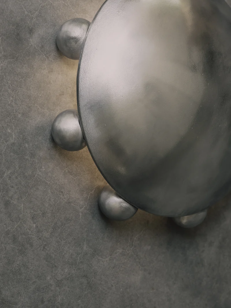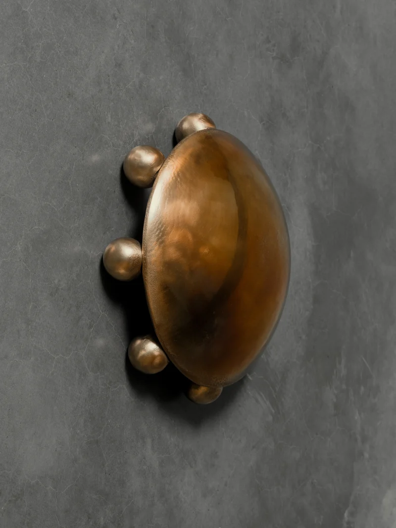 This solid metal piece is sand-cast by hand. The unique ripples and pitting in the material are to be celebrated for their individual beauty. This work has been aged with a patina. Raw aluminium, brass, and bronze will naturally develop a patina over time, adding to their inherent beauty. If desired, a high-quality metal polish can restore their original brightness and shine.