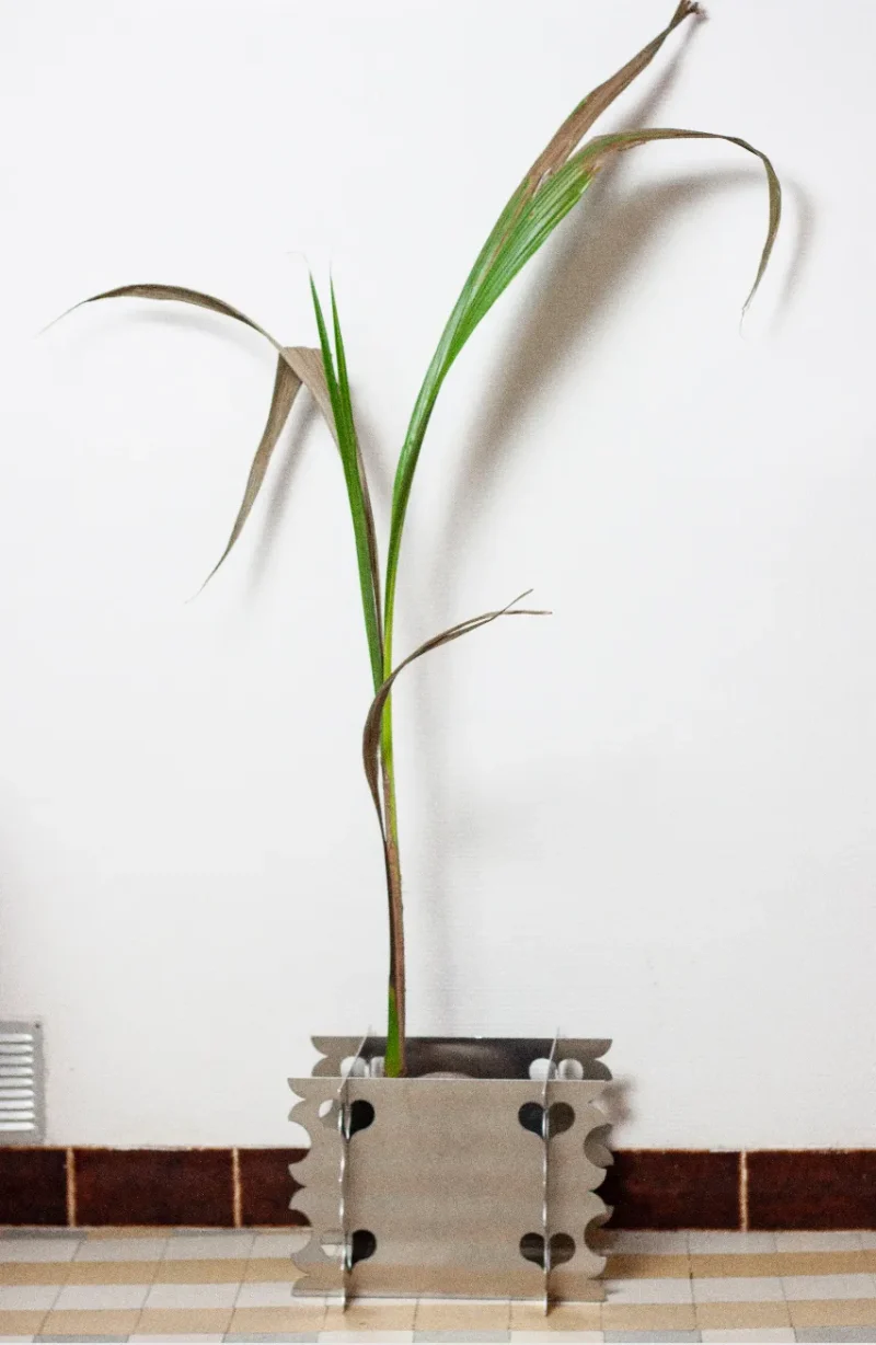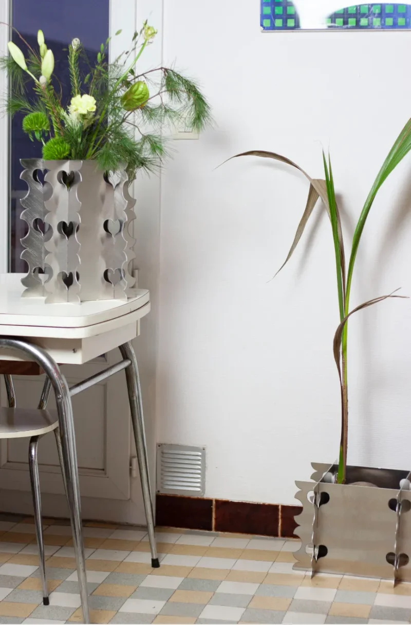 The Flower Pot Cover 1, another remarkable creation by Mélissa Mariller, exemplifies the artist’s flair for infusing traditional design elements with a contemporary twist. This sheet-aluminum piece is not just a functional object; it is a canvas where Mariller’s artistic vision comes to life, drawing inspiration from the intricate motifs characteristic of local vernacular furniture.