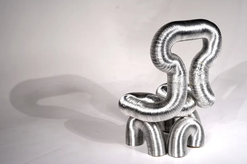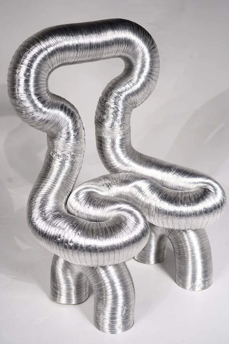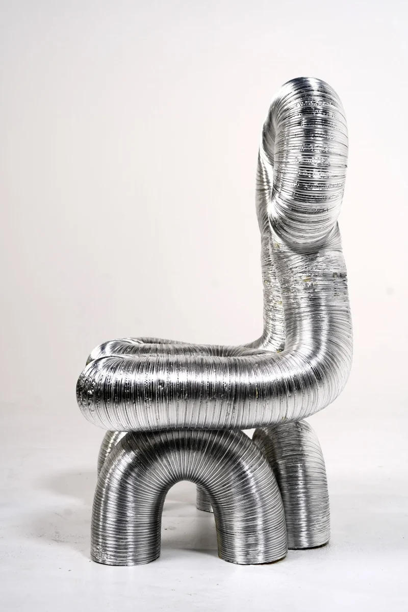 Made of aluminum ventilation tubes, the Amadeus Chair is a unique, handcrafted piece of art furniture. The major goal of this work is to investigate the material’s suppleness and to identify the fashion language that underlies its form and composition. The chair’s overall form is made by hand from aluminum ventilation tubes, which are then filled with voluminous firm foam to give it strength and lightness.