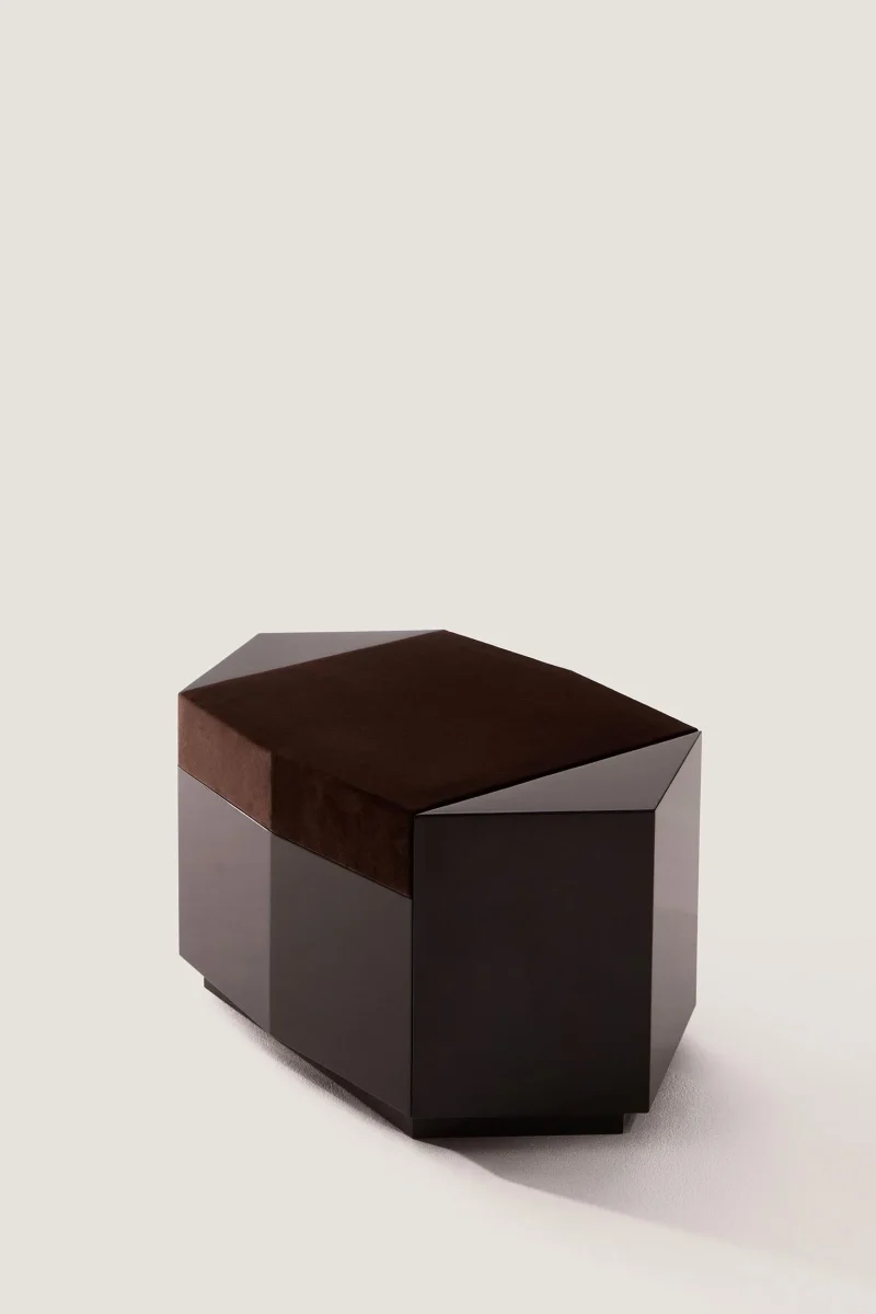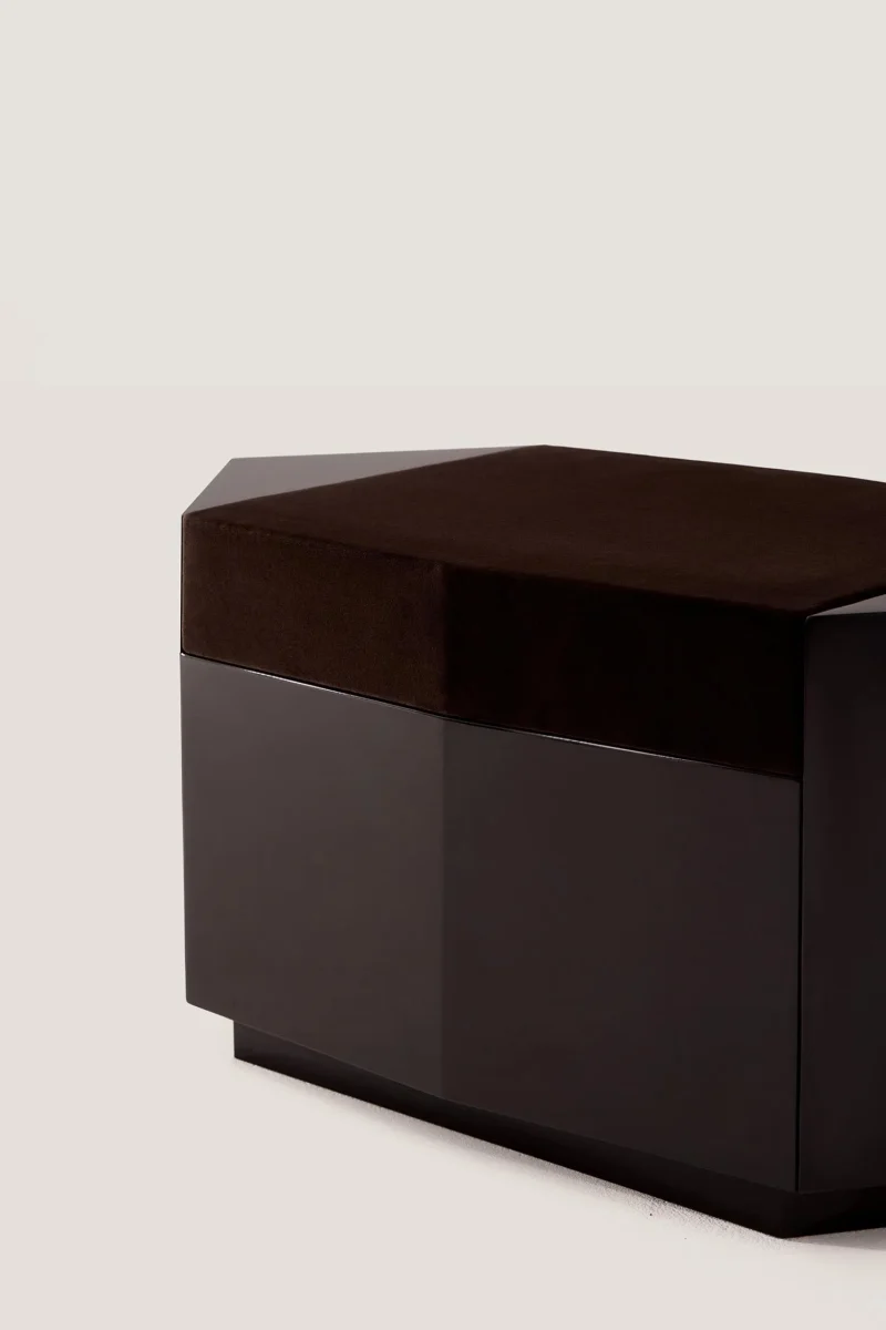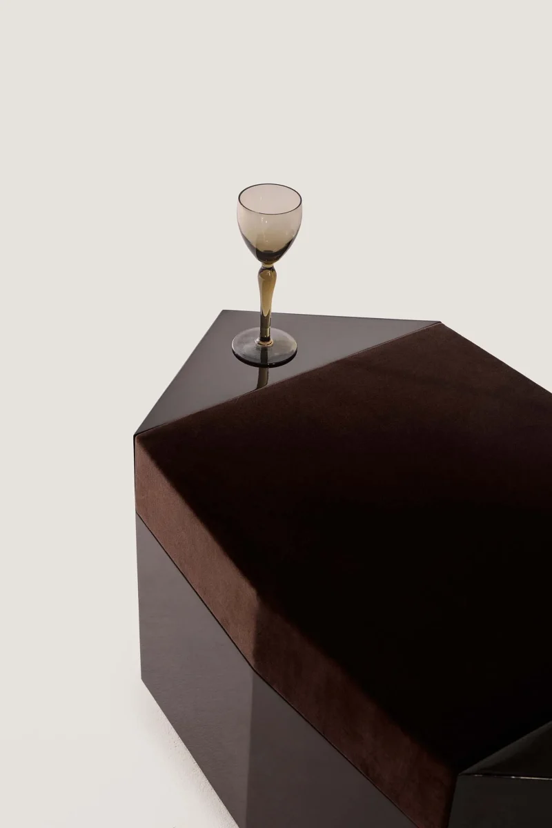 The Ame I Lacquer Ottoman is a sculptural pouf handcrafted in Portugal, featuring a dark chocolate high-gloss lacquered MDF base and a deep burgundy velvet seat. Its architectural silhouette balances solidity and softness, light and shadow, creating a refined spatial gesture. Each piece is a statement of tactile elegance and intentional craftsmanship.