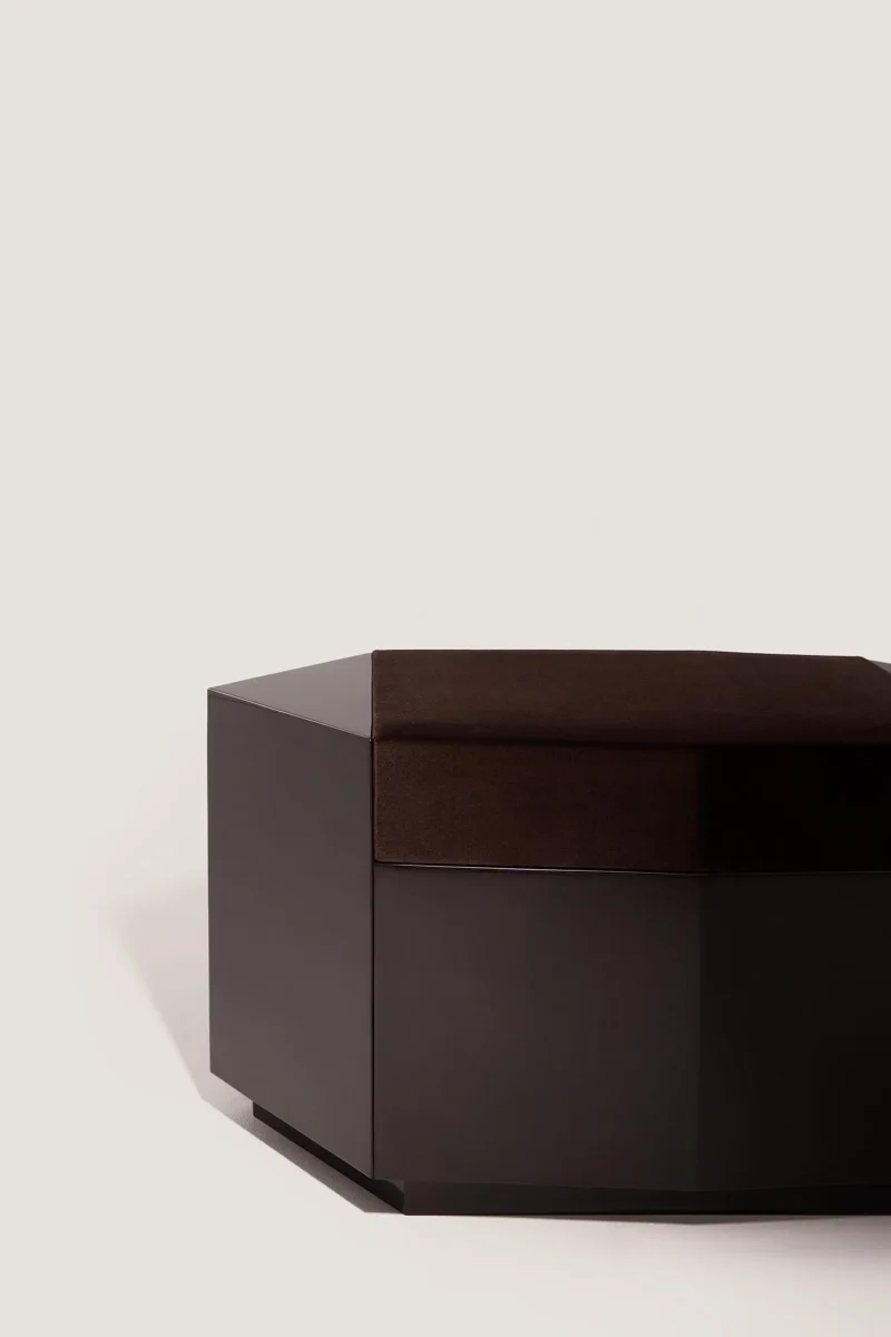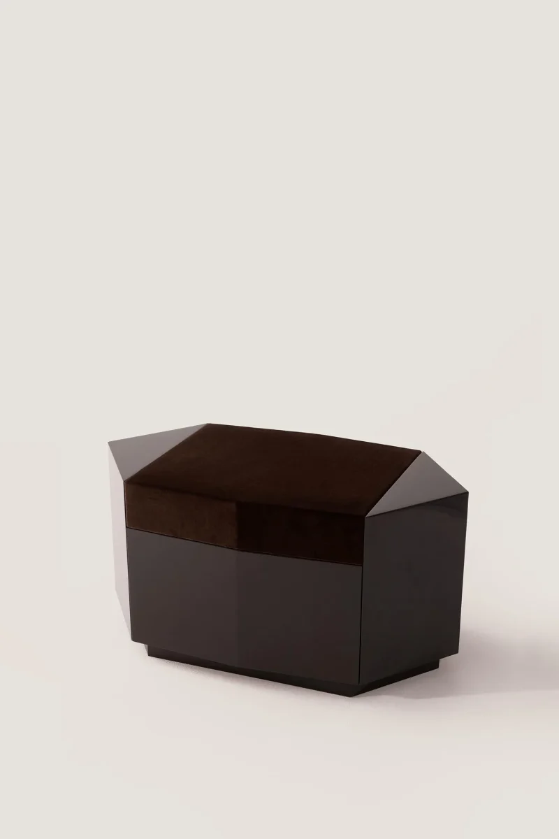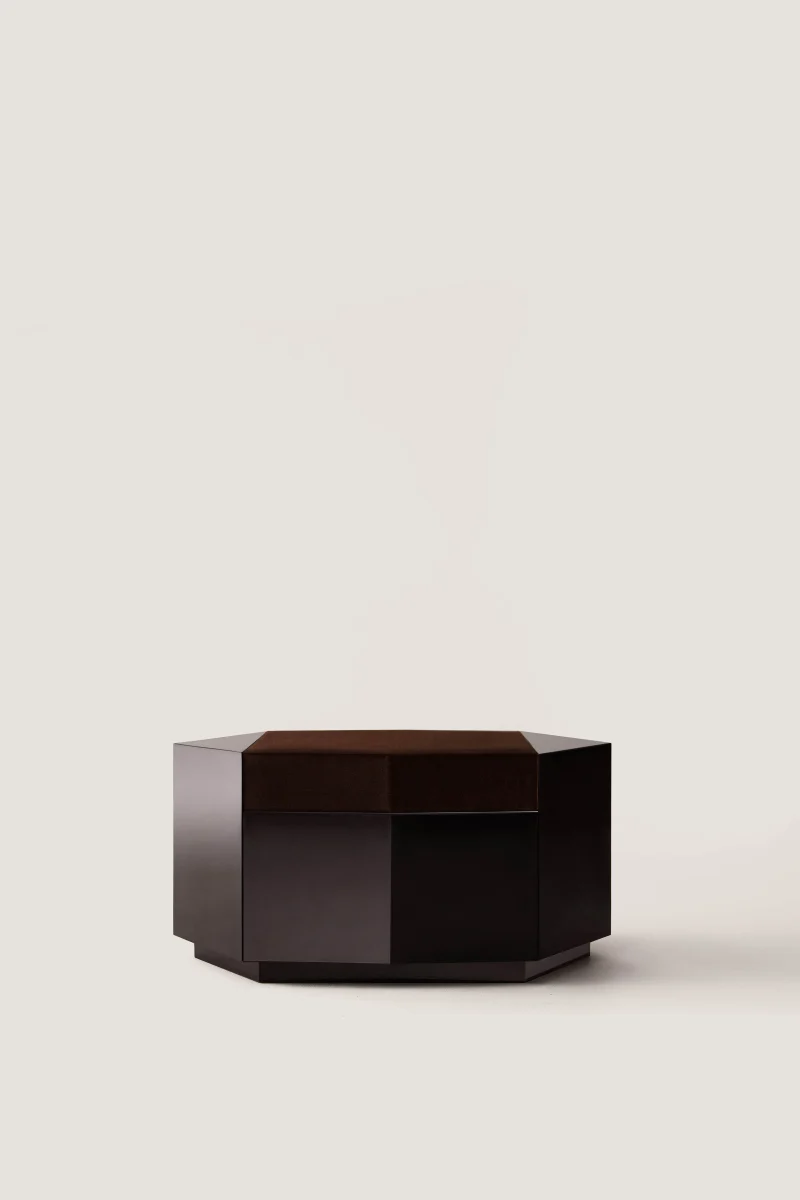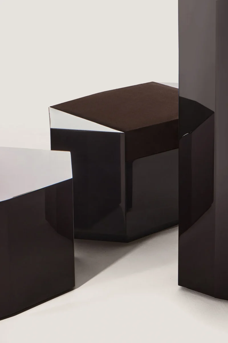 The Ame I Lacquer Ottoman is a sculptural pouf handcrafted in Portugal, featuring a dark chocolate high-gloss lacquered MDF base and a deep burgundy velvet seat. Its architectural silhouette balances solidity and softness, light and shadow, creating a refined spatial gesture. Each piece is a statement of tactile elegance and intentional craftsmanship.