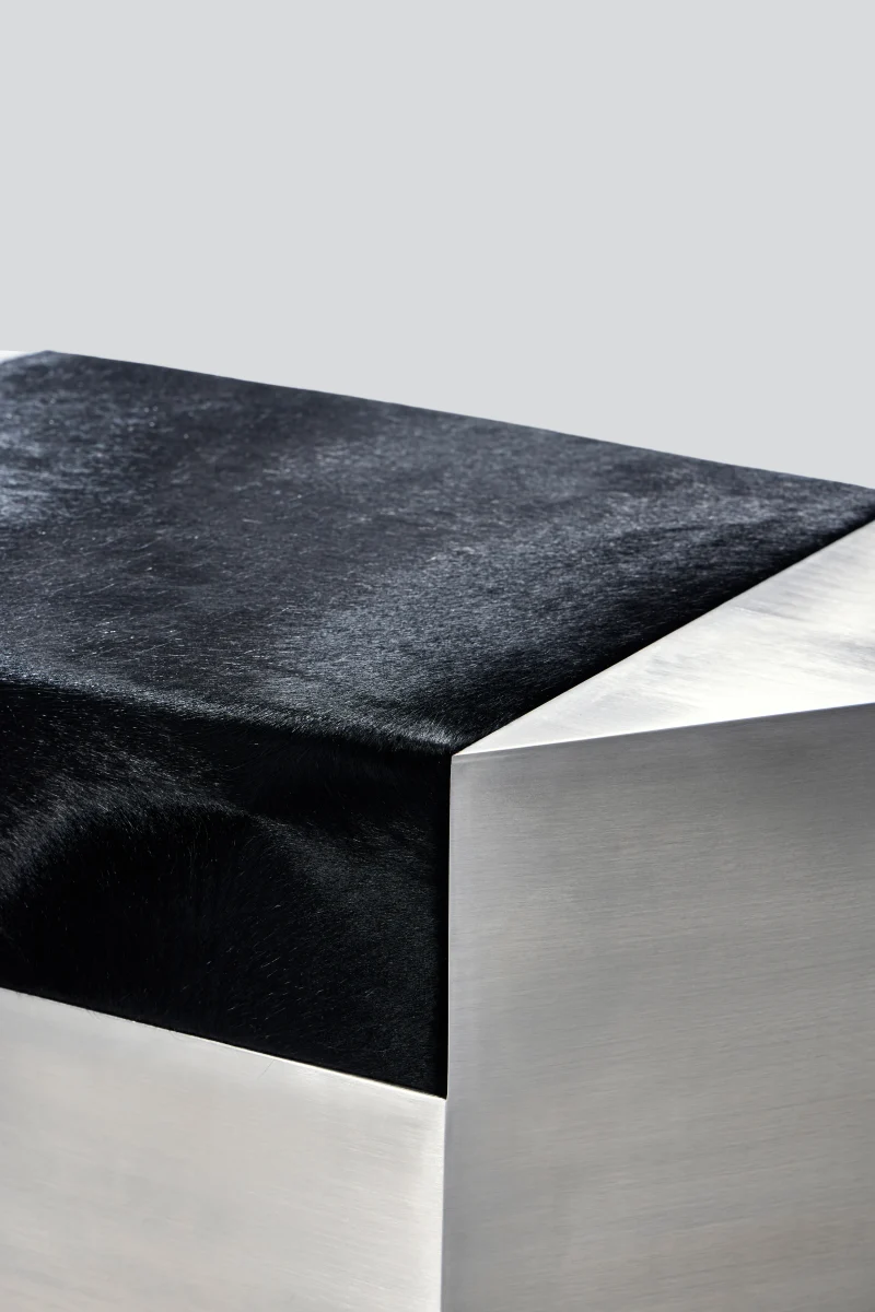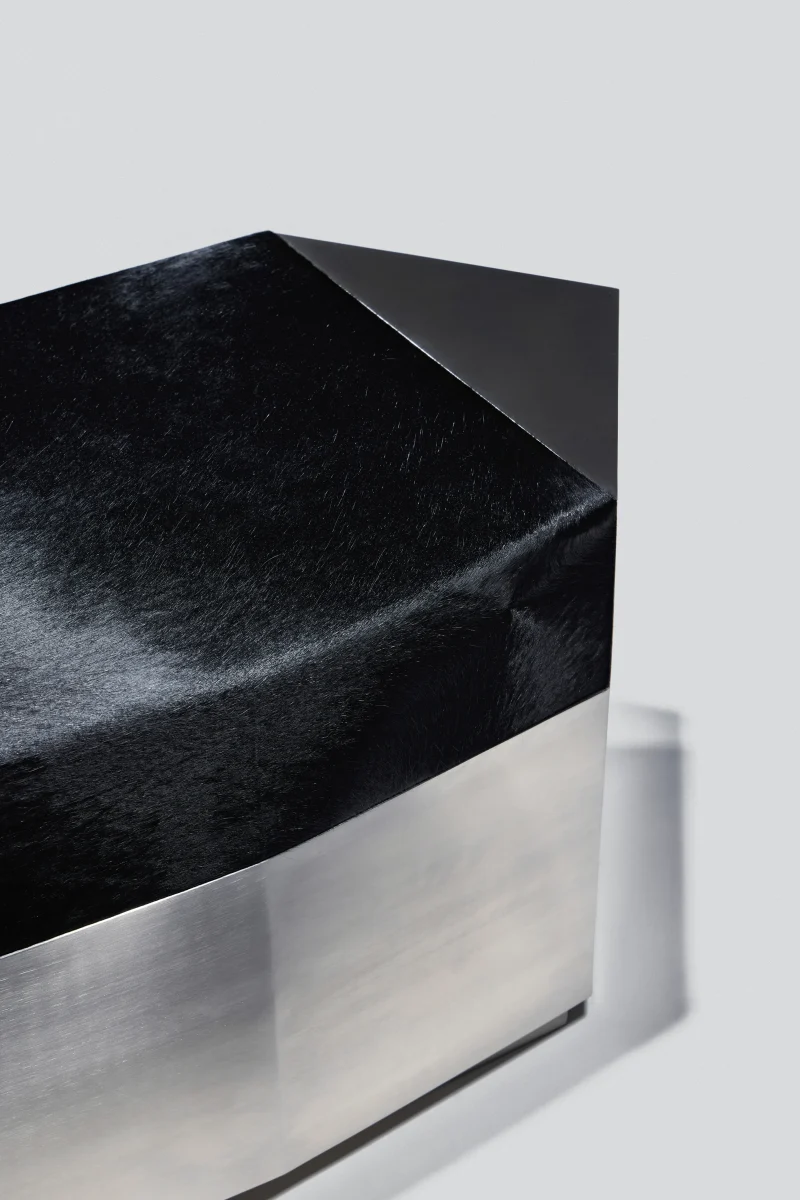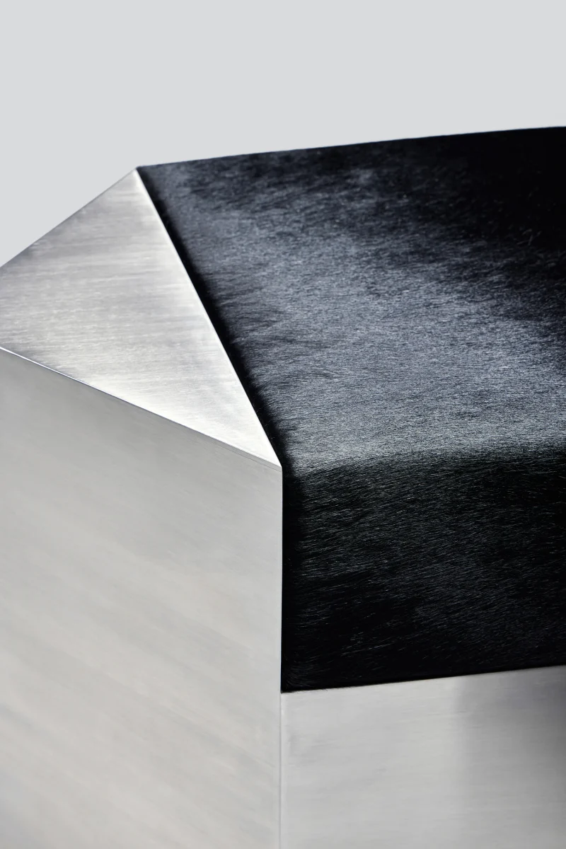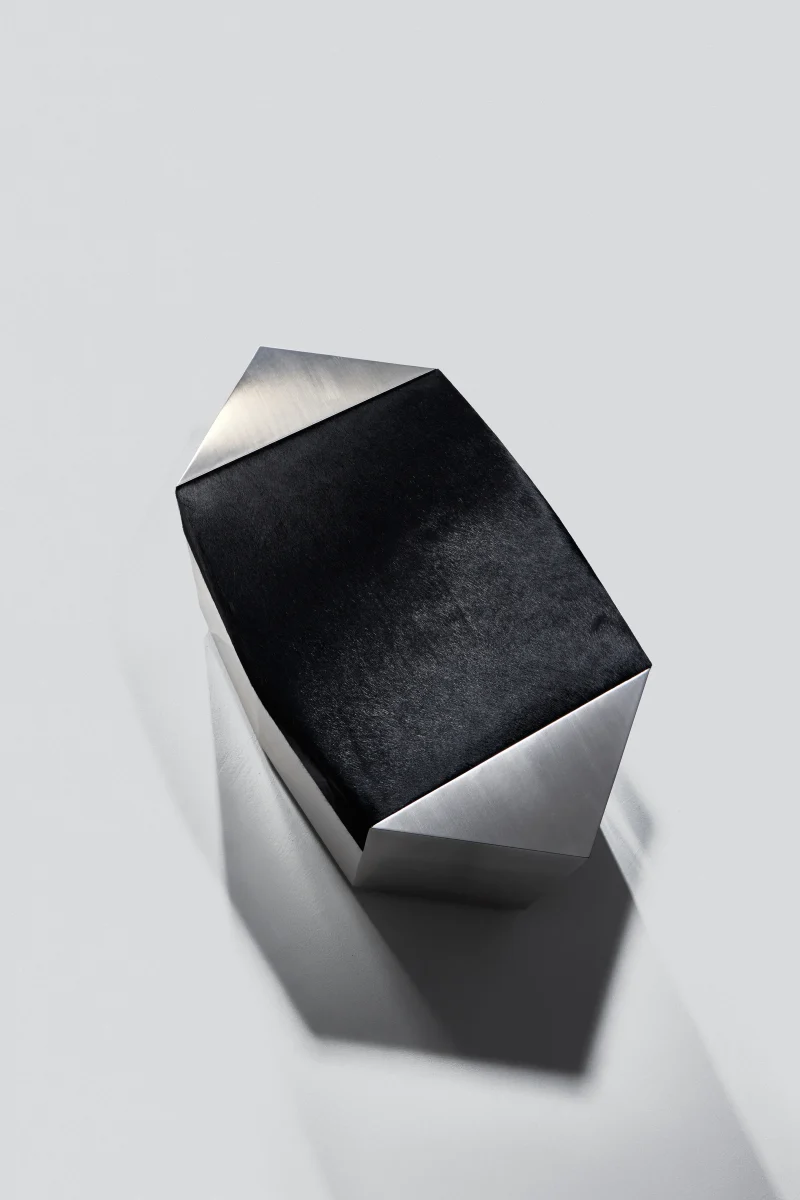 The Ame I Steel Ottoman is a bold architectural piece handcrafted in Portugal, featuring a brushed steel base and a deep black cowhide cushion. Its faceted silhouette captures and reflects light, emphasizing contrasts between hardness and softness, matte and shine. Each piece is a statement of tactile elegance and intentional craftsmanship.