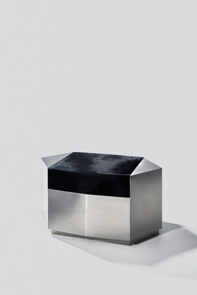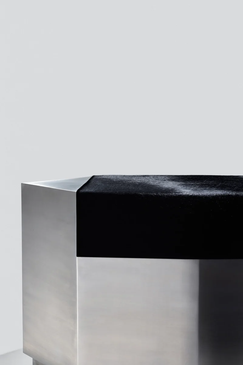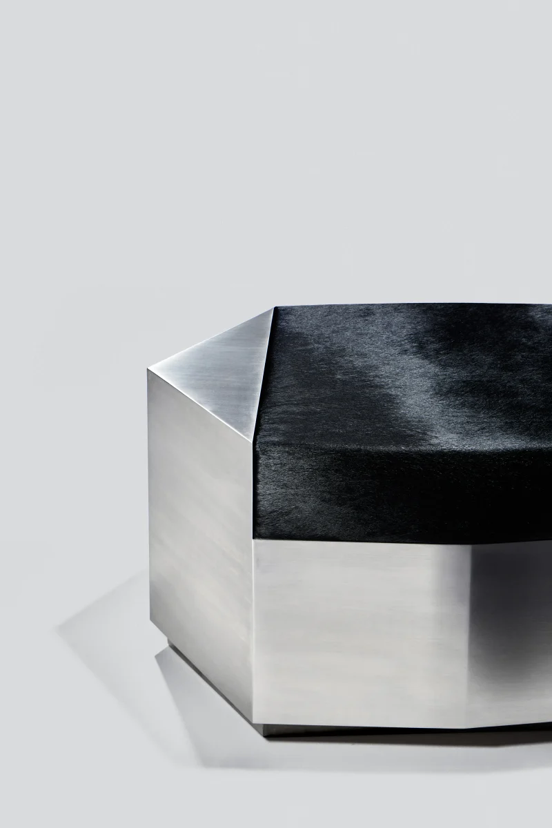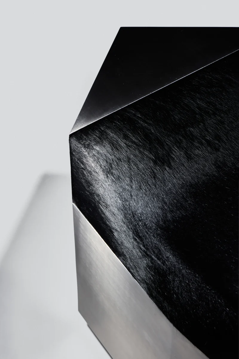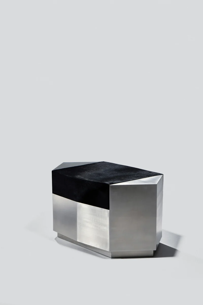 The Ame I Steel Ottoman is a bold architectural piece handcrafted in Portugal, featuring a brushed steel base and a deep black cowhide cushion. Its faceted silhouette captures and reflects light, emphasizing contrasts between hardness and softness, matte and shine. Each piece is a statement of tactile elegance and intentional craftsmanship.