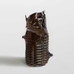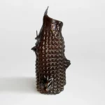 These vessels are part of an ongoing series called “Reliquary for the Deconsecrated”. Each form draws from the shape of a bodice, tight, protective, ornamental, and was created using blown hot glass, and glass powders to evoke the translucency and texture of the skin. This vessel is named after Amelia Bloomer, the advocate against restrictive corsetry. Accessorized by Bond Hardware, blown glass made with the help of Sticky glass.