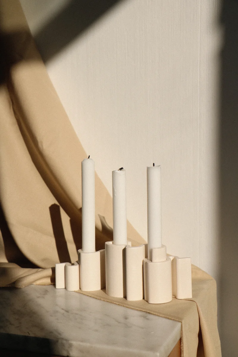 These candleholder pieces interlock with each other in a playful way, creating unique shapes, much like a living typography. Like an arch, they are sealed together by a keystone: the candle. Two base pieces form the candle holder, sealed by a 2.2 cm diameter candle. Another piece can be added to create new candle holes. The possibilities are endless, like a constantly evolving alphabet of light!