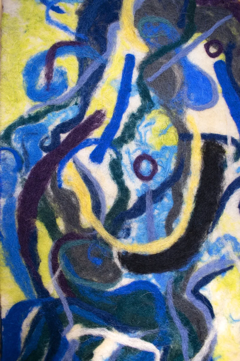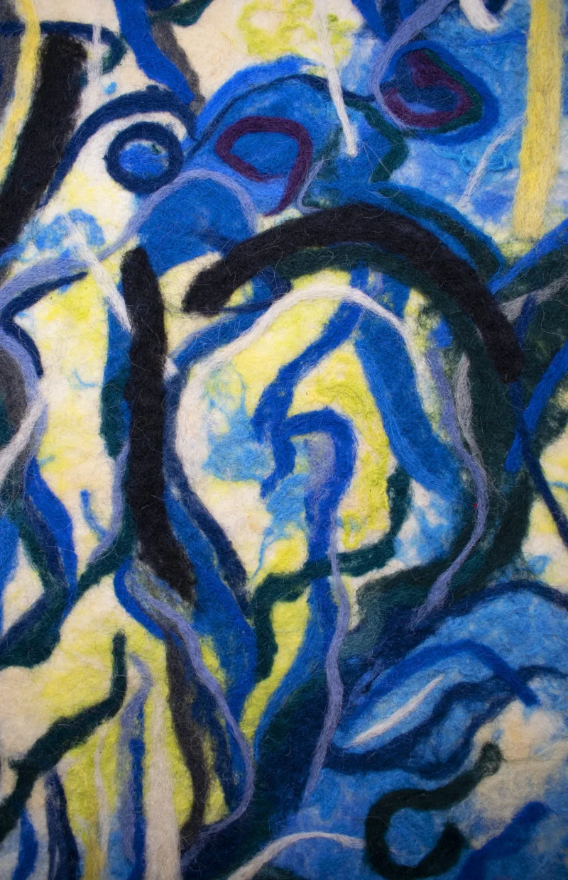 The artwork is made entirely handcrafted using discarded sheep wool from Romania, the work has a synthetic textile support on the back. Signed by the artist.