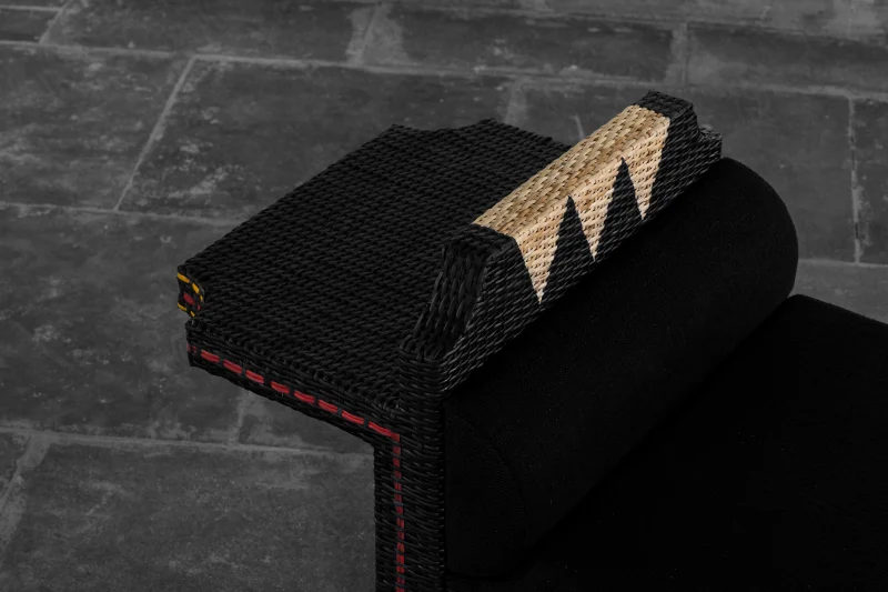 Handcrafted with naturally dyed cane and rattan edge binding on a wooden structure, featuring black cotton upholstery for a sleek, cohesive look.