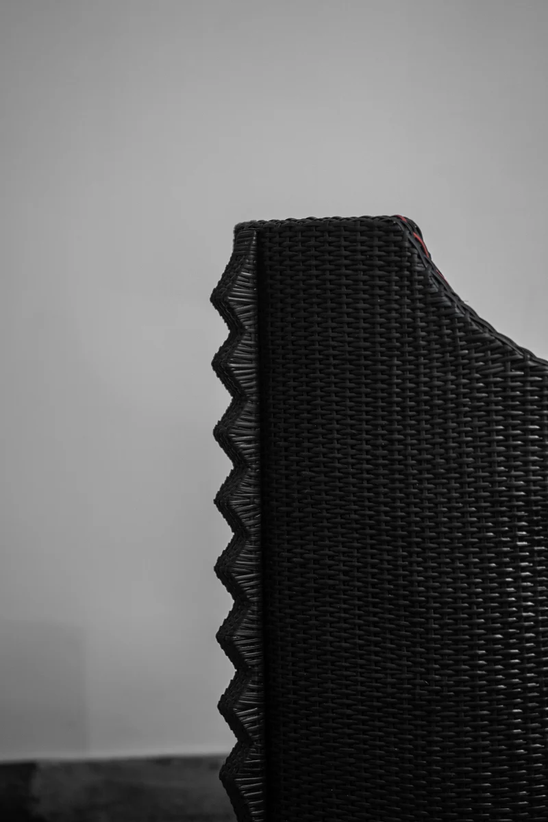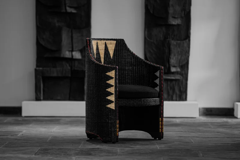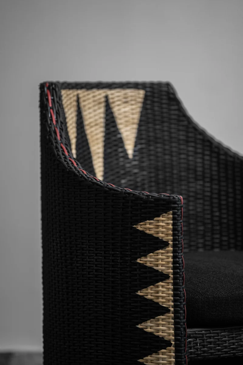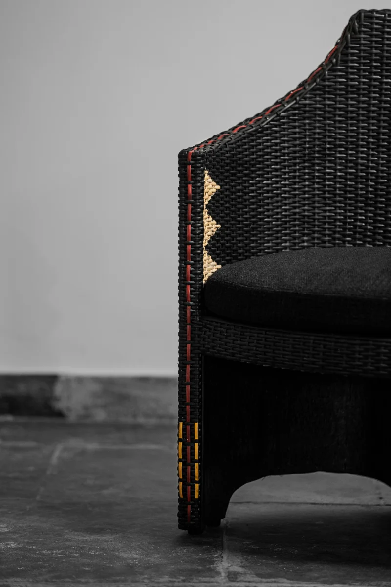 Handcrafted with naturally dyed cane and rattan edge binding on a wooden structure, featuring black cotton upholstery for a sleek, cohesive look.