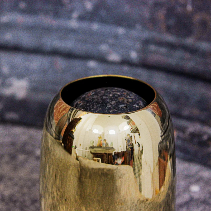 The Anicca Vanitas Scent Diffuser by Luca Gruber is made from sheet metal brass and includes a volcanic rock sphere. The brass pieces are hand-polished from the outside to a mirror-like finish, while the inside is patinated to create a dark brass texture. The brass acts as a container and elevates the volcanic rock. At the heart of this diffuser lies a volcanic rock sphere, carefully placed within the brass vessel. This natural element absorbs and gradually releases scented oils, filling the space with a subtle, lingering fragrance that evokes the passage of time. The interplay between the polished brass and the organic texture of the volcanic rock reflects the tension between permanence and impermanence – a central theme of the Anicca Vanitas Collection.