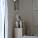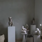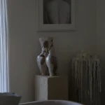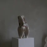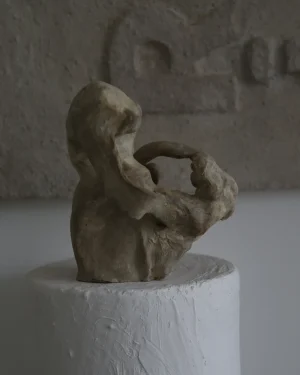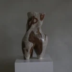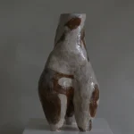This three-legged sculpture balances simplicity and subtle complexity. Its oatmeal-colored surface provides a warm, neutral backdrop, while abstract shapes in a layered blue shino glaze add dynamic accents. The glaze shifts between delicate pale blue and reddish-brown tones, creating depth and visual interest that changes with the light and viewing angle. The piece is simultaneously grounded and expressive, celebrating form and glaze as equals.
