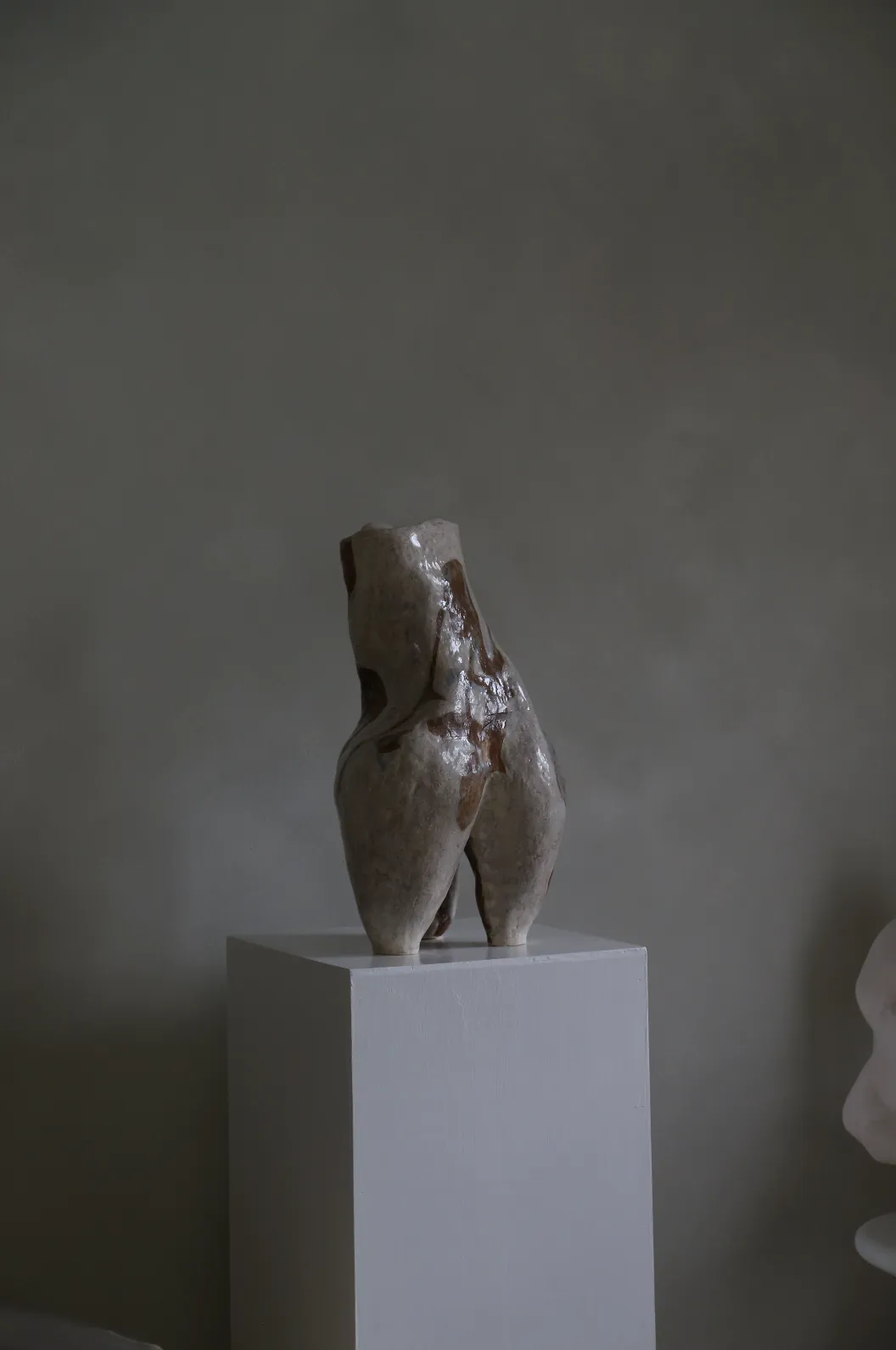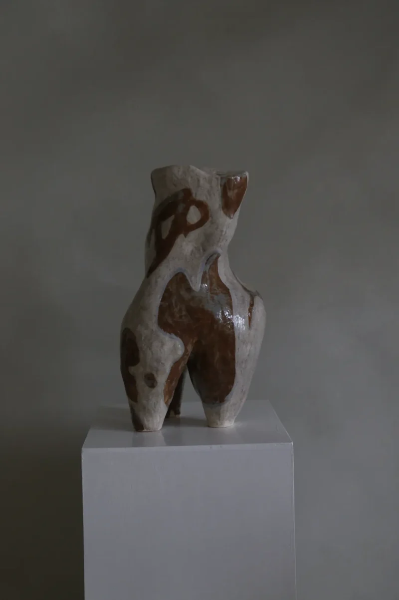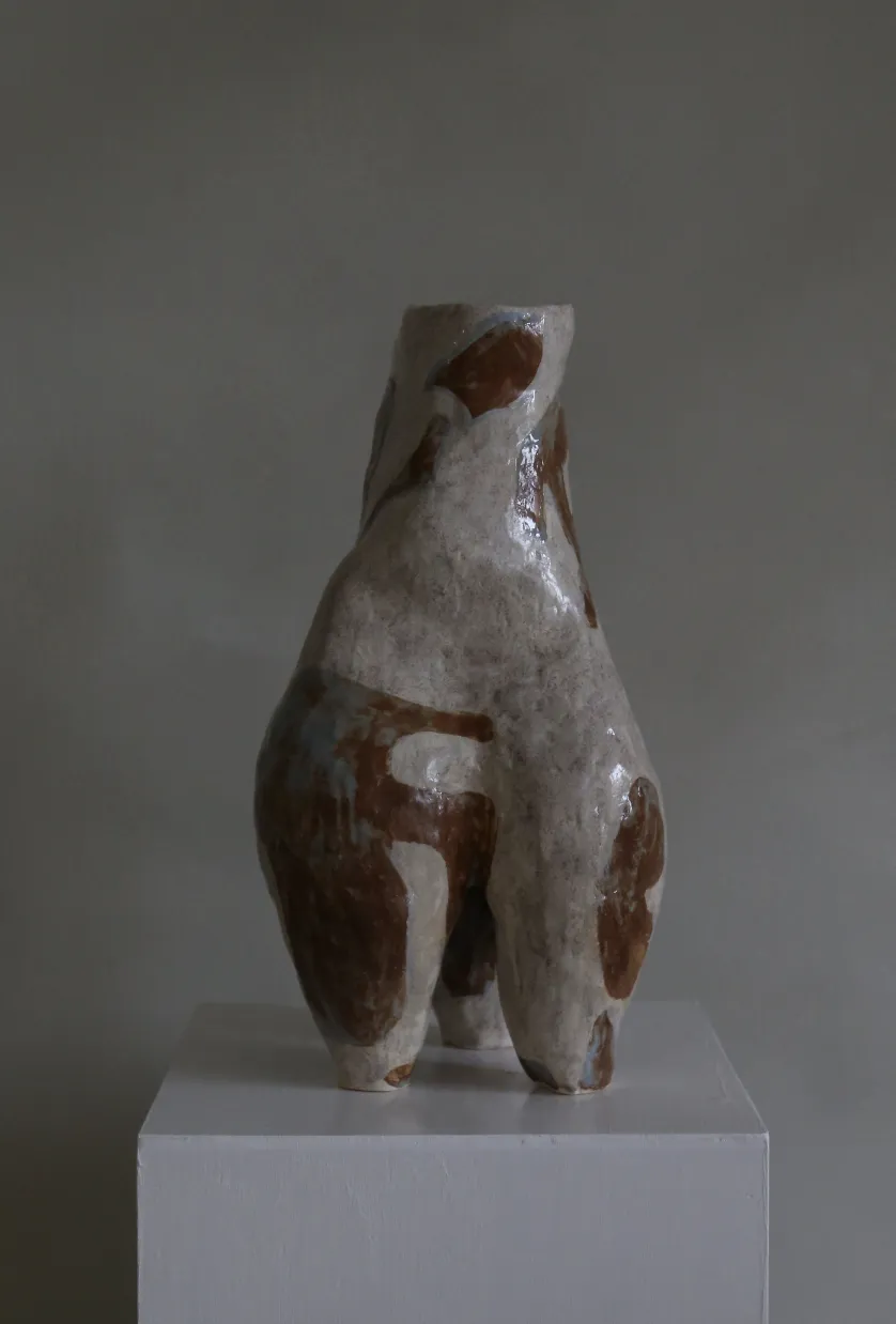 This three-legged sculpture balances simplicity and subtle complexity. Its oatmeal-colored surface provides a warm, neutral backdrop, while abstract shapes in a layered blue shino glaze add dynamic accents. The glaze shifts between delicate pale blue and reddish-brown tones, creating depth and visual interest that changes with the light and viewing angle. The piece is simultaneously grounded and expressive, celebrating form and glaze as equals.