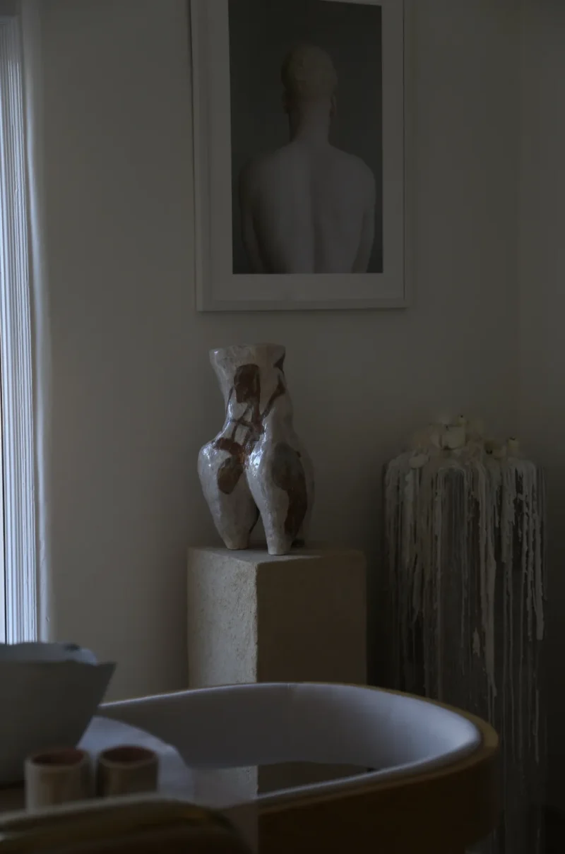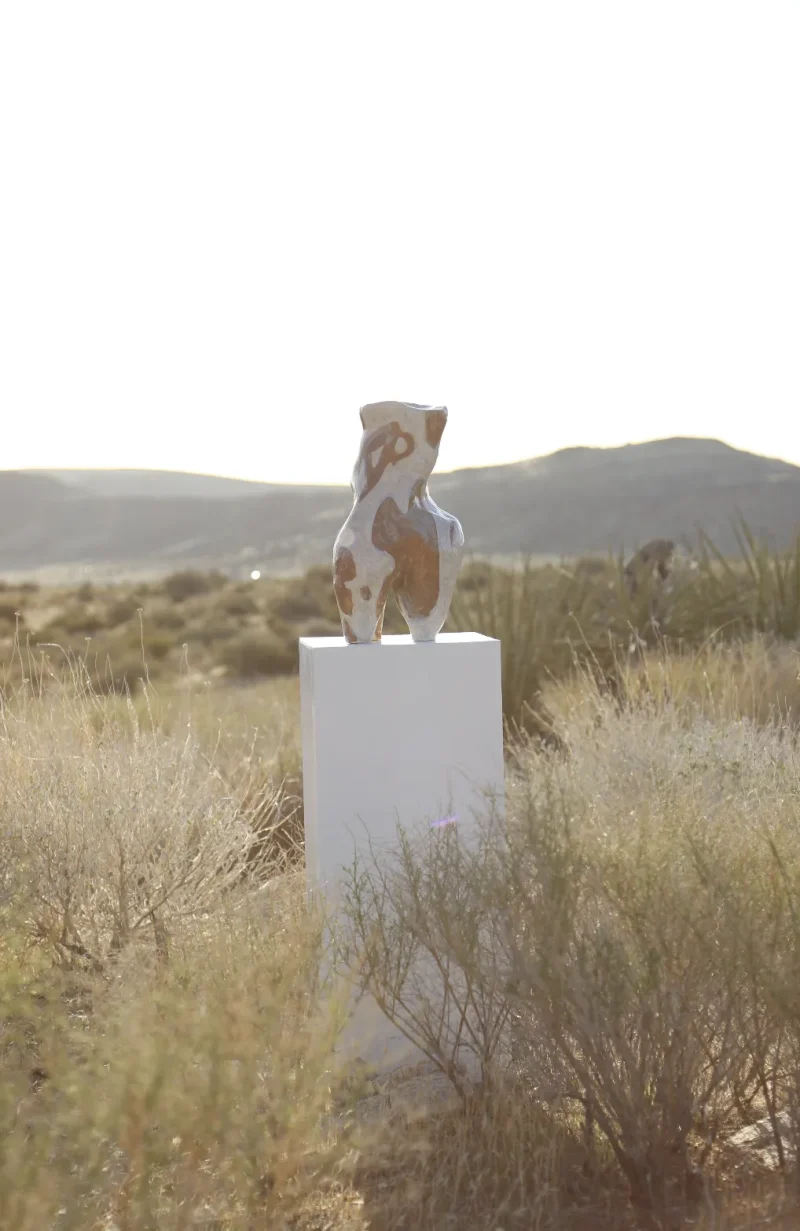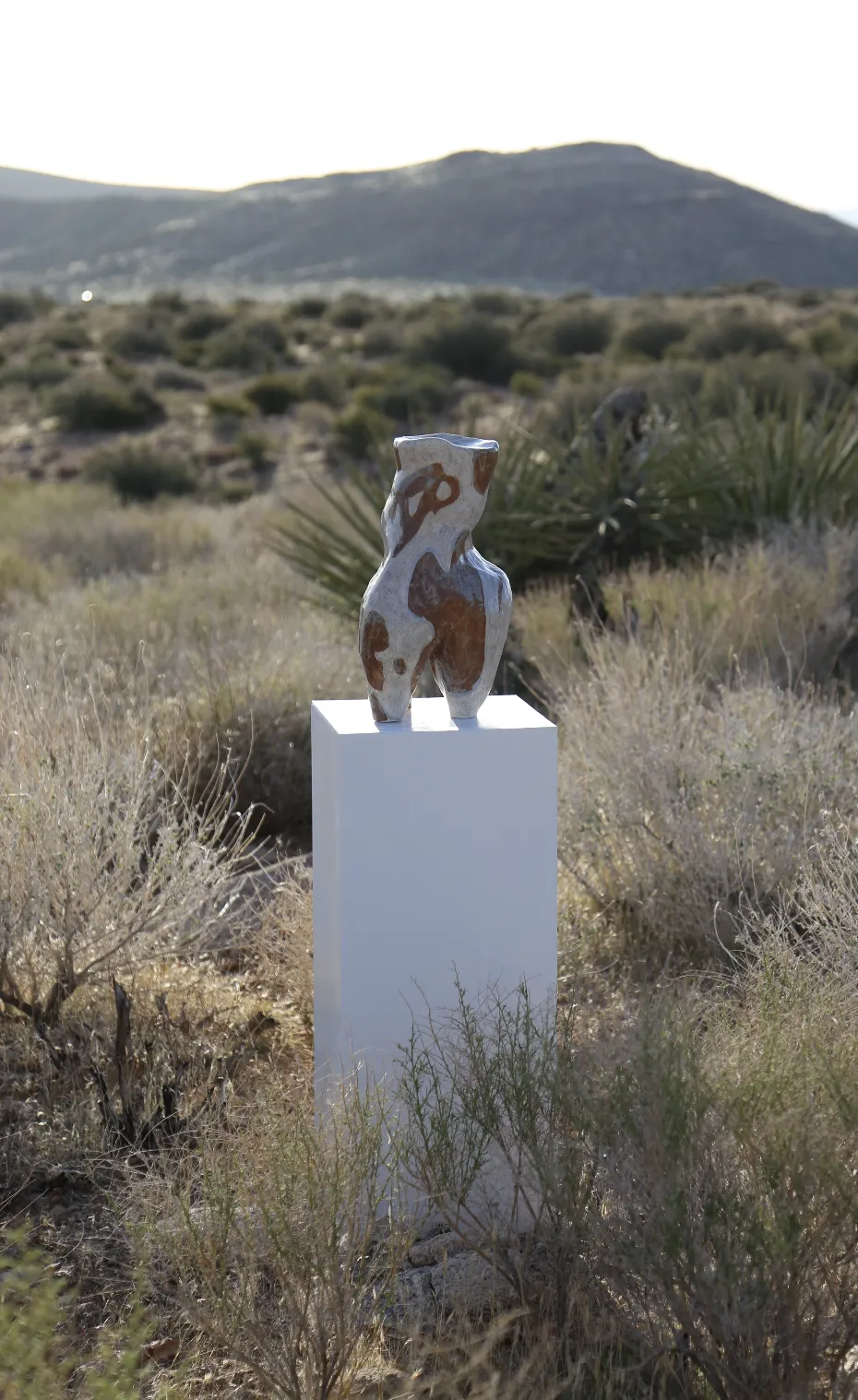 This three-legged sculpture balances simplicity and subtle complexity. Its oatmeal-colored surface provides a warm, neutral backdrop, while abstract shapes in a layered blue shino glaze add dynamic accents. The glaze shifts between delicate pale blue and reddish-brown tones, creating depth and visual interest that changes with the light and viewing angle. The piece is simultaneously grounded and expressive, celebrating form and glaze as equals.
