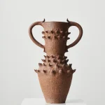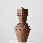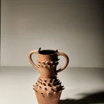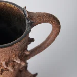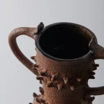 This vessel by twig & beetle was hand thrown on the wheel using a dark groggy clay body, in two parts and then conjoined to created on sculptural vessel. Spikes were then added and adjusted one by one to create unique angles. Left raw externally, internally glazed with a black matte glaze that had a magma effect toward the inside bottom of the piece.