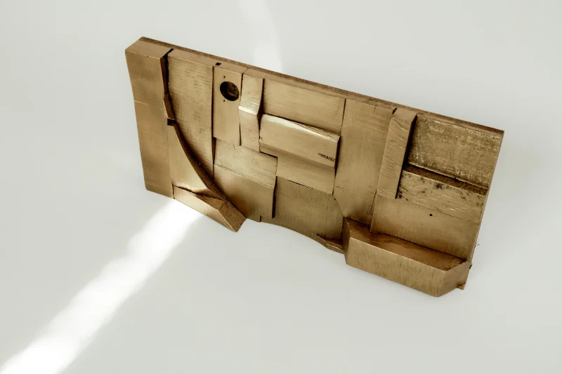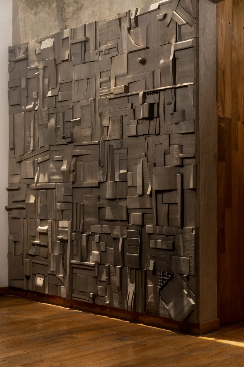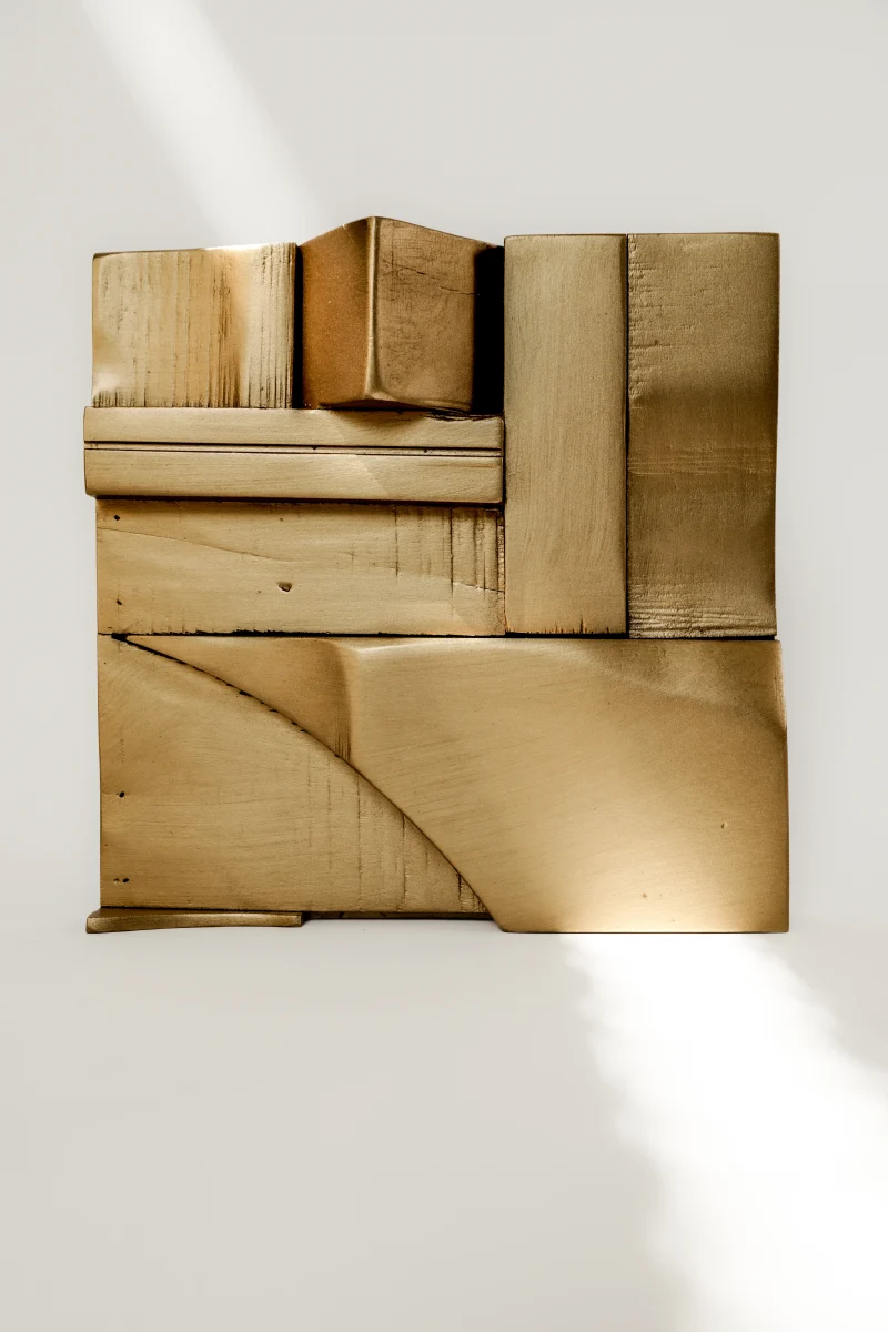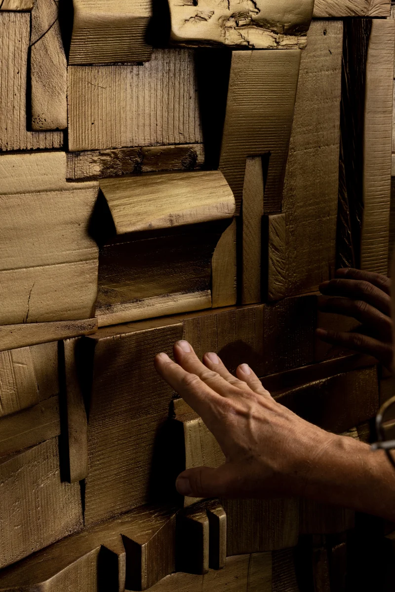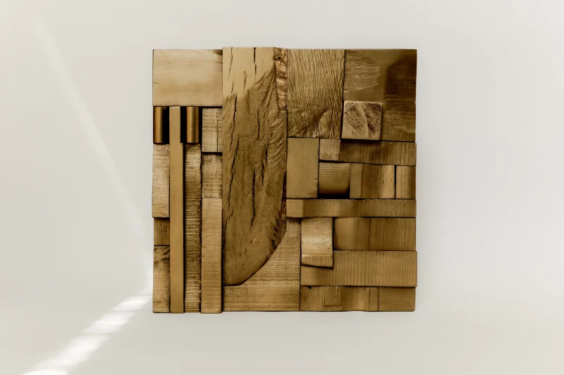 Each Wood Collage panel is a one-of-a-kind composition, randomly assembled from recycled hardwood remnants. The result is a warm, richly textured surface that brings a meditative atmosphere to any space. Carefully sanded to a smooth finish and sealed with matte lacquer and wax, these pieces radiate both raw energy and serene stillness—a kind of chaotic brutalism born from chance.