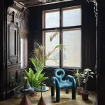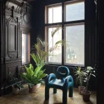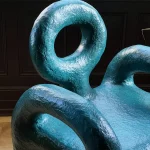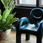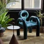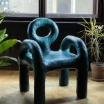 Turquoise handmade functional sculpture / chair made from shredded paper and scrap materials. Despite the unconventional material, it has sufficient load-bearing capacity and durability and is easily washable.