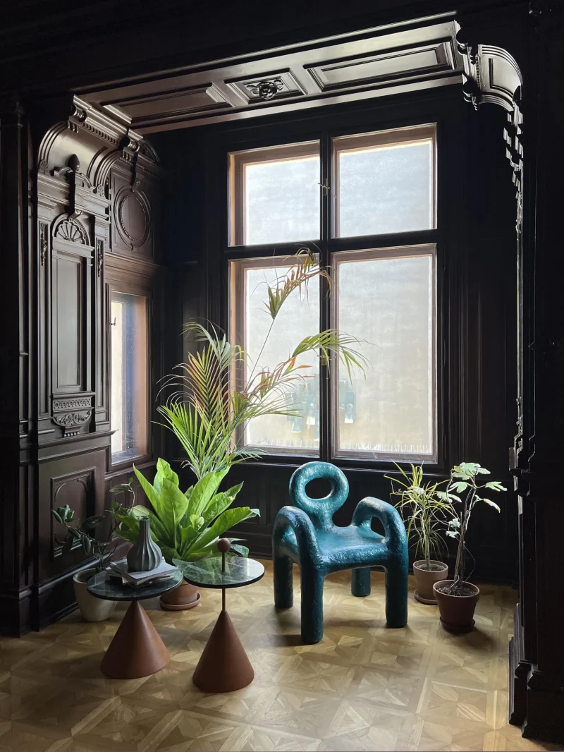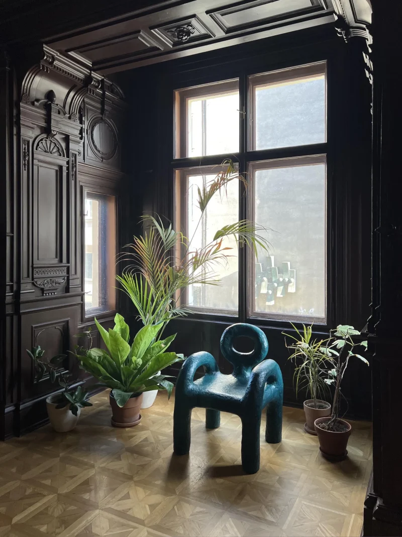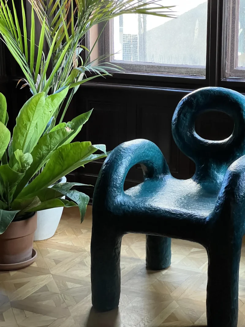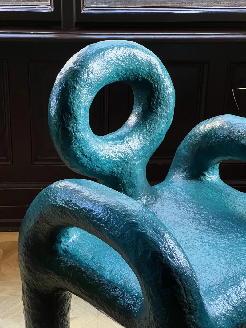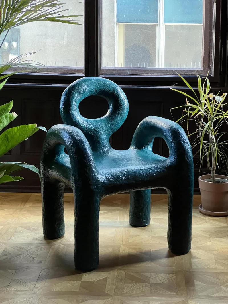 Turquoise handmade functional sculpture / chair made from shredded paper and scrap materials. Despite the unconventional material, it has sufficient load-bearing capacity and durability and is easily washable.
