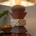 The piece is composed of stacked ceramic totem forms, hand-built and textured to reference natural landscapes, Mexican ceramic traditions, and architectural elements found in Mesoamerican ruins. The lamp is topped with a hand block-printed textile shade inspired by the mask-like facades of Uxmal, featuring abstracted eyes oriented toward the cardinal directions.