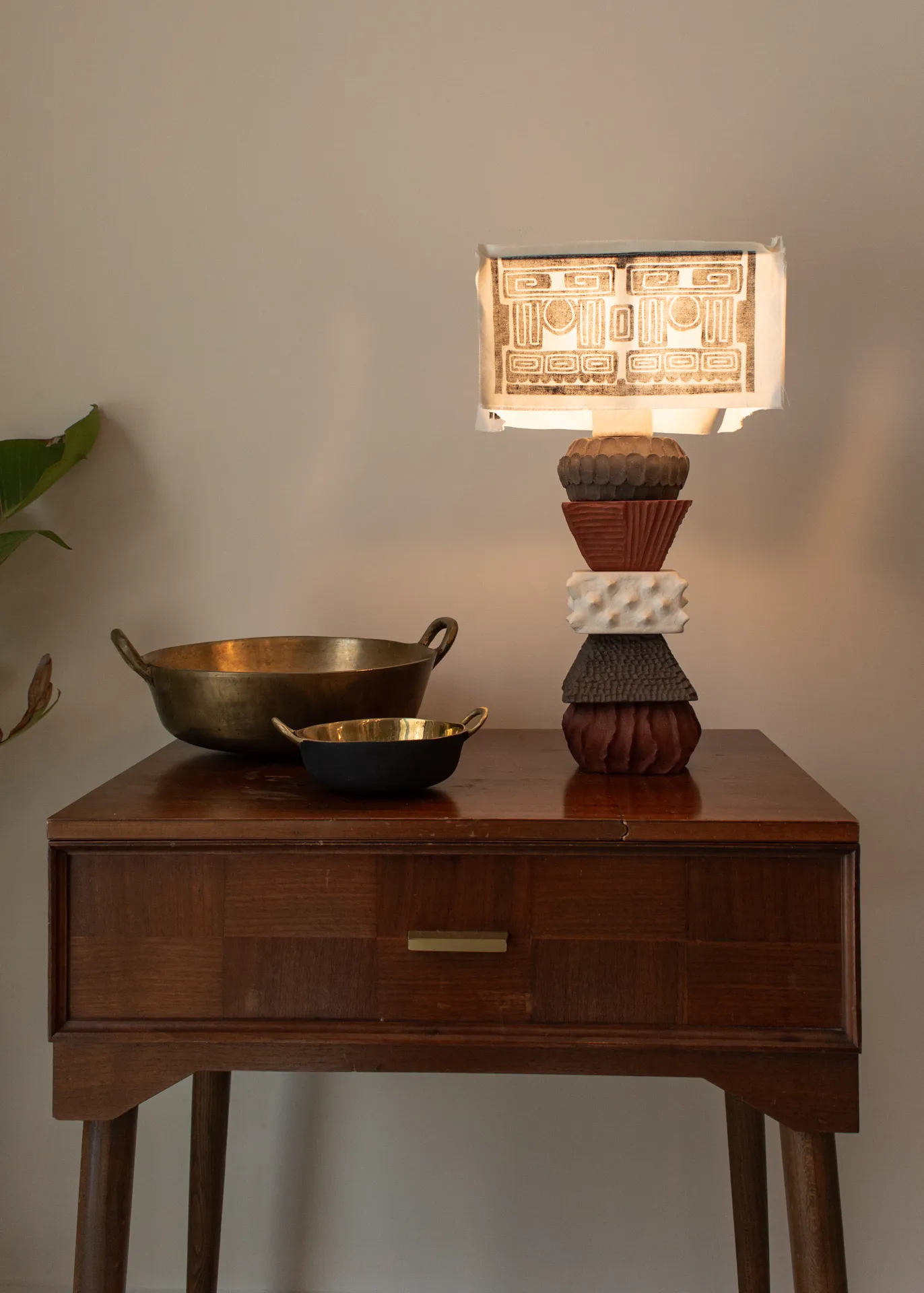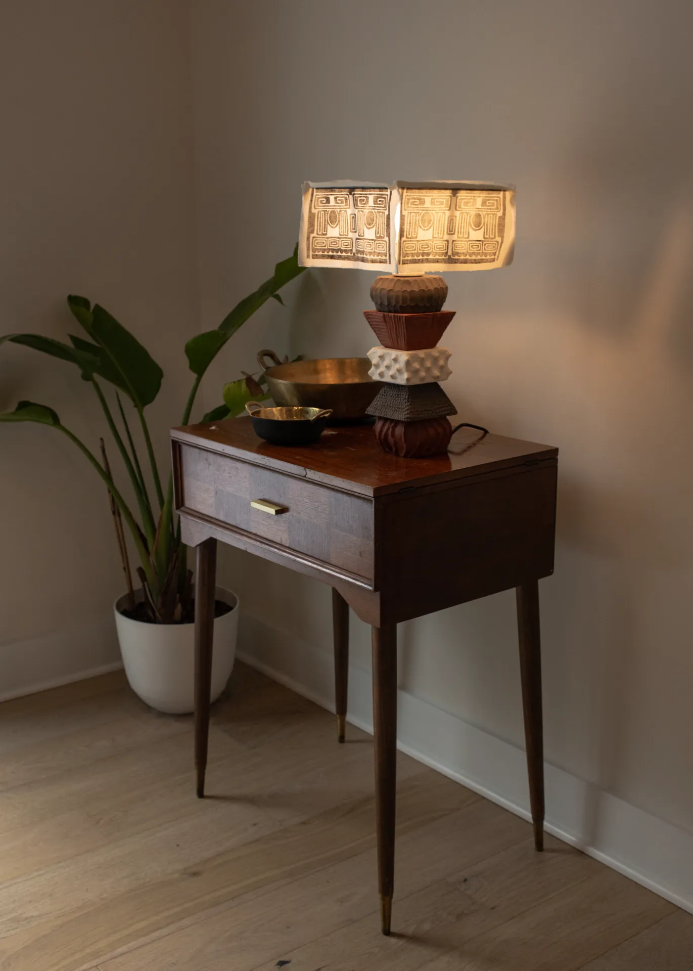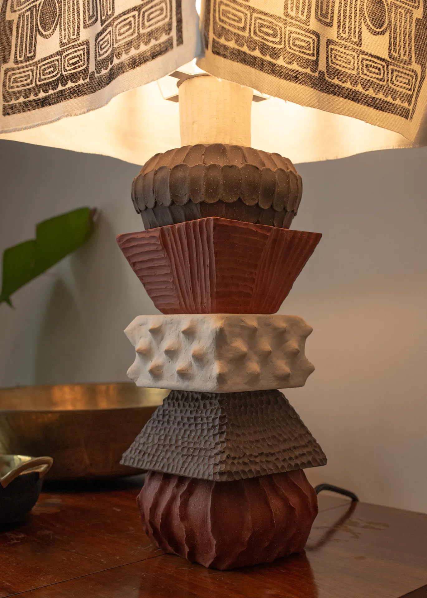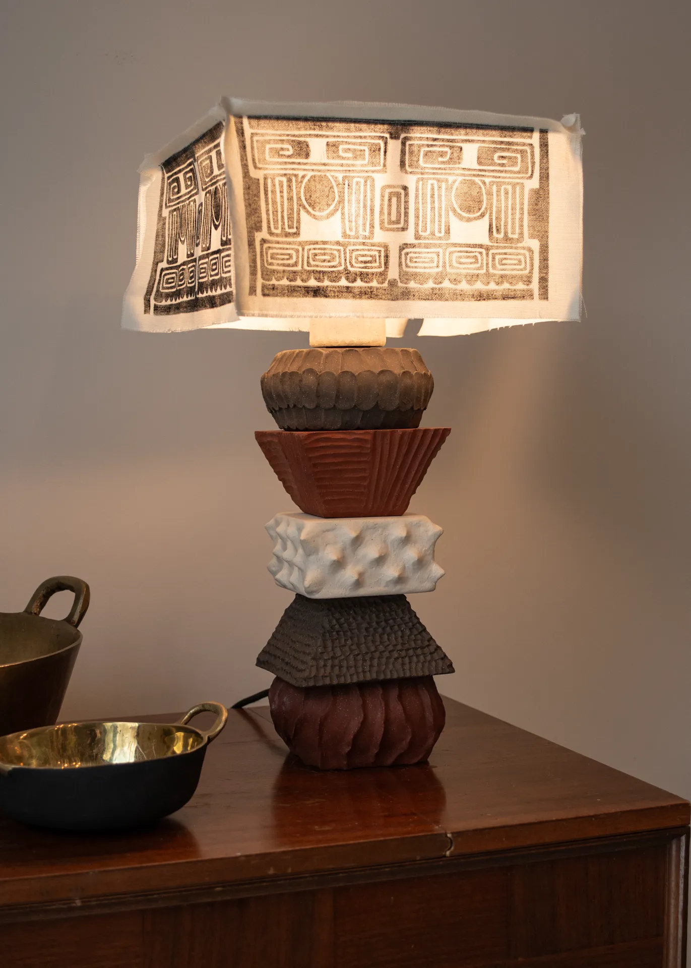 The piece is composed of stacked ceramic totem forms, hand-built and textured to reference natural landscapes, Mexican ceramic traditions, and architectural elements found in Mesoamerican ruins. The lamp is topped with a hand block-printed textile shade inspired by the mask-like facades of Uxmal, featuring abstracted eyes oriented toward the cardinal directions.