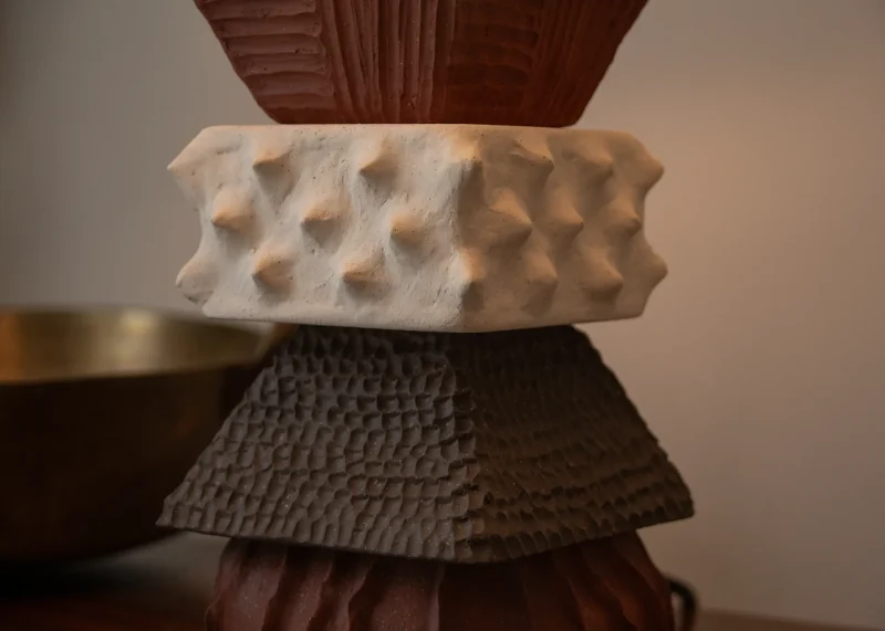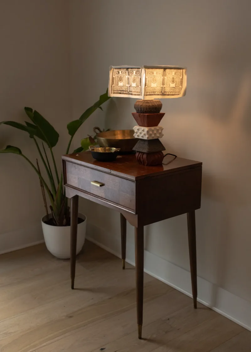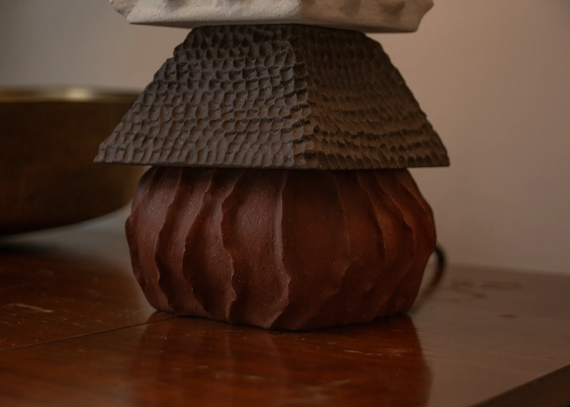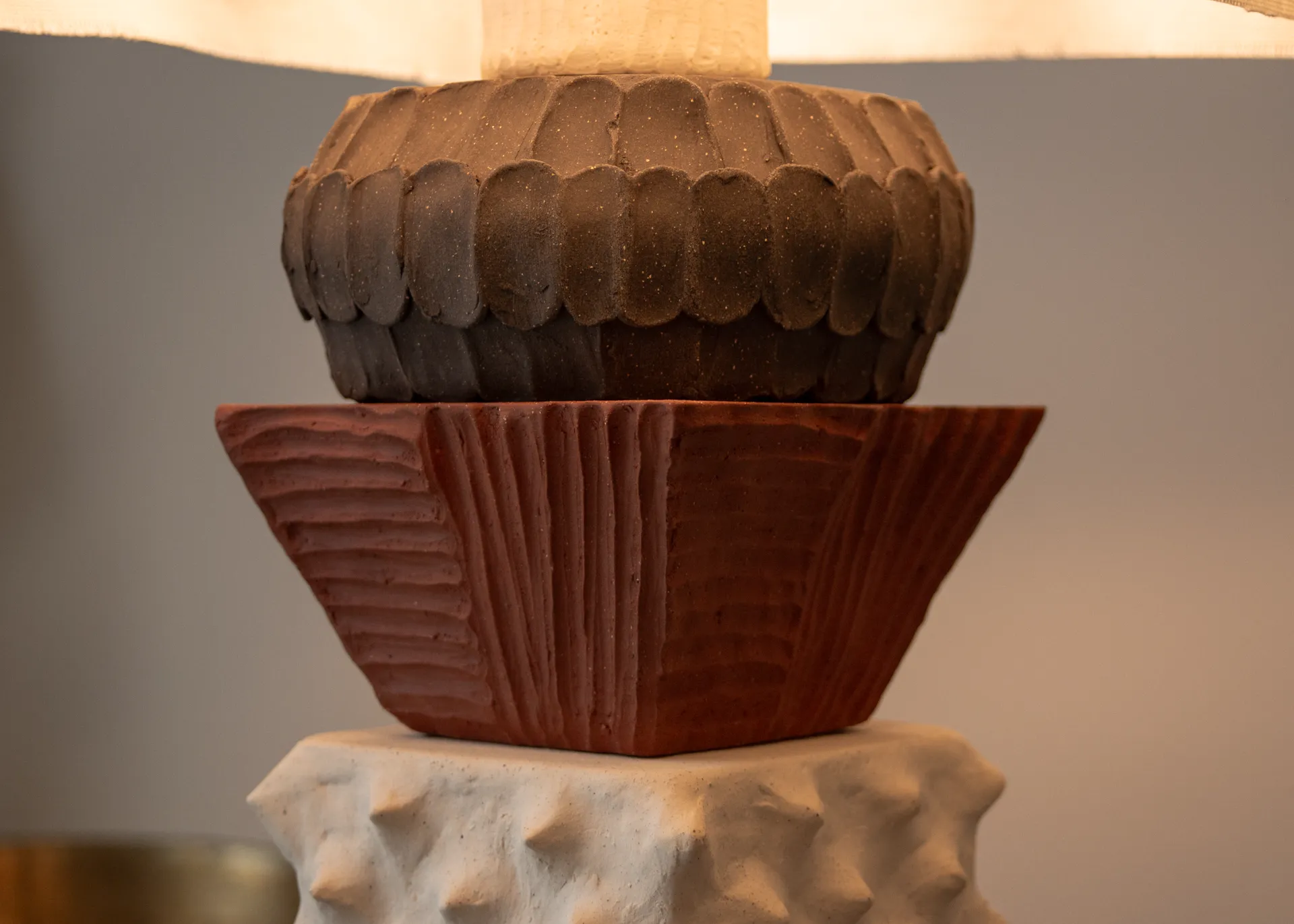 The piece is composed of stacked ceramic totem forms, hand-built and textured to reference natural landscapes, Mexican ceramic traditions, and architectural elements found in Mesoamerican ruins. The lamp is topped with a hand block-printed textile shade inspired by the mask-like facades of Uxmal, featuring abstracted eyes oriented toward the cardinal directions.