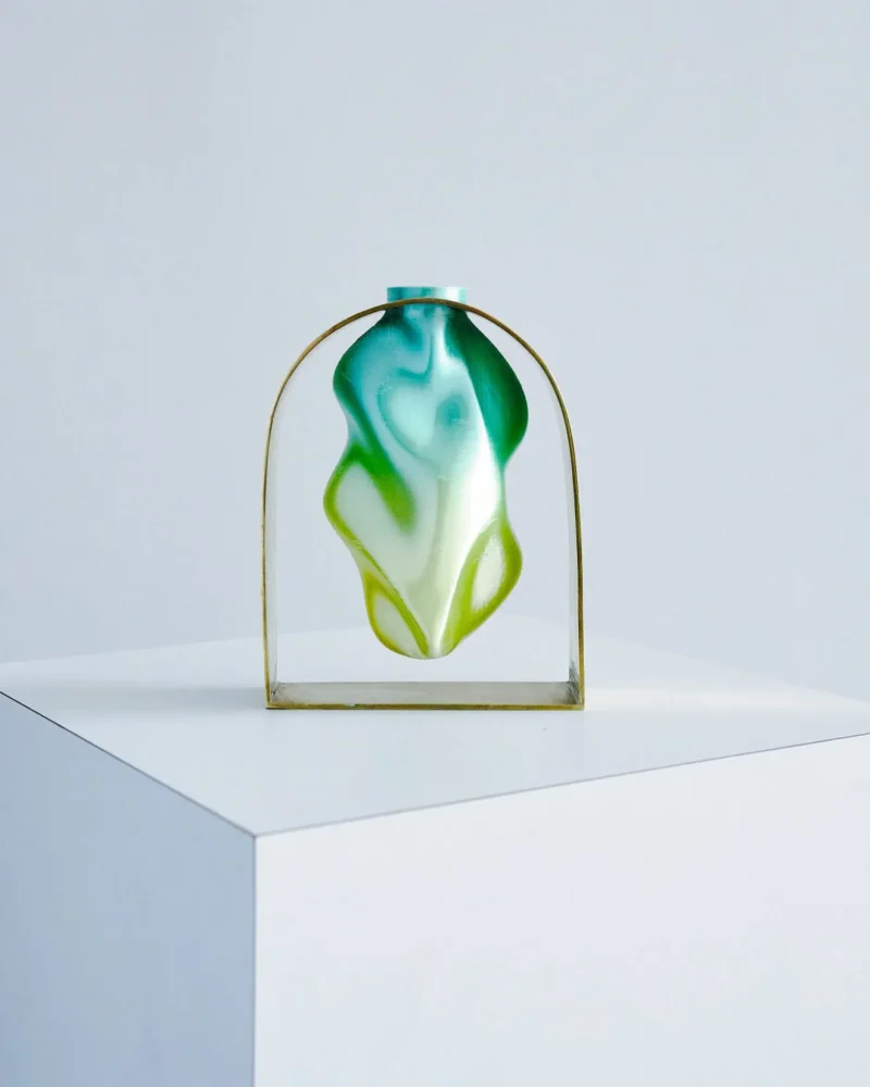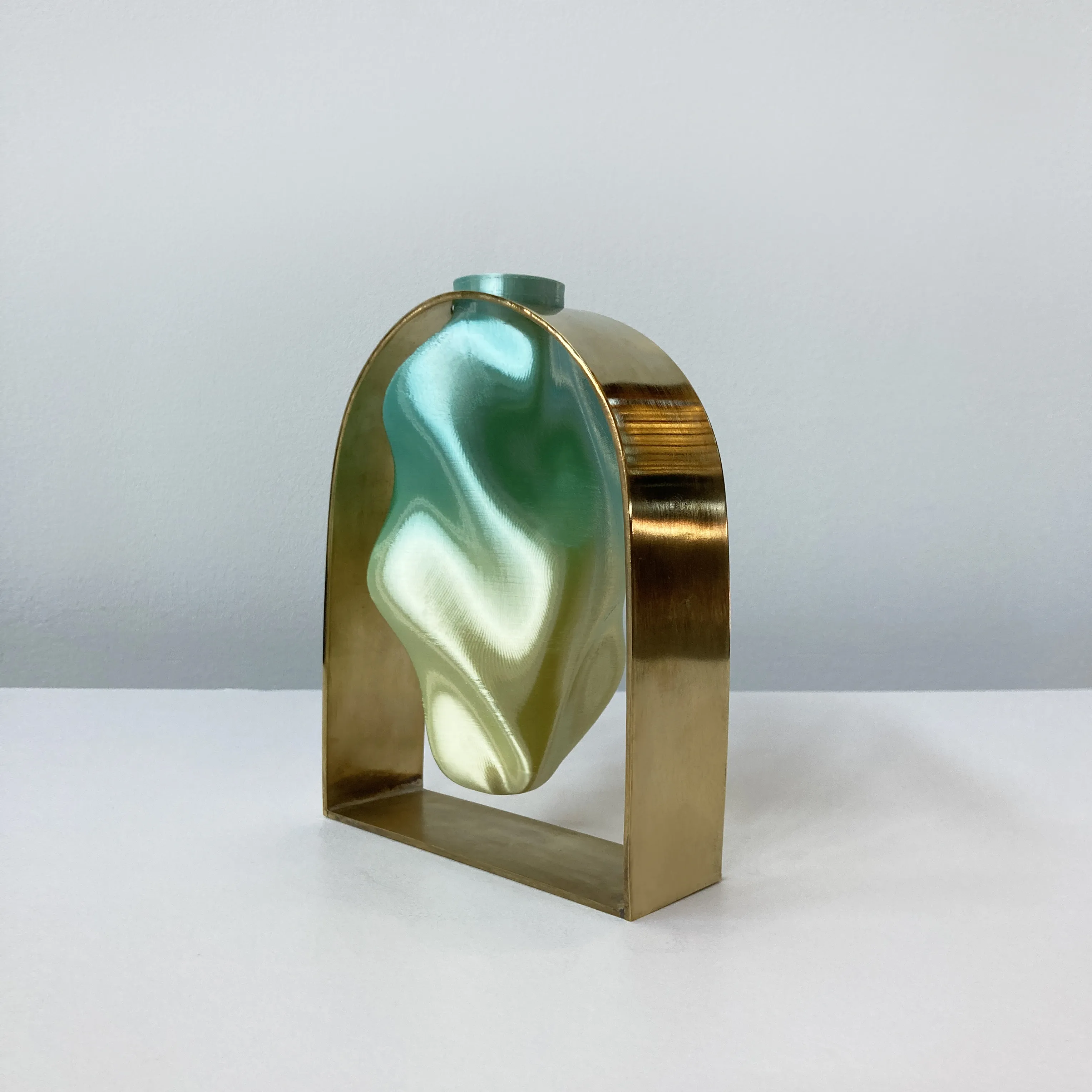 Organically shaped Vase floating within a polished brass frame. 3D printed in silky pastel rainbow filament, looks magical in your room,