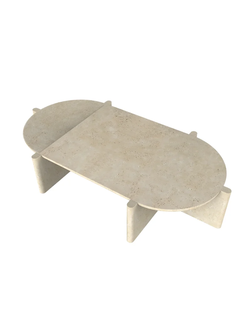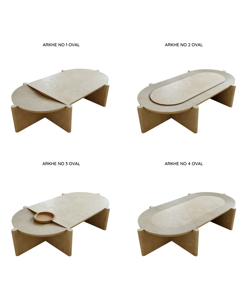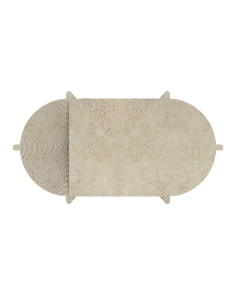 Arkhe No. 1 coffee table in oval version marries functionality with refined artistry. Hand-carved from blocks of unfilled travertine, the table’s raw textures and subtle imperfections evoke the weathered stone of ancient ruins. Its minimalist geometry and grounded posture create a serene dialogue between object and space—a quiet monument for the modern home.