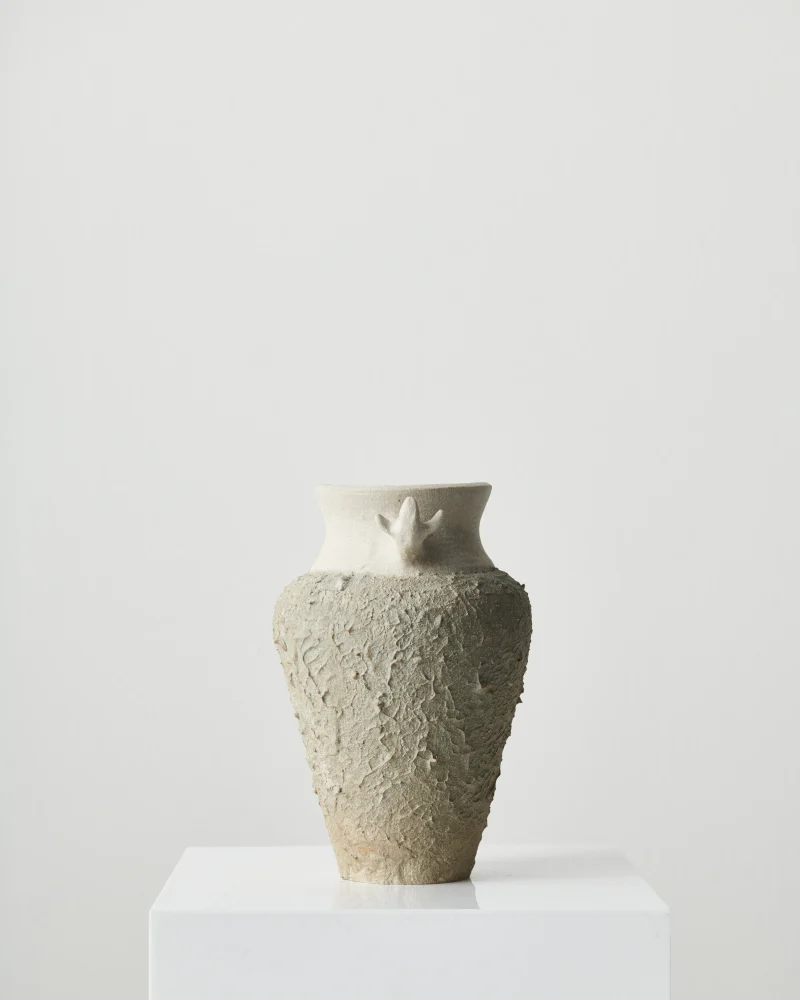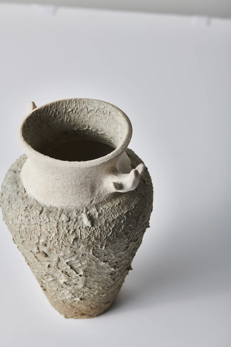 Thrown on the wheel by Twig & Beetle, in a stony white clay body. Post-wheel a slip mixed with oxide was applied creating a wave-like texture. Handles were sculpted by hand and aligned by eyesight, mimicking antlers.