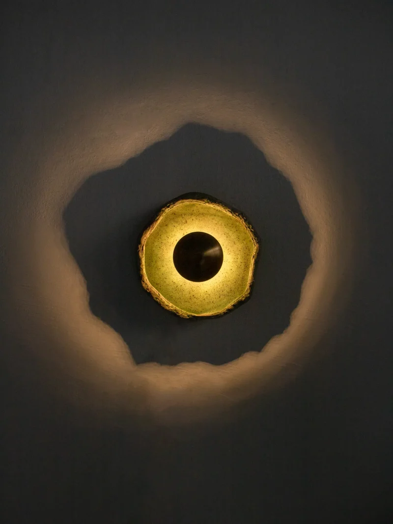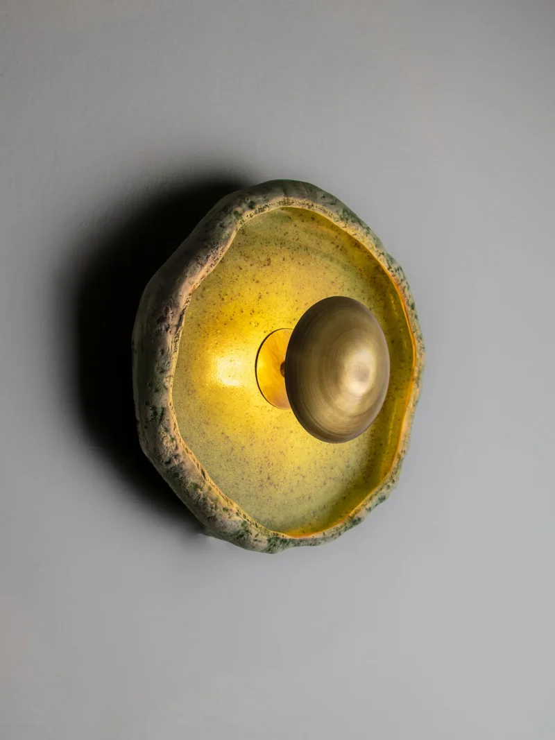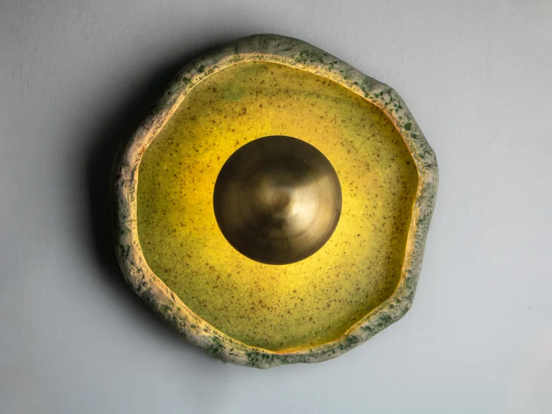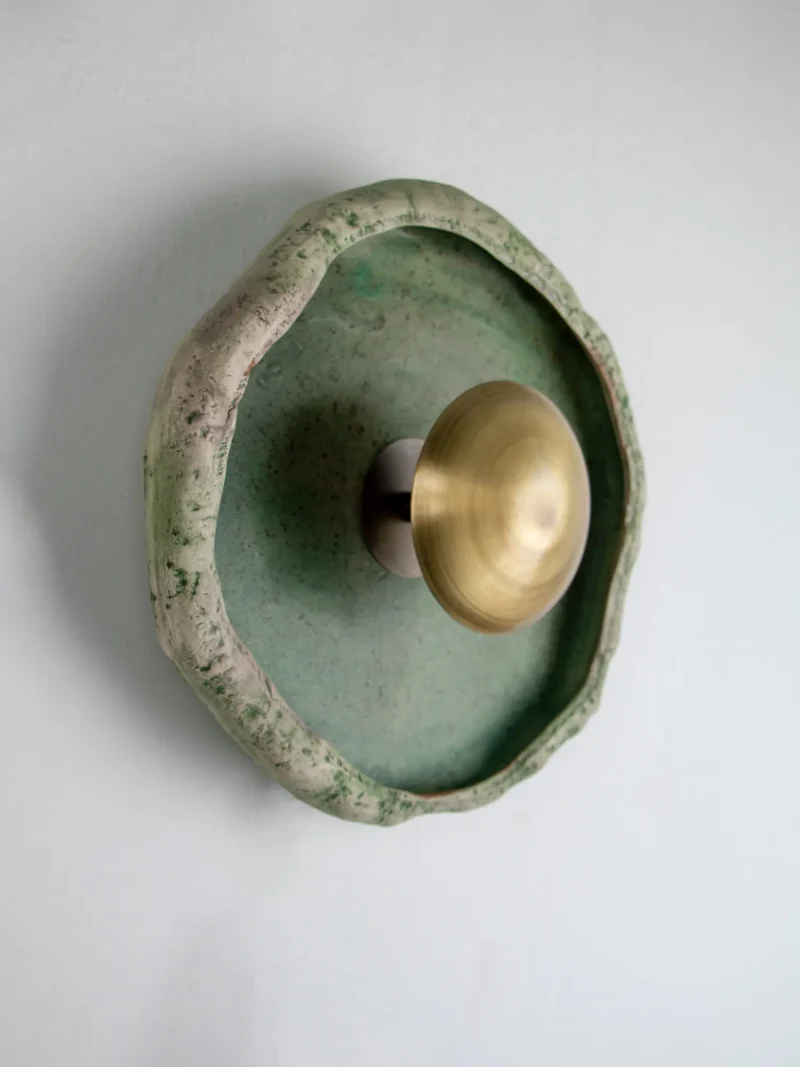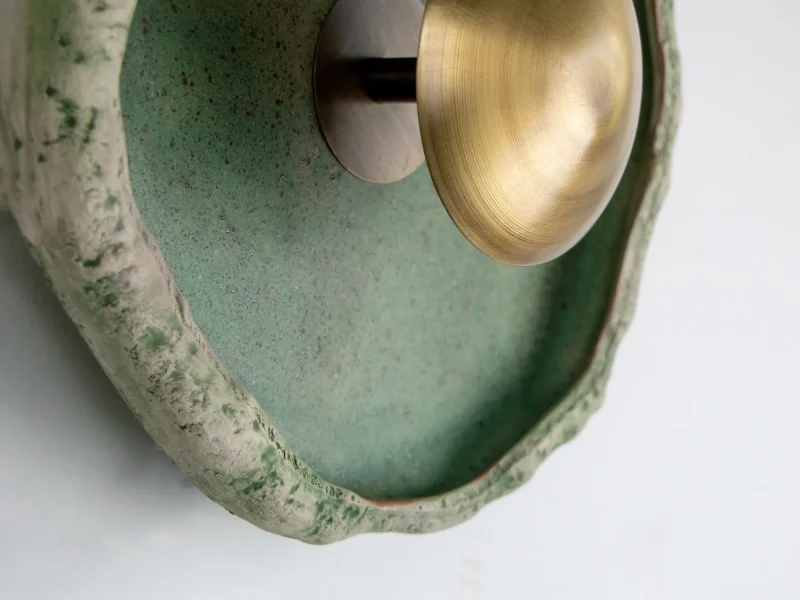 This piece is handmade and built from stoneware and brass. LED light.