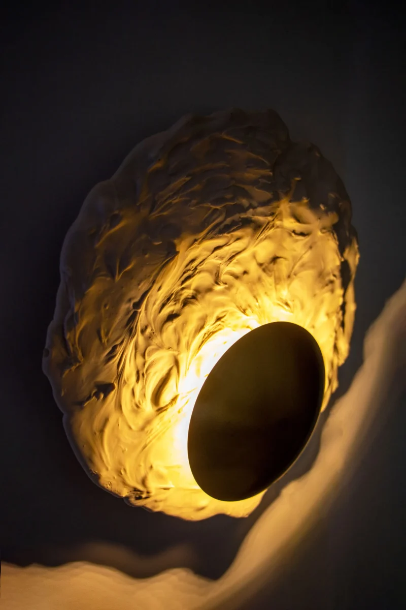 This piece is handmade and built from stoneware. One of a kind. LED light.