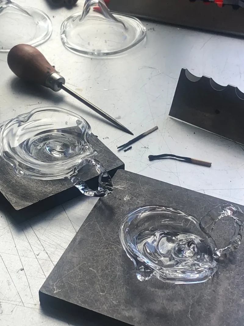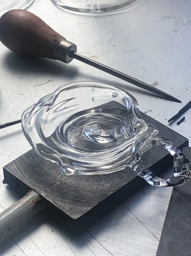 This piece by Rain and Rivers is an individual ashtray made using resistant borosilicate glass, as a part of the ongoing series “rain and rivers” which explores the fluidity of water through fire practices.