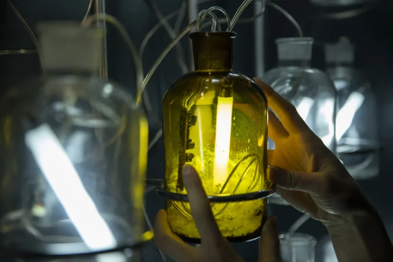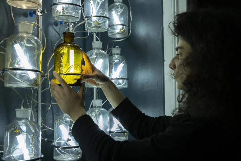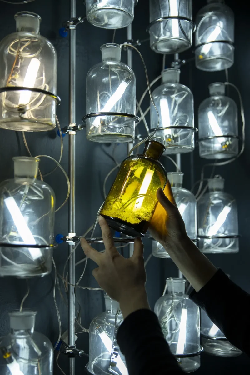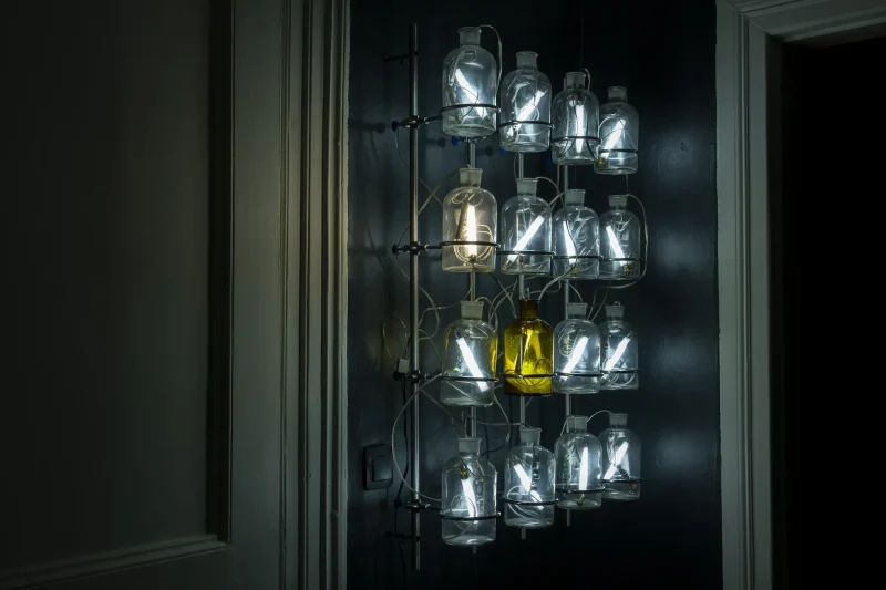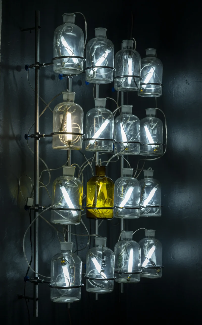 Enclosed within a laboratory-style specimen jar, a tinted T4 fluorescent tube glows as a relic of obsolete technology. The piece echoes both scientific preservation practices and museological display strategies. By isolating the fluorescent in a sealed environment, it highlights its transition from an everyday light source to a fragile, archival object.