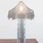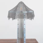 with light, crowned with a fluid metallic drapery woven from chainmail. Like