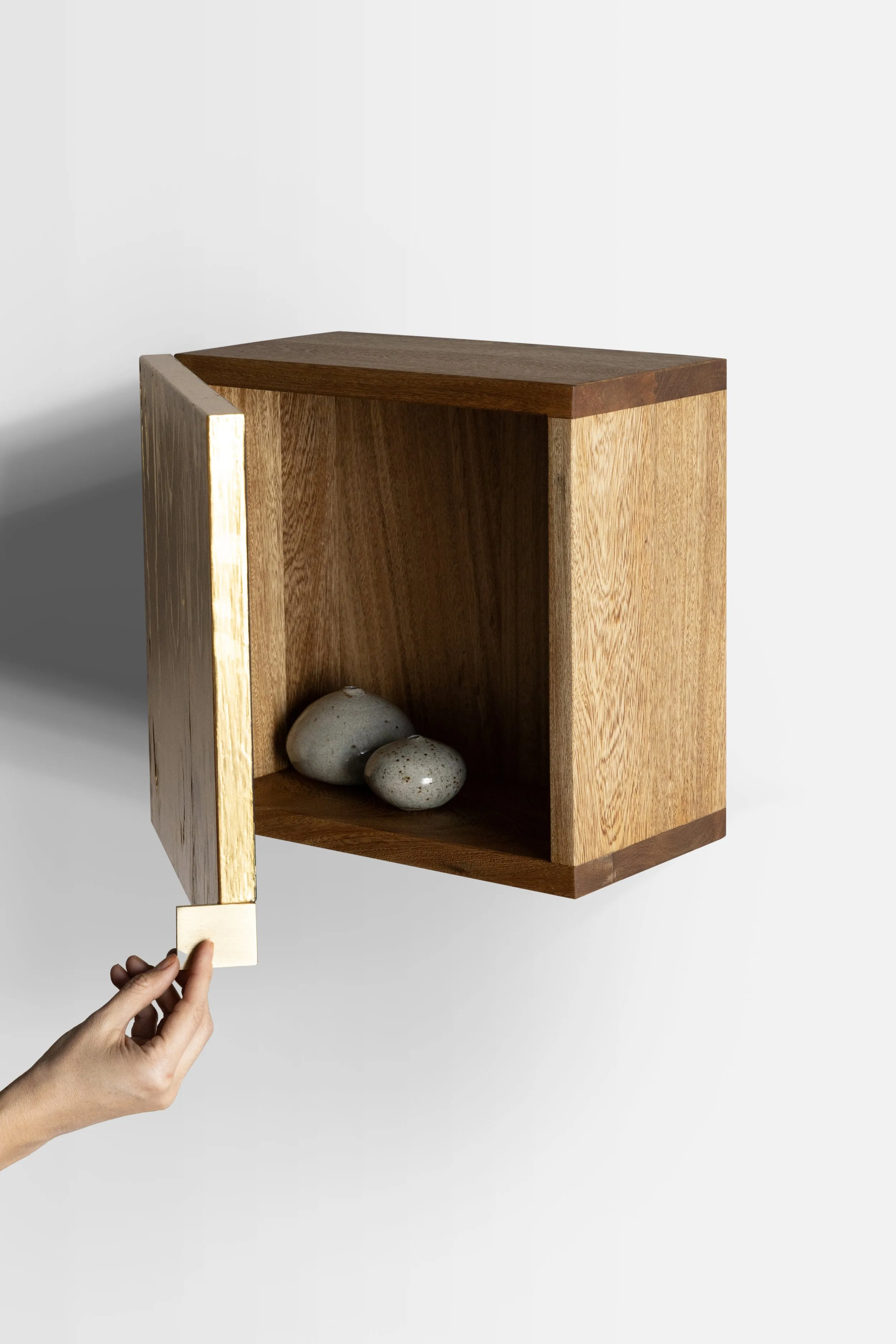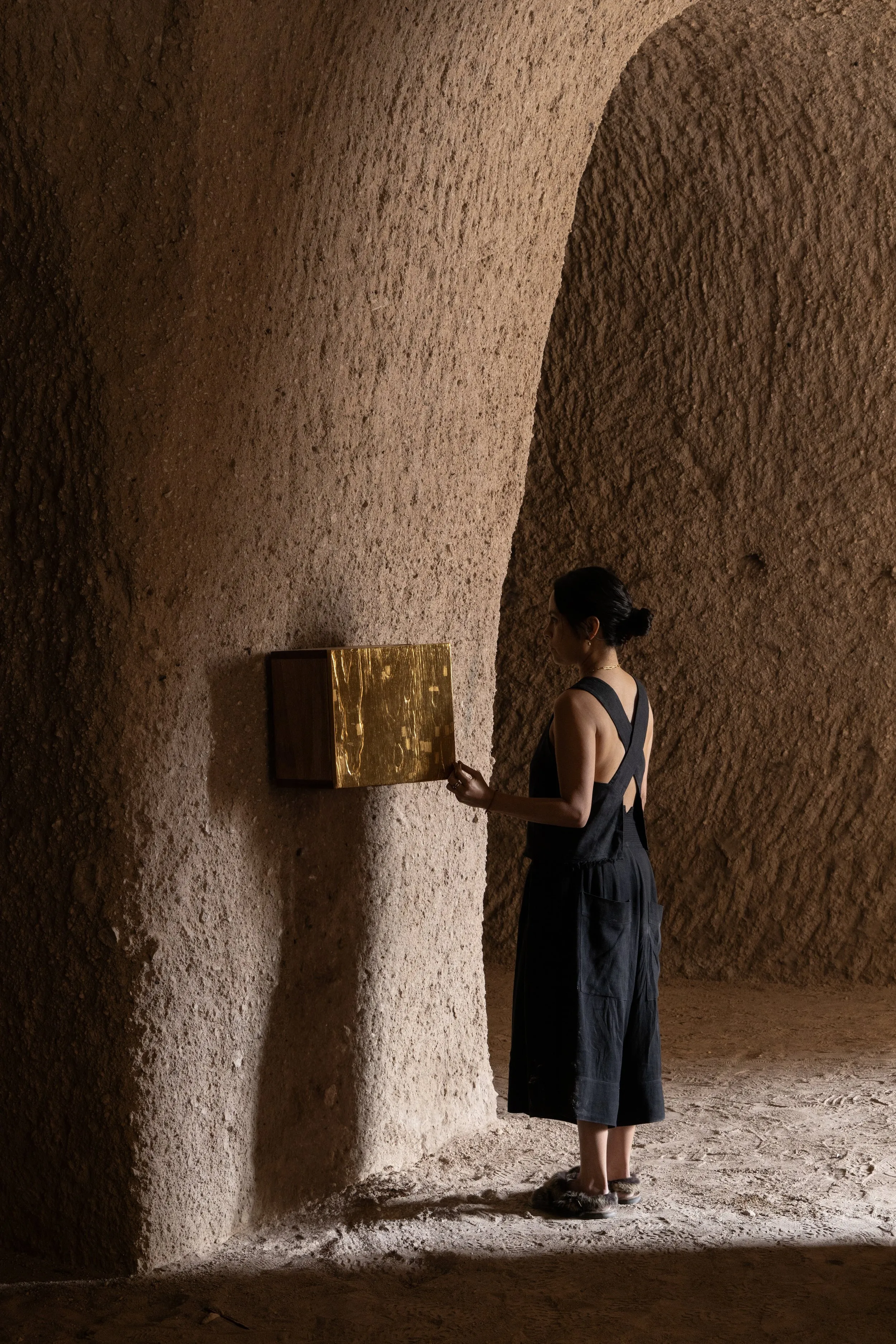 Through an intricate process, sandblasted wood’s unique grain is hand-covered with 23-carat gold leaf, achieving a radiant glow reminiscent of the sun. The pieces symbolize mysticism and transform spaces into captivating spectacles of light and shadow.