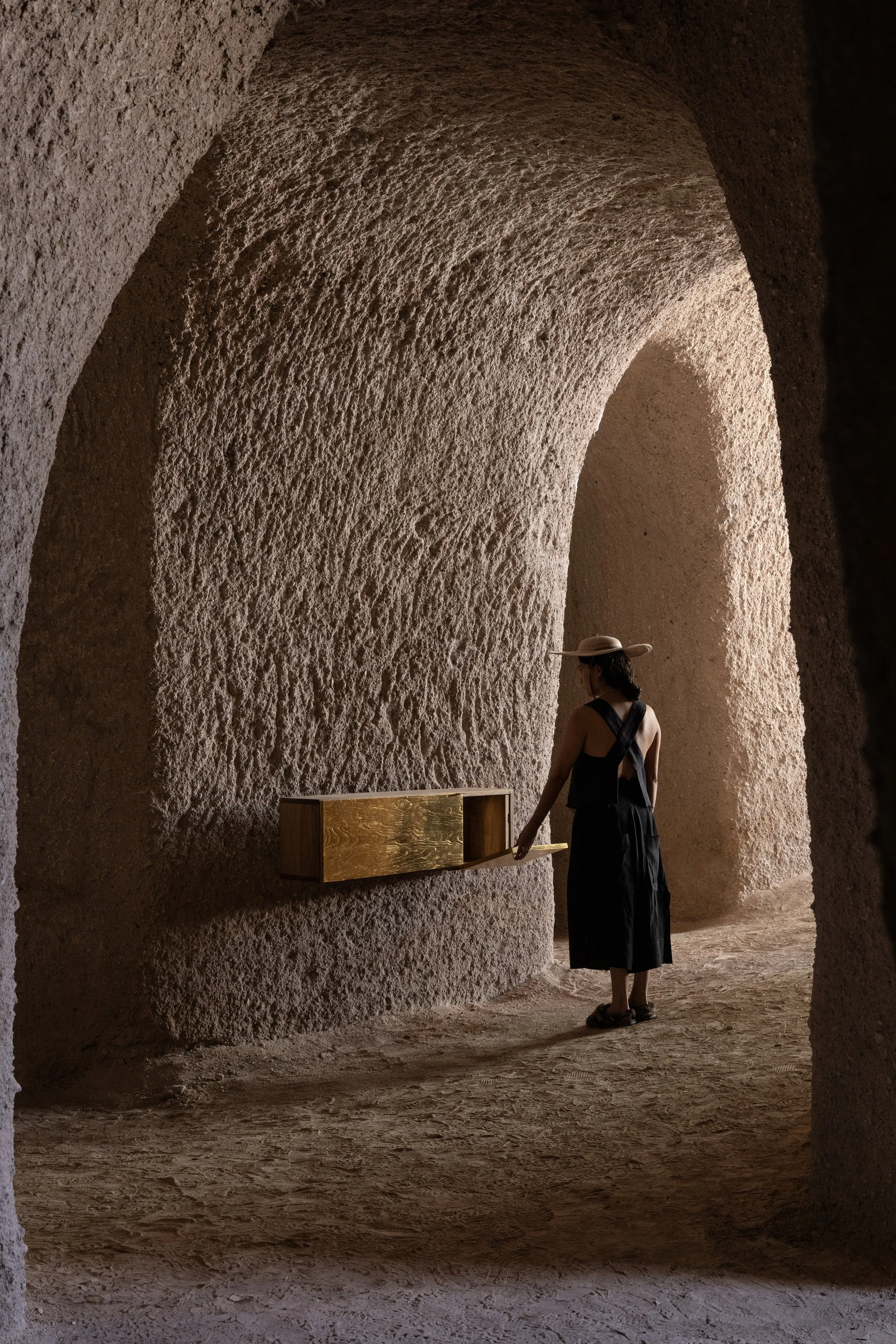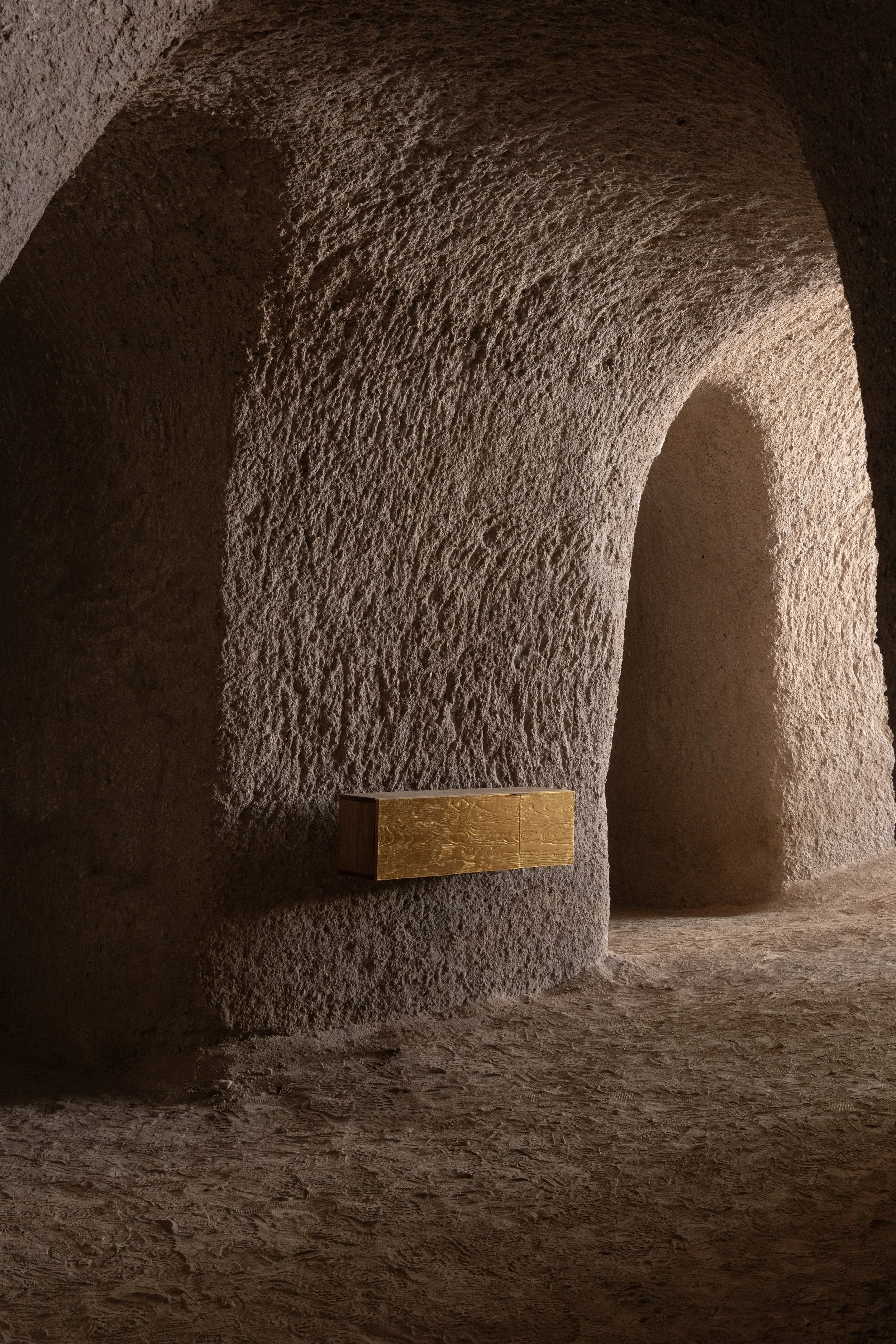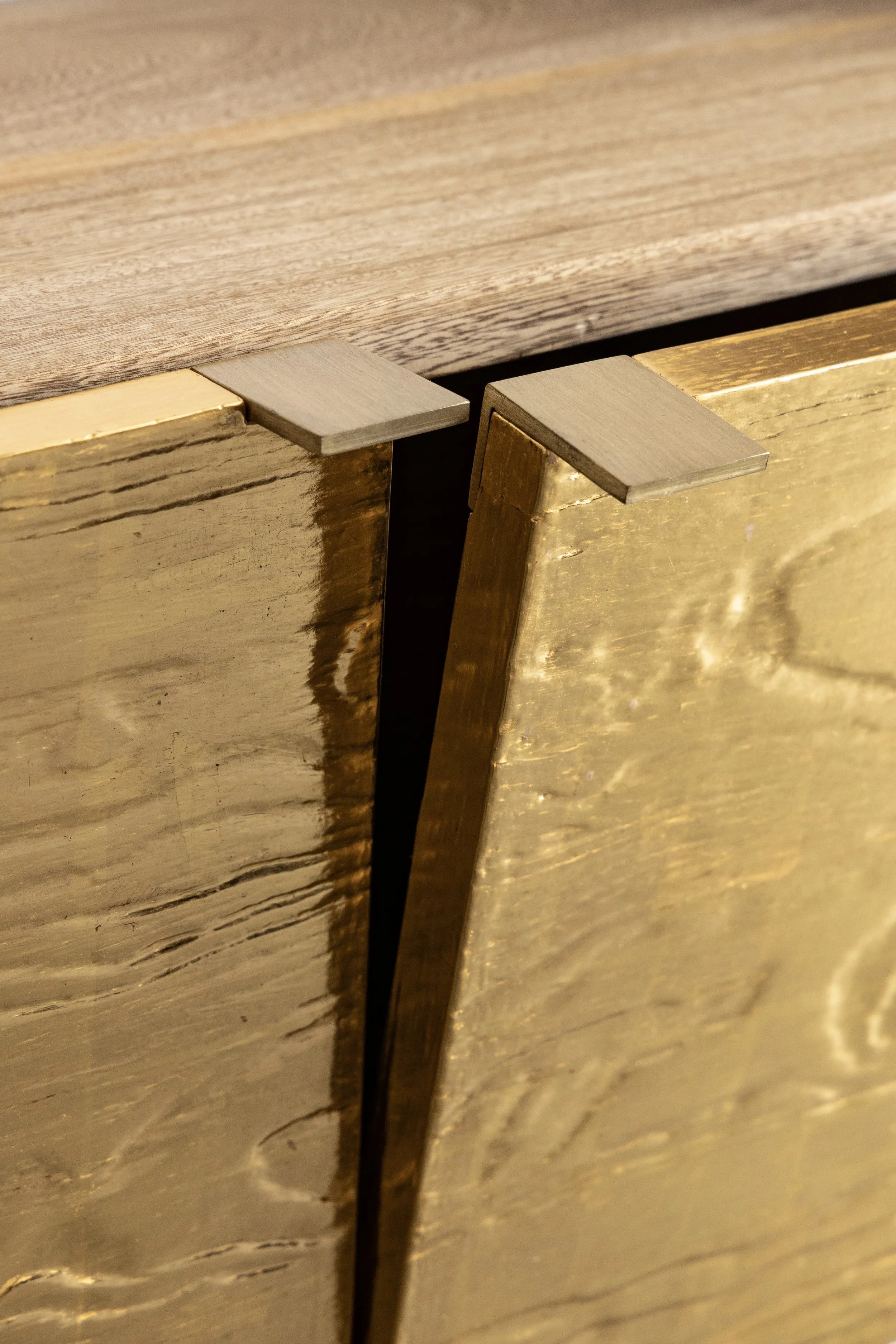 Through an intricate process, sandblasted wood’s unique grain is hand-covered with 23-carat gold leaf, achieving a radiant glow reminiscent of the sun. The pieces symbolize mysticism and transform spaces into captivating spectacles of light and shadow.