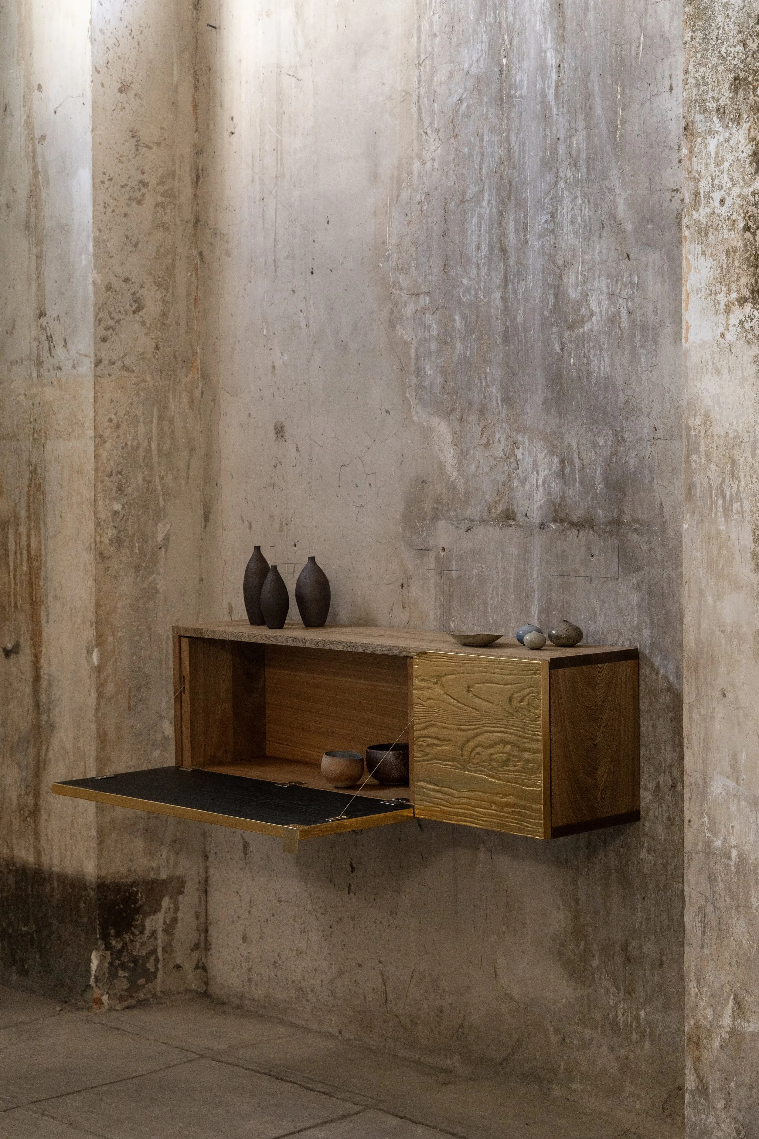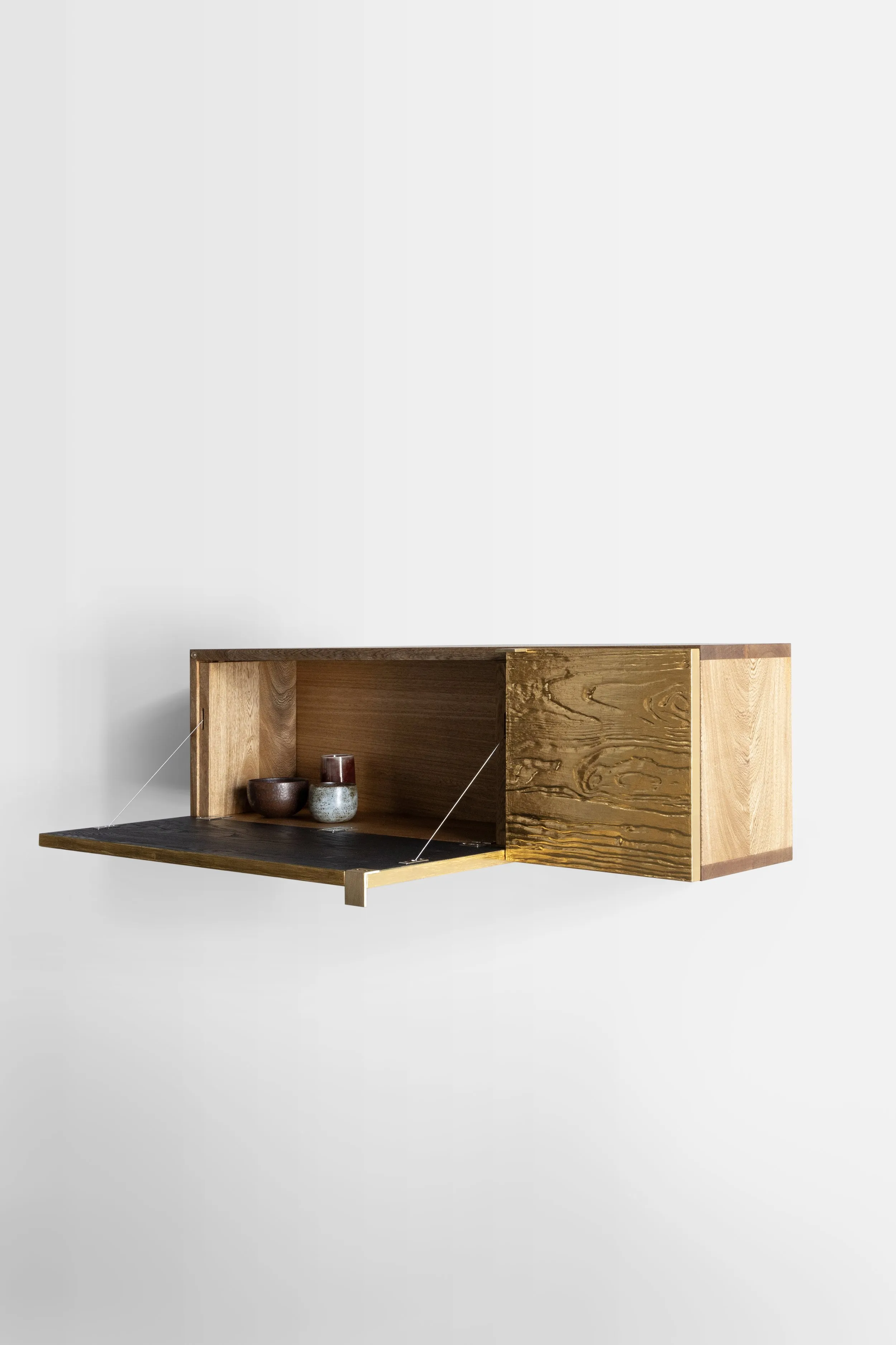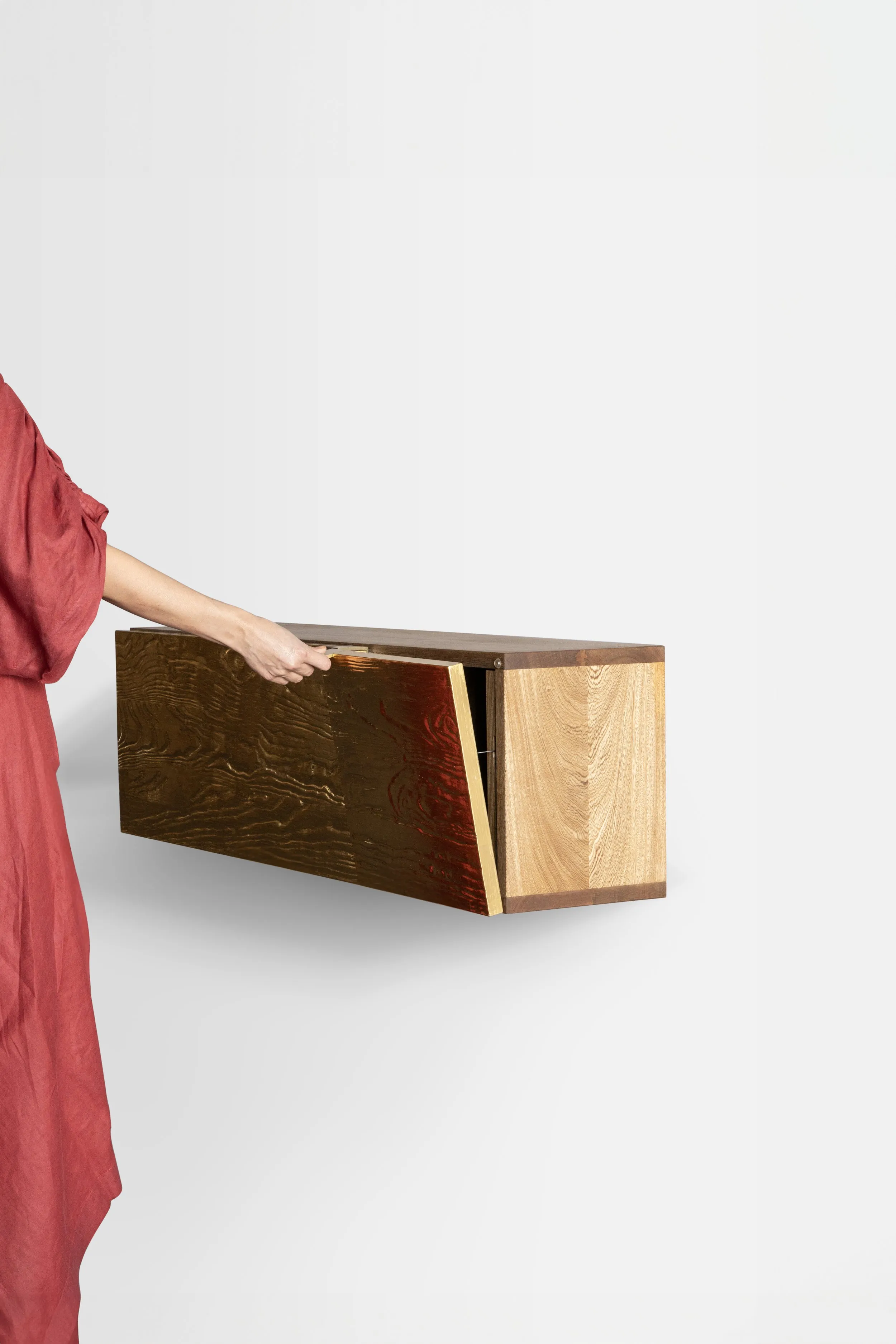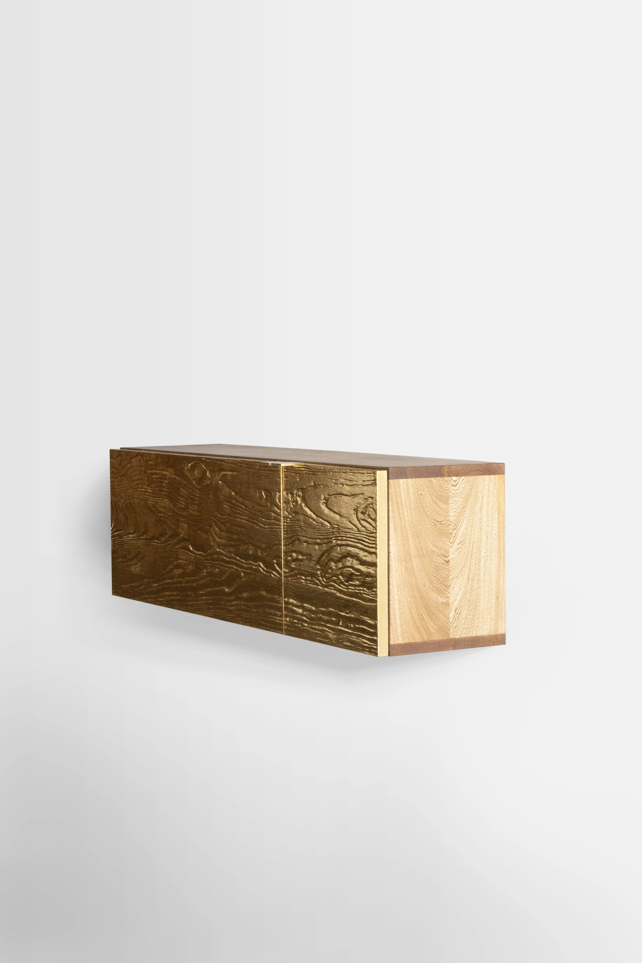 Through an intricate process, sandblasted wood’s unique grain is hand-covered with 23-carat gold leaf, achieving a radiant glow reminiscent of the sun. The pieces symbolize mysticism and transform spaces into captivating spectacles of light and shadow.