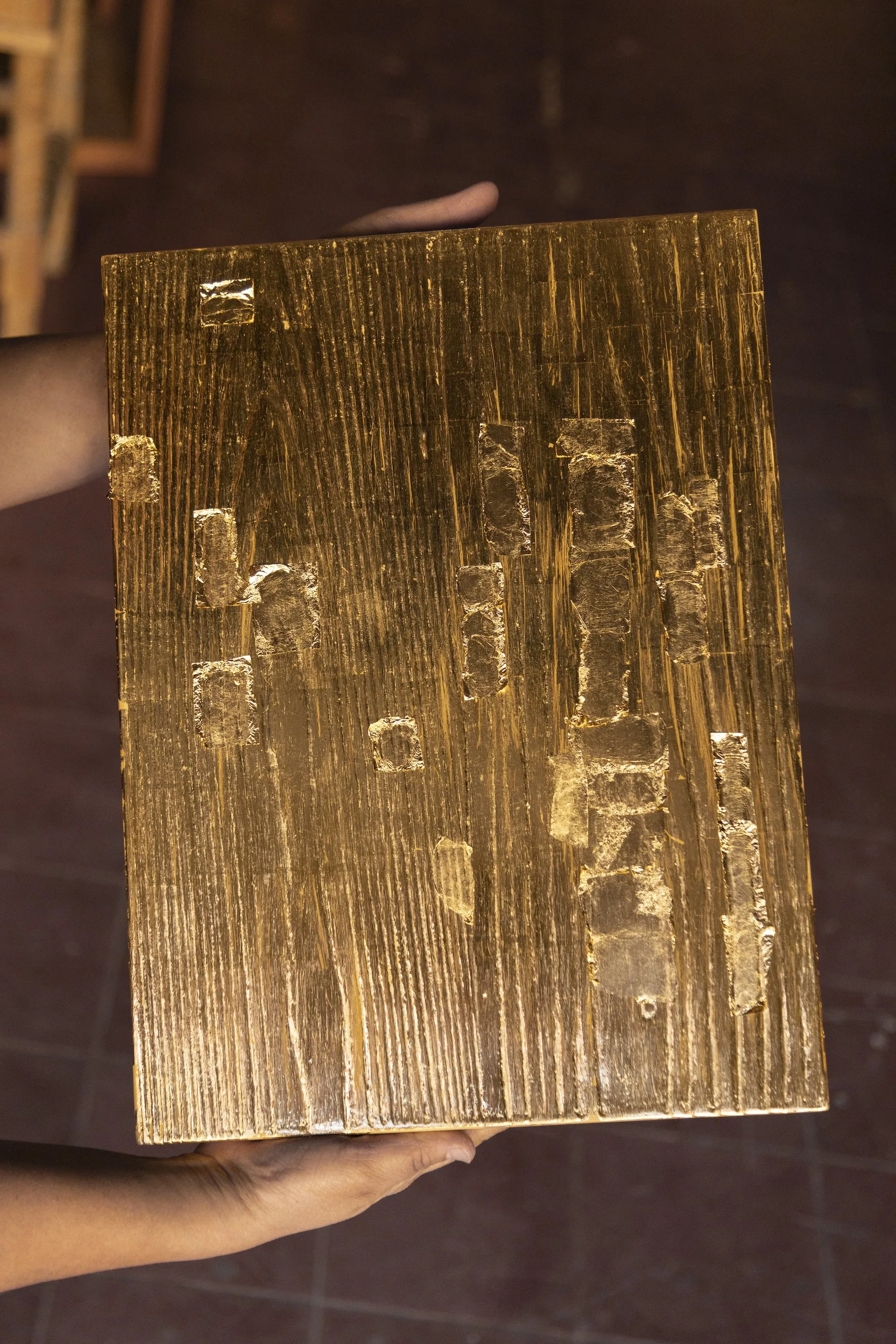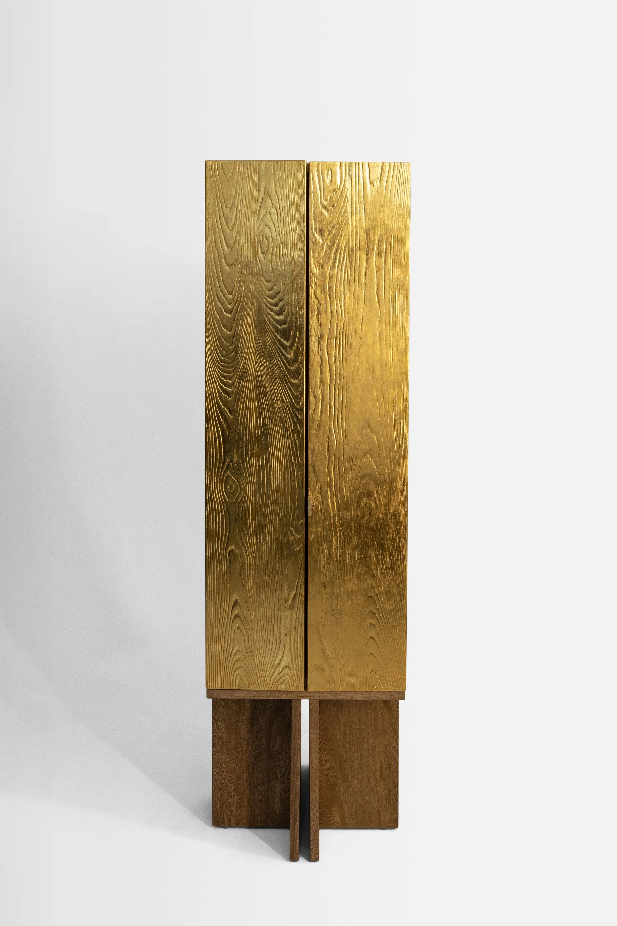 Each piece was made using traditional techniques by talented craftspeople. Quality materials, like sandblasted wood and 23-carat gold leaf, are fundamental to the pieces. Wood holds a tree’s history in its rings. Gold represents the sun, mysticism, and immortality. The cabinets are the same height but different dimensions and have hinged doors that create symmetry or asymmetry against modular legs. The cabinets transform environments through light and shadows contrasted against clean lines.
