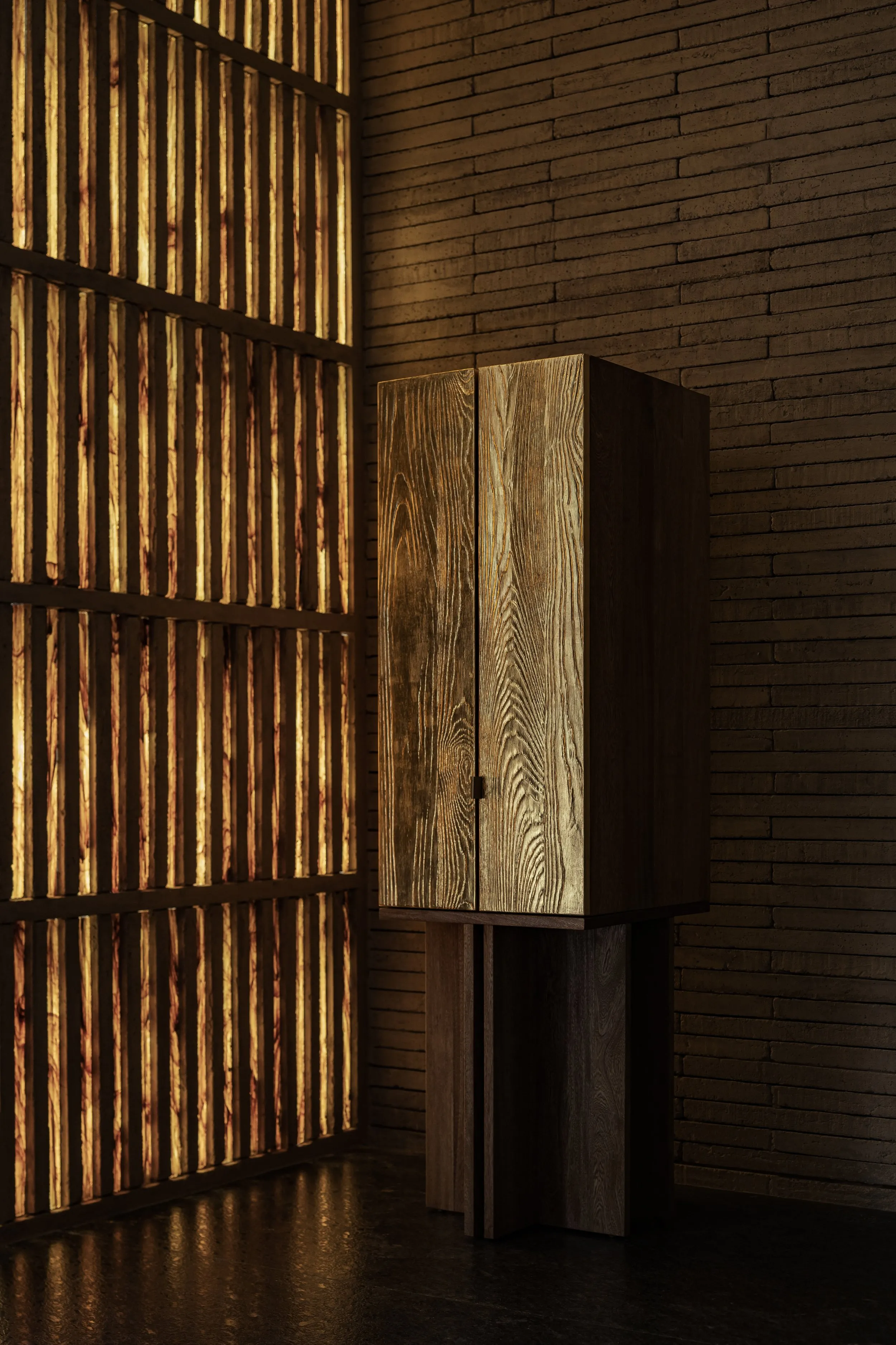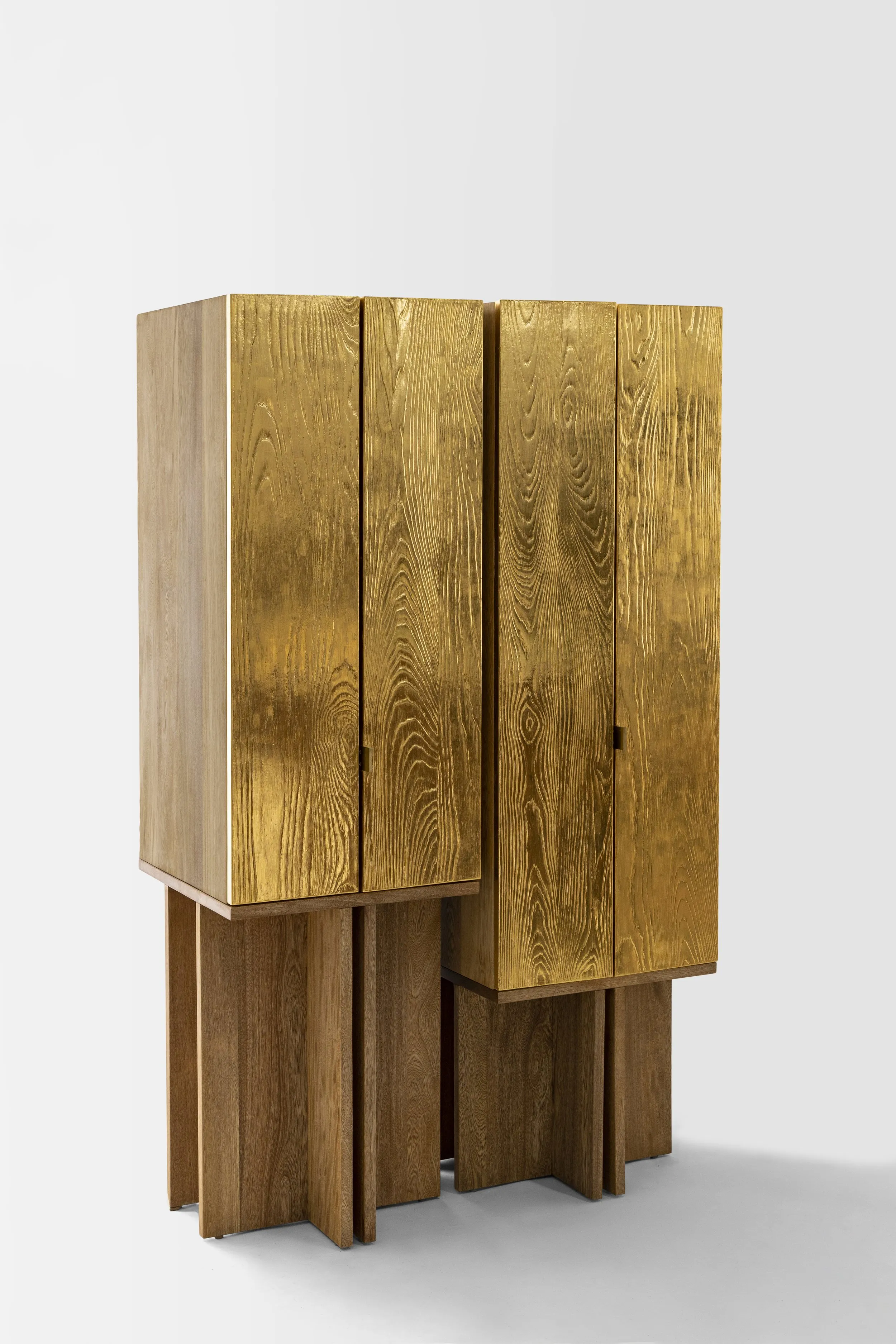 Each piece was made using traditional techniques by talented craftspeople. Quality materials, like sandblasted wood and 23-carat gold leaf, are fundamental to the pieces. Wood holds a tree’s history in its rings. Gold represents the sun, mysticism, and immortality. The cabinets are the same height but have different dimensions and have hinged doors that create symmetry or asymmetry against modular legs. The cabinets transform environments through light and shadows contrasted against clean lines.