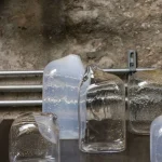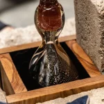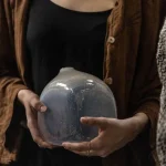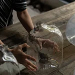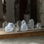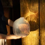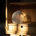 The result: unique pieces subtly printed with the texture of the wooden mold. Inside the glass: fragments of gold distributed like stars in an expanding universe.