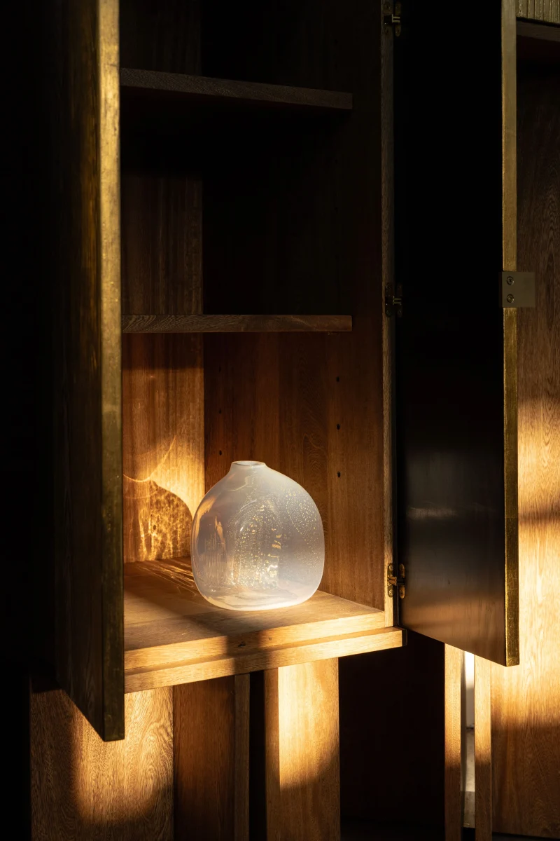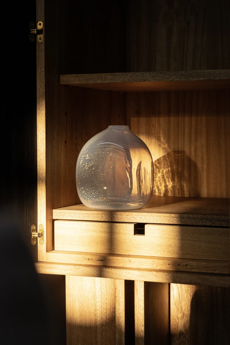 The result: unique pieces subtly printed with the texture of the wooden mold. Inside the glass: fragments of gold distributed like stars in an expanding universe.