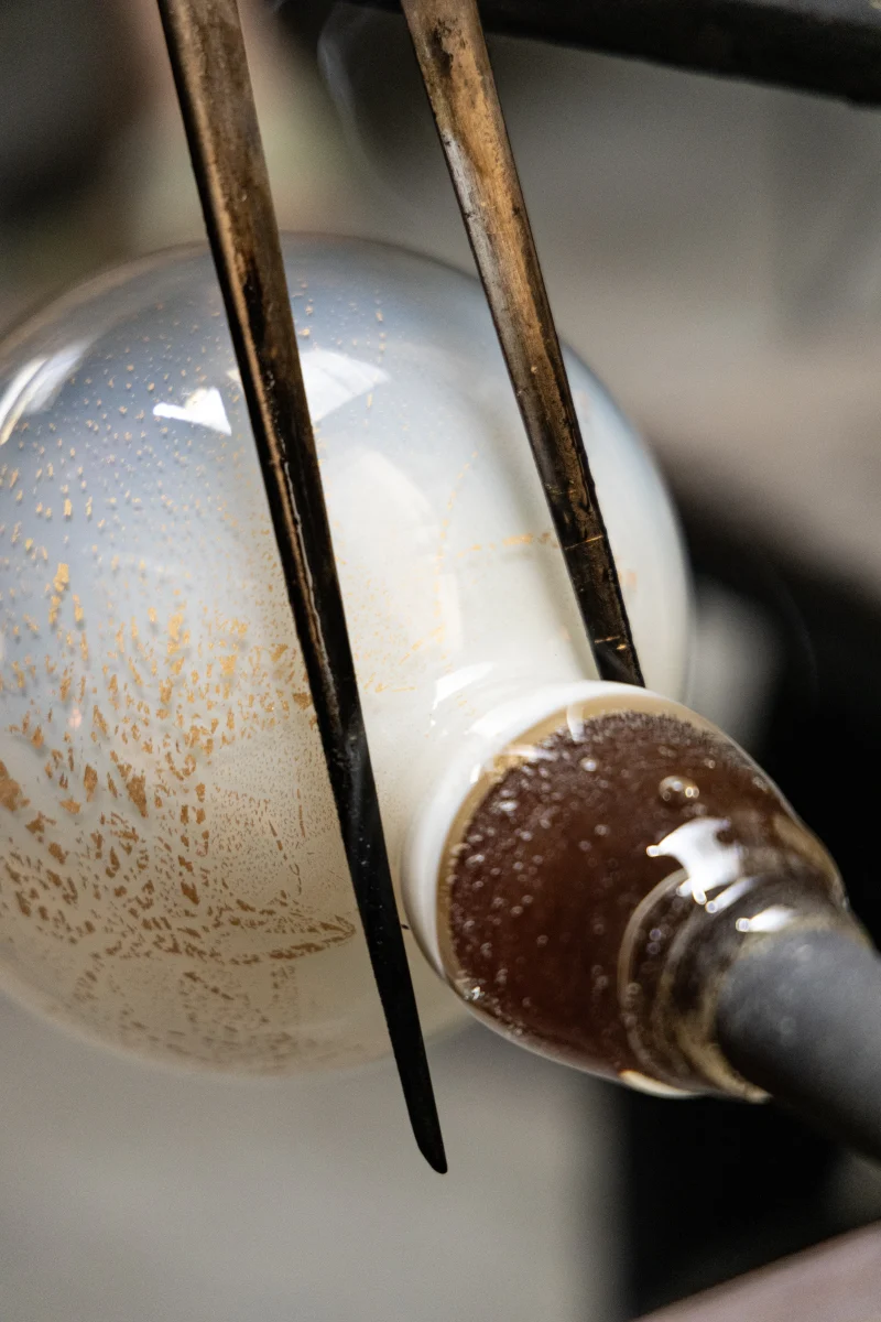 Through careful experimentation of the traditional glass-blowing technique, the vases were fused with very fine sheets of 23-karat gold, which fragmented and expanded during the blowing process, as if cosmically, forming tiny constellations dictated by the whims