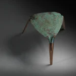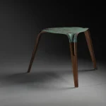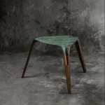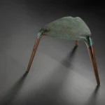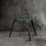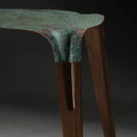 The structure of the auxiliary table is meticulously crafted using solid walnut wood, ensuring durability and strength. The tabletop is expertly manufactured with oxidized and hammered copper, showcasing a unique and textured surface. The use of solid walnut provides stability and a natural aesthetic appeal, while the oxidized and hammered copper adds a distinct visual element, capturing attention with its rustic and handcrafted charm. The combination of these materials results in a technologically sophisticated piece that seamlessly blends traditional craftsmanship with modern design.