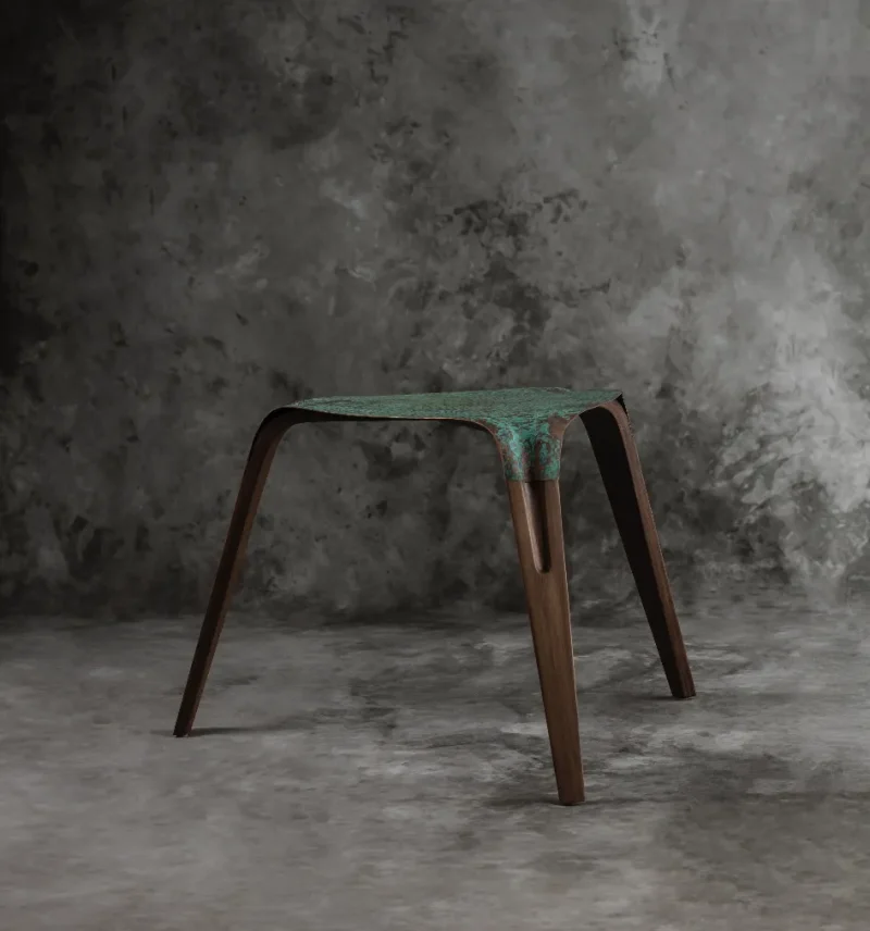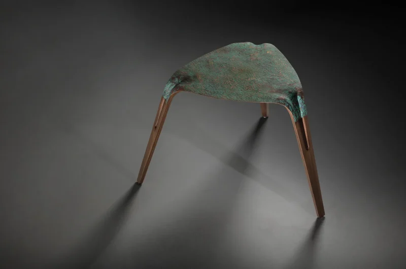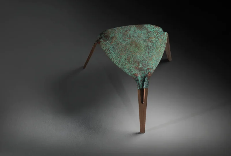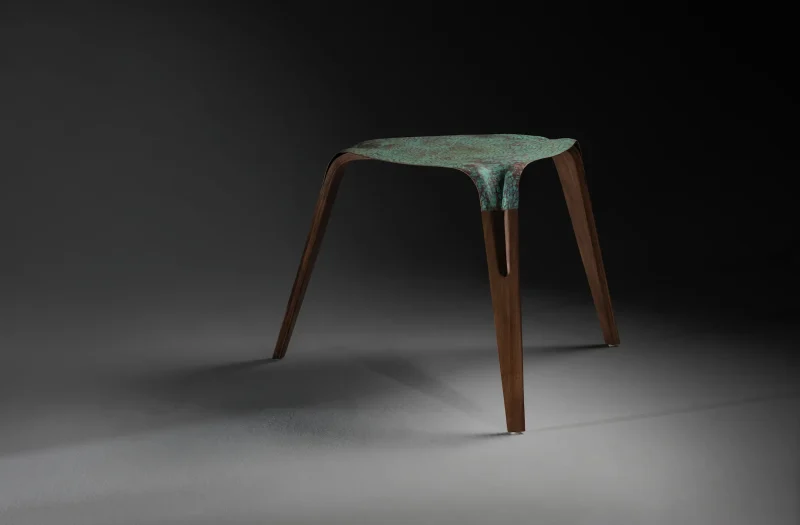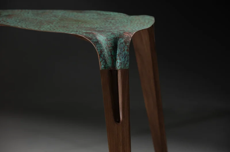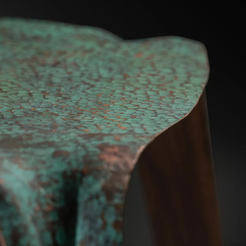 The structure of the auxiliary table is meticulously crafted using solid walnut wood, ensuring durability and strength. The tabletop is expertly manufactured with oxidized and hammered copper, showcasing a unique and textured surface. The use of solid walnut provides stability and a natural aesthetic appeal, while the oxidized and hammered copper adds a distinct visual element, capturing attention with its rustic and handcrafted charm. The combination of these materials results in a technologically sophisticated piece that seamlessly blends traditional craftsmanship with modern design.