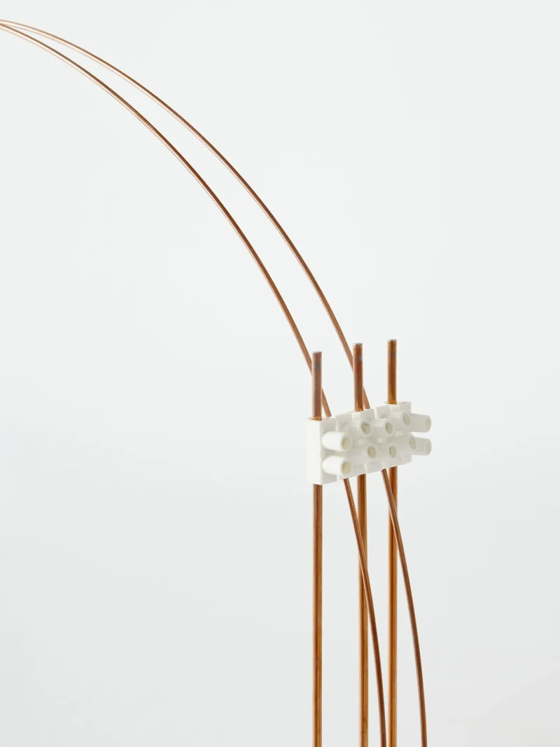 B.A.R.E ‘Single Curved’ Floor Lamp is a piece that forms part of the serie Brick, Appliances, Rods and Electricity (B.A.R.E). This collection of lamps is produced with bricks or tiles on the bases, from which iron rod structures and electric quick connectors grow to bring the light to the lamp. With these simple systems, Lucas Muñoz Muñoz creates lighting elements that are easy to produce and have a low cost. This is why they are manufactured by the students of the Asociación Norte Joven in their electricity module / workshop, thus adding the designer a social bias to the project.